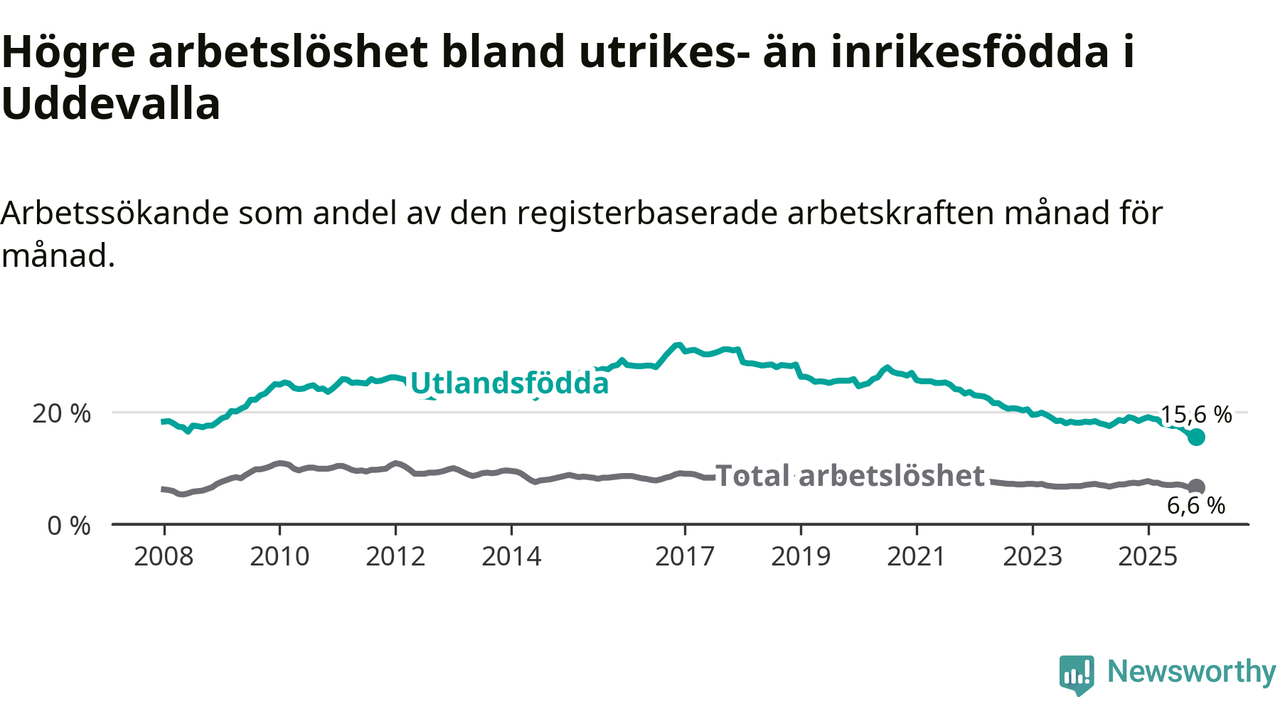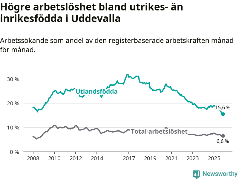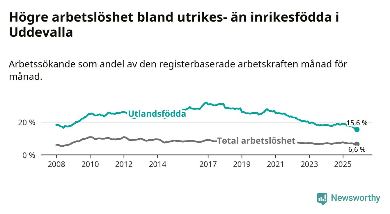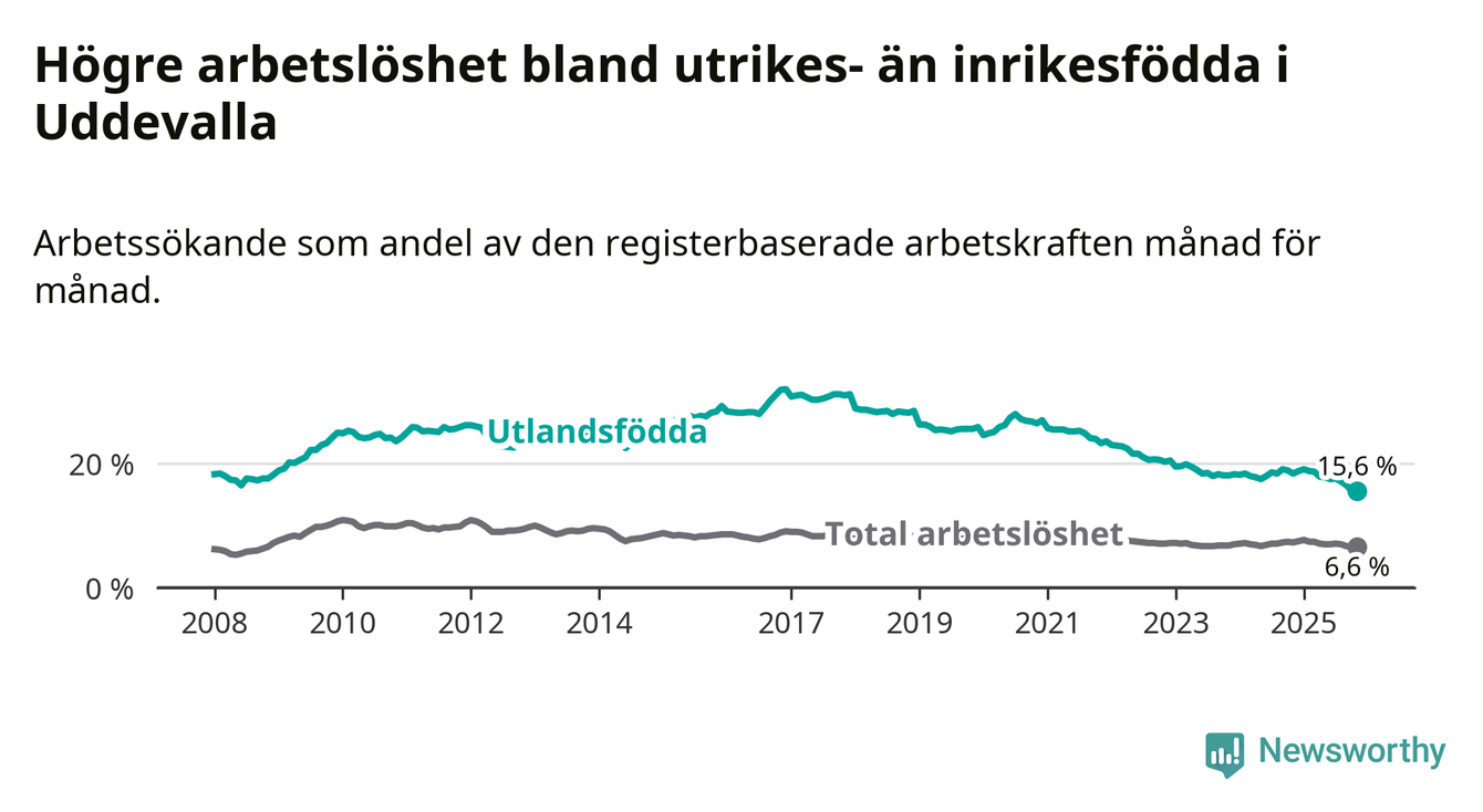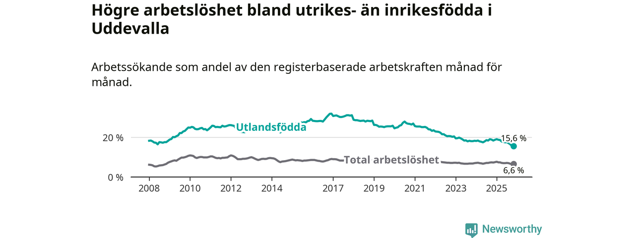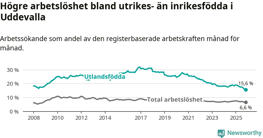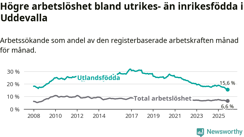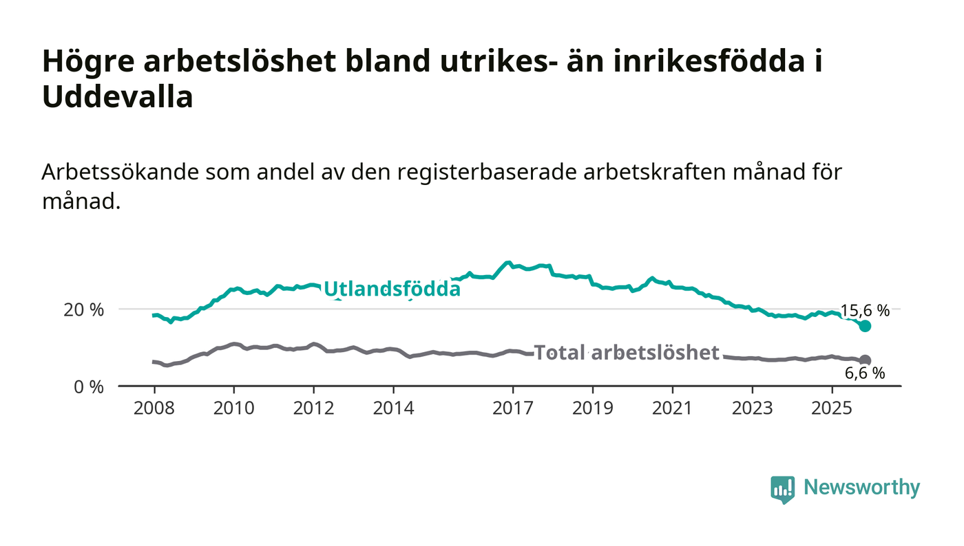 Arbetslösheten bland utlandsfödda var 15,6 procent i Uddevalla under november månad, motsvarande 963 av 6 173 personer. Det är 2,8 procentenheter färre än vid samma tidpunkt i fjol (−167 om man räknar personer). Därmed är de utlandsföddas arbetslöshet lägre än vid samma tidpunkt i fjol för sjätte månaden i följd. Sedan maj har arbetslösheten bland utlandsfödda minskat från 17,8 till 15,6 procent.