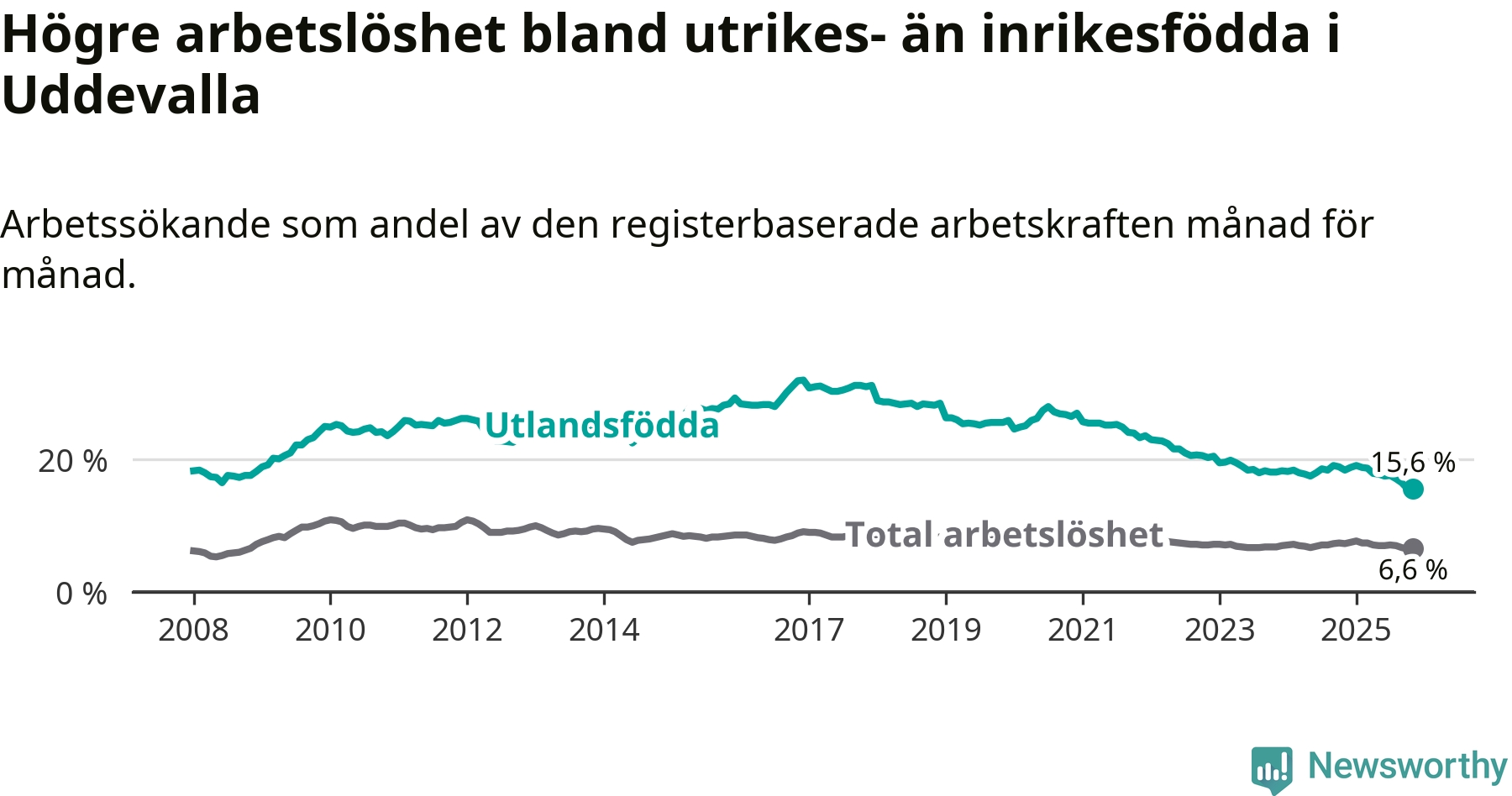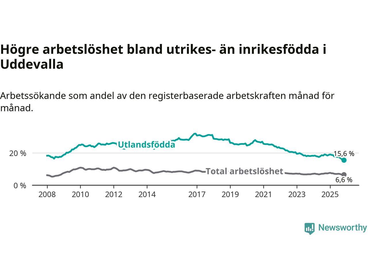 | Bland utlandsfödda | 15,6 % | −2,8 % ▼ | 13,4 % | −0,8 % ▼ | 14,3 % | −1,1 % ▼ |