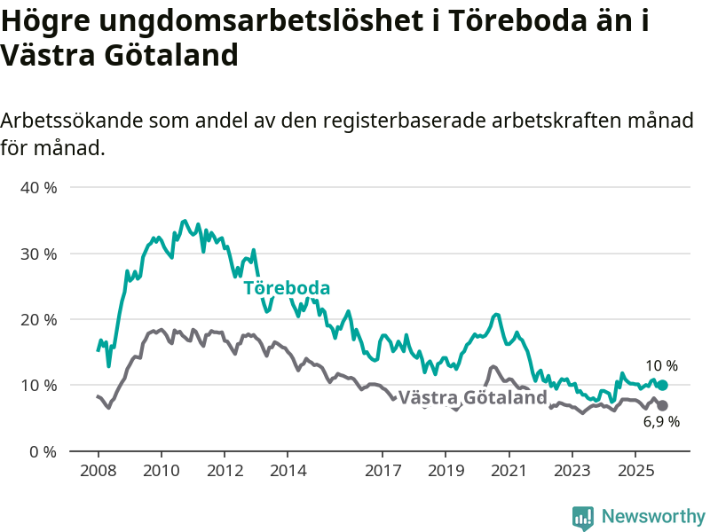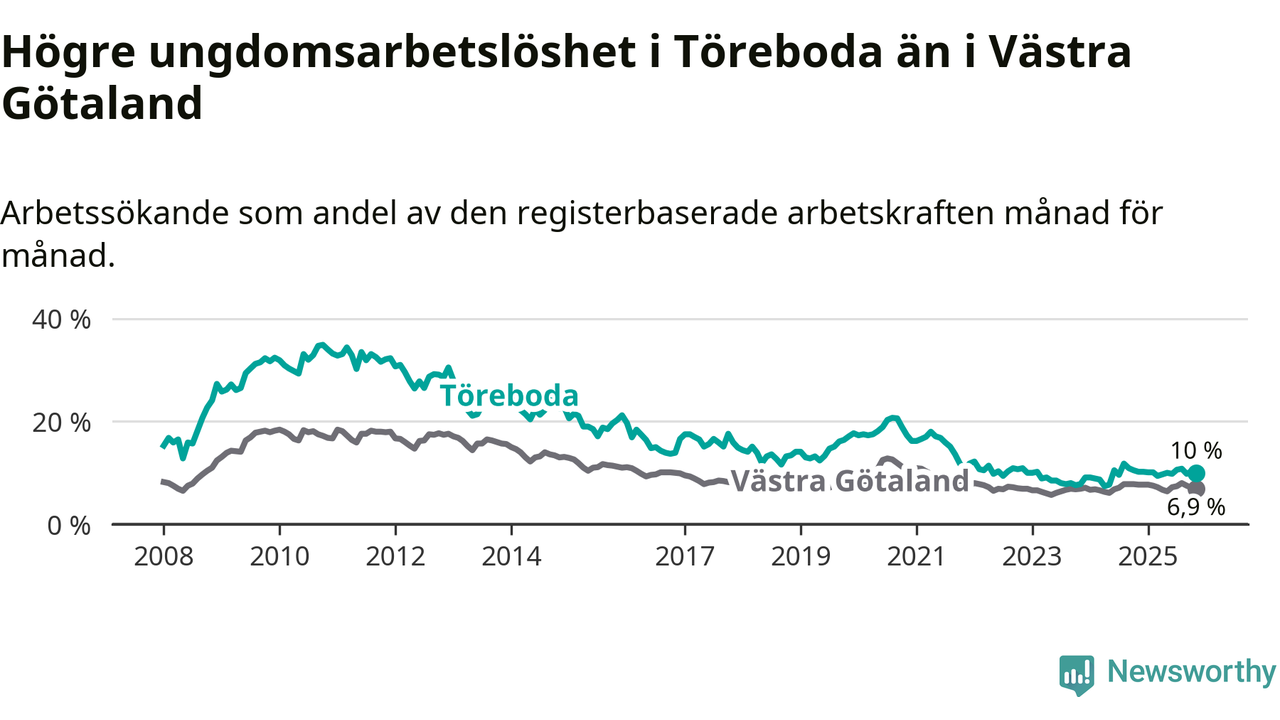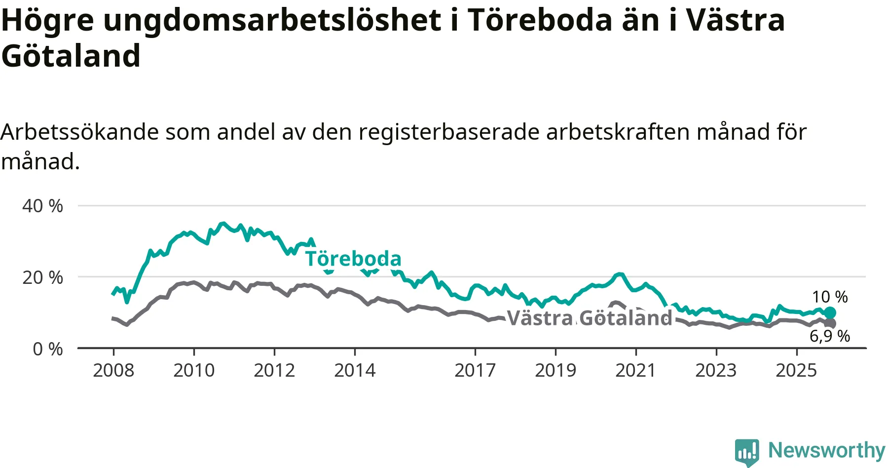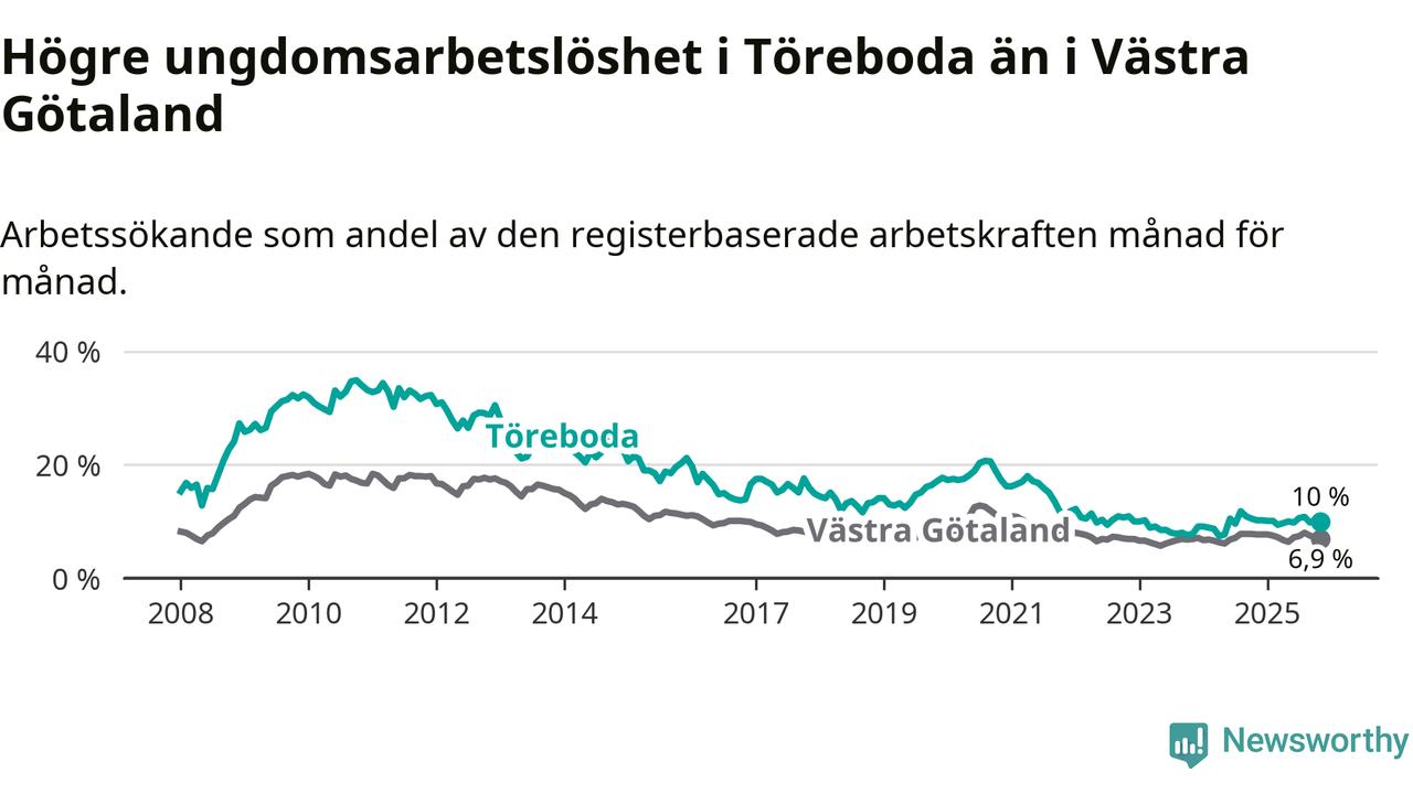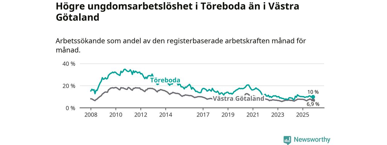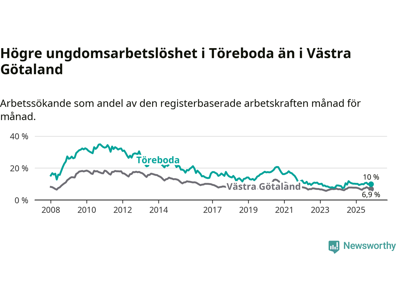 Precis som den totala arbetslösheten ligger ungdomsarbetslösheten i Töreboda högre än i Västra Götaland som helhet. Skillnaden mellan kommunen och länet är 3,1 procentenheter.