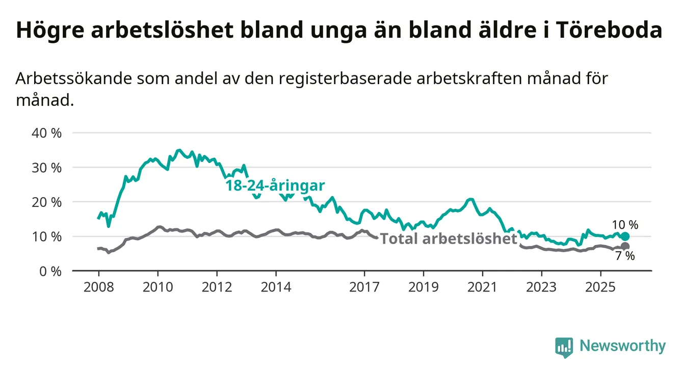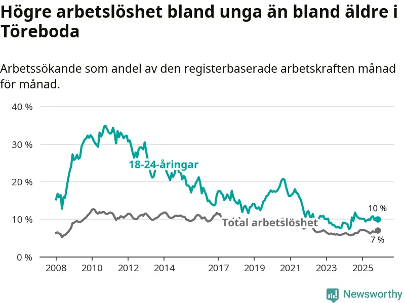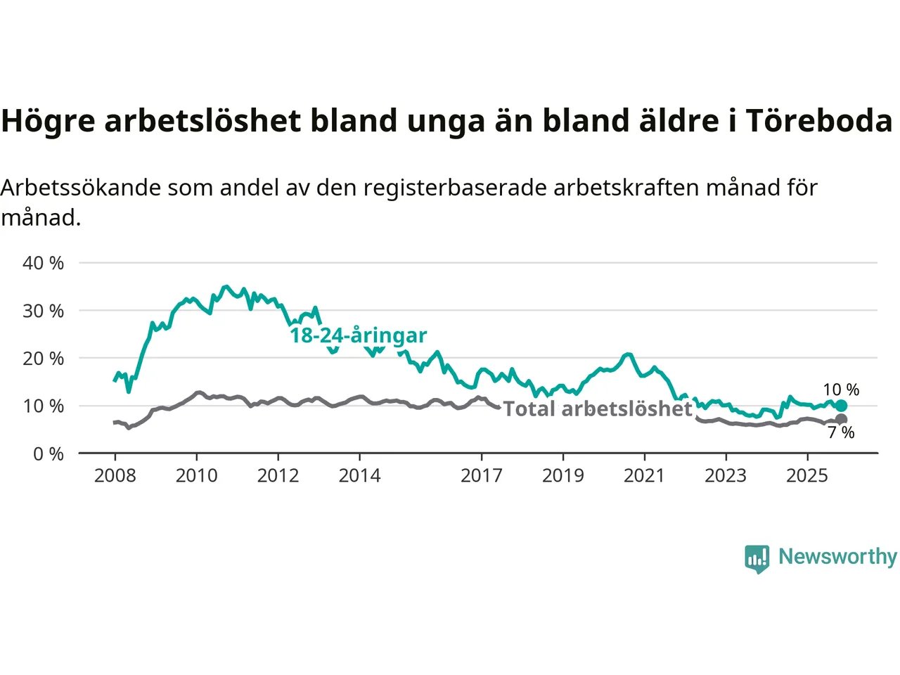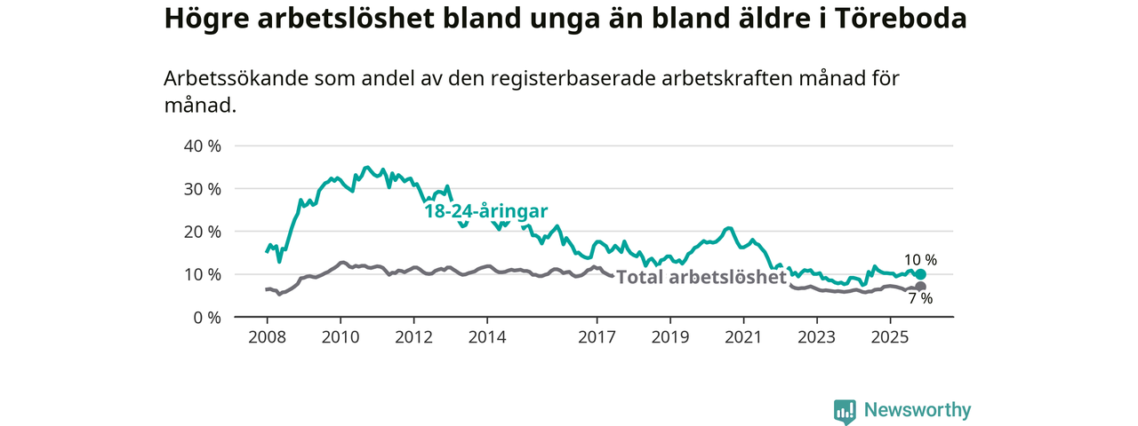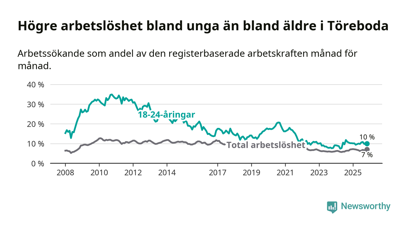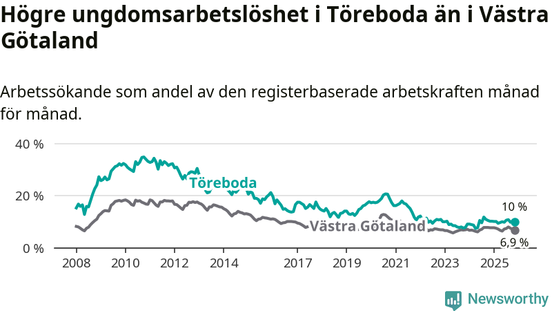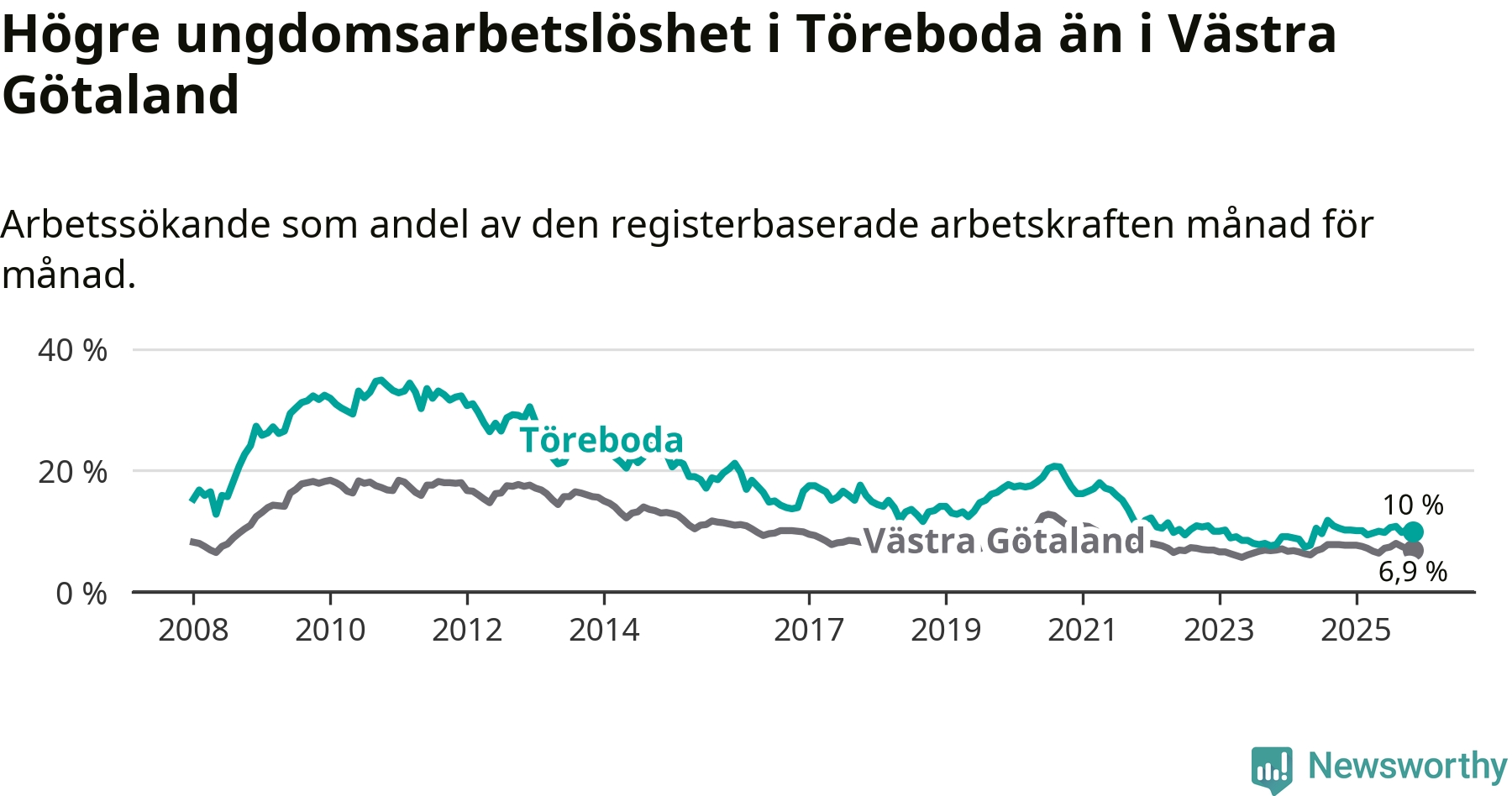 Precis som den totala arbetslösheten ligger ungdomsarbetslösheten i Töreboda högre än i Västra Götaland som helhet. Skillnaden mellan kommunen och länet är 3,1 procentenheter.