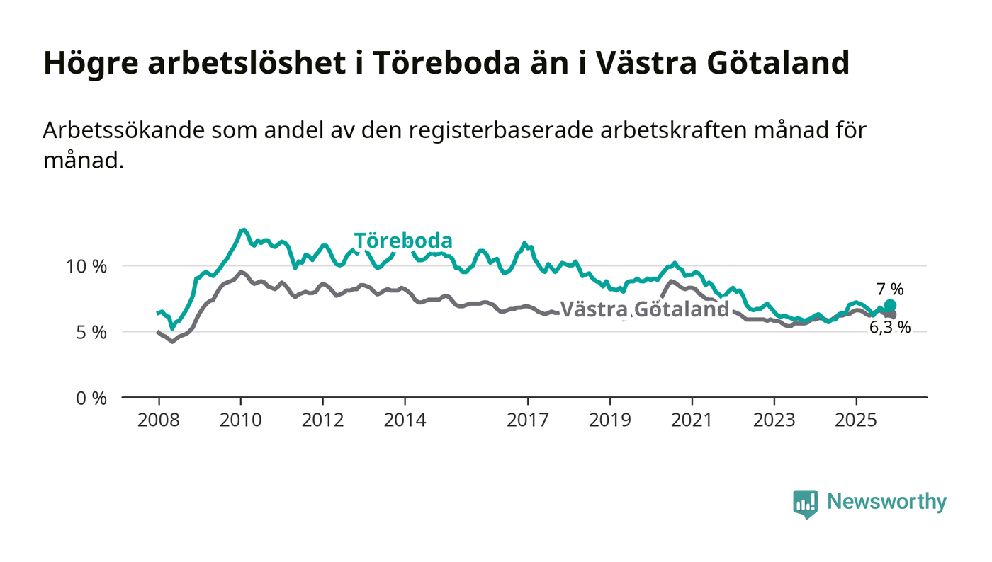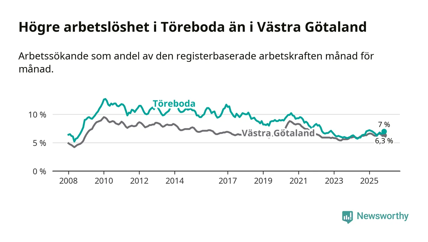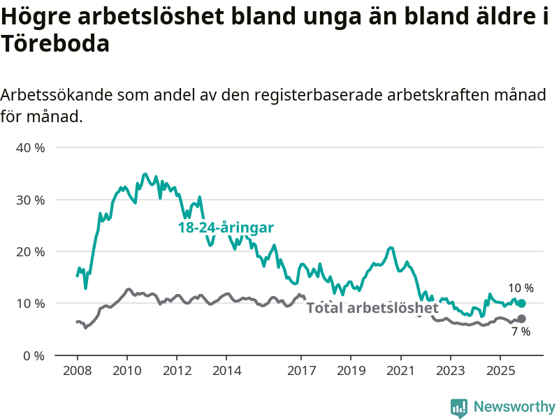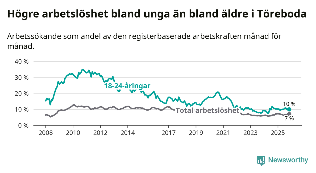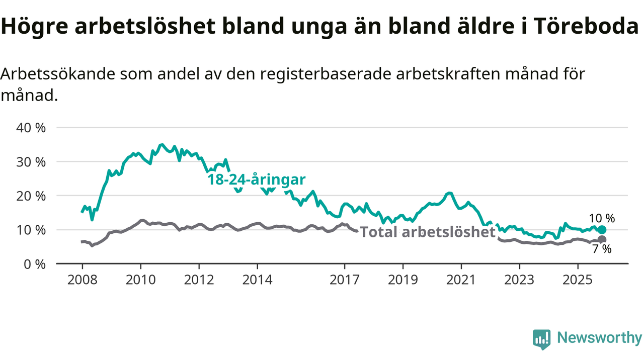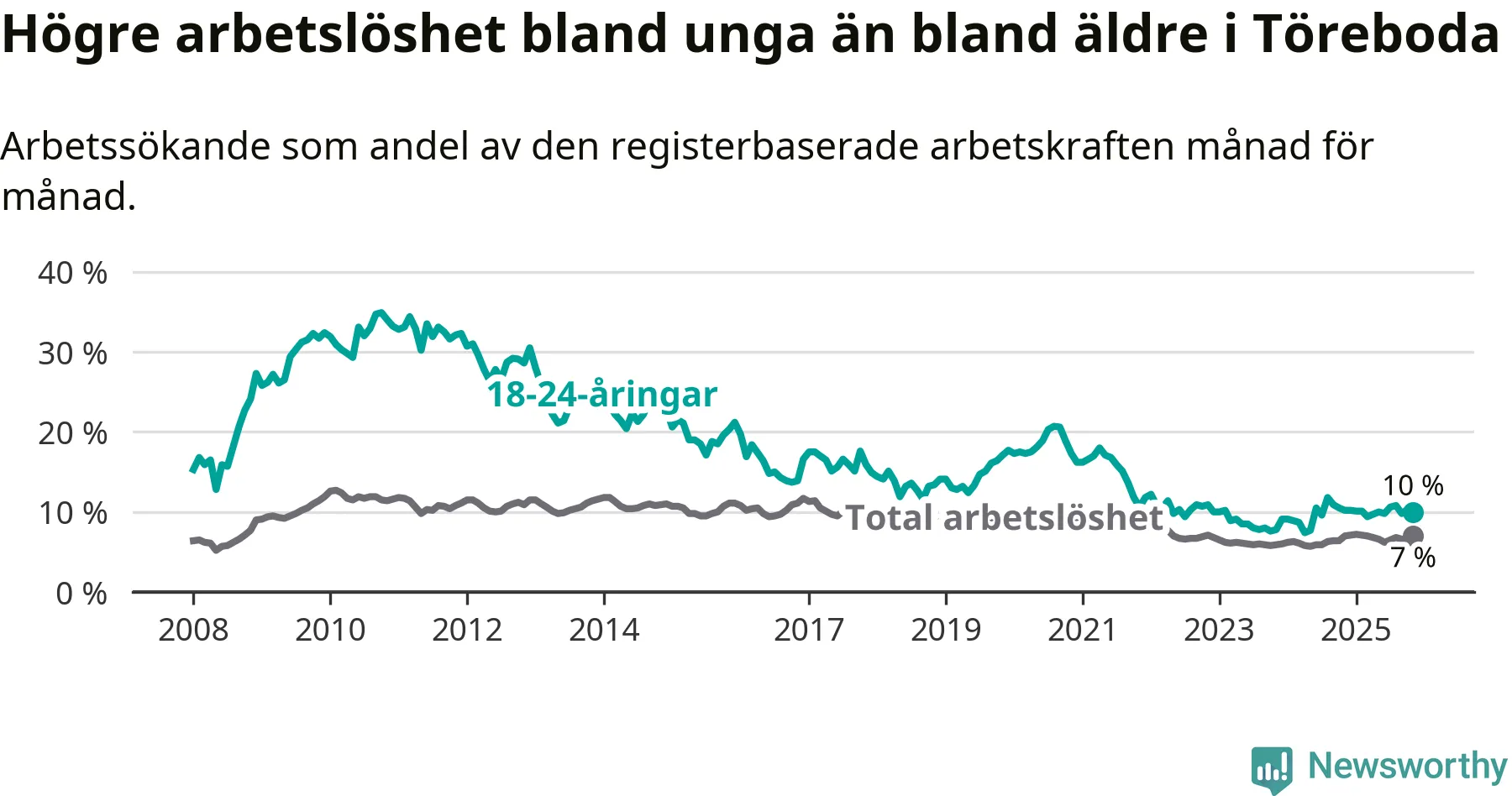 Precis som den totala arbetslösheten ligger ungdomsarbetslösheten i Töreboda högre än i Västra Götaland som helhet. Skillnaden mellan kommunen och länet är 3,1 procentenheter.
