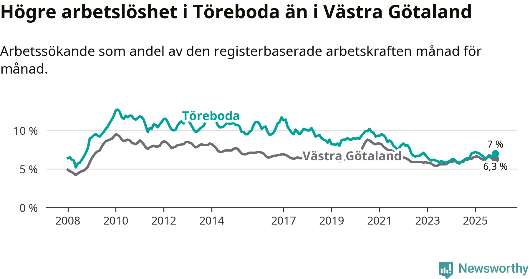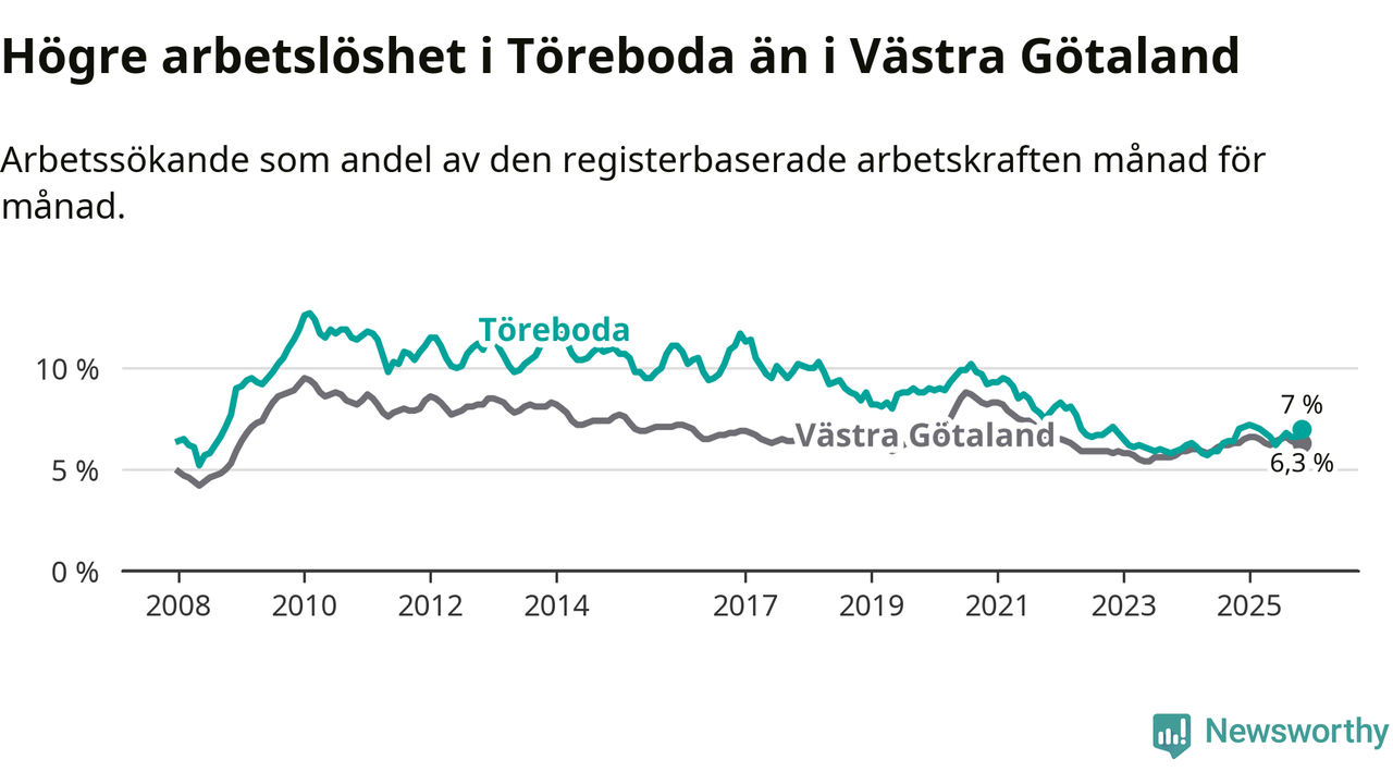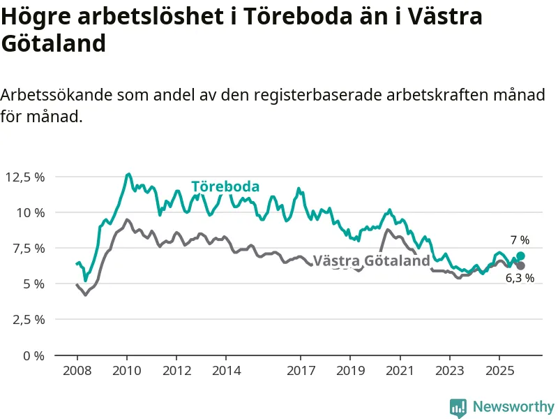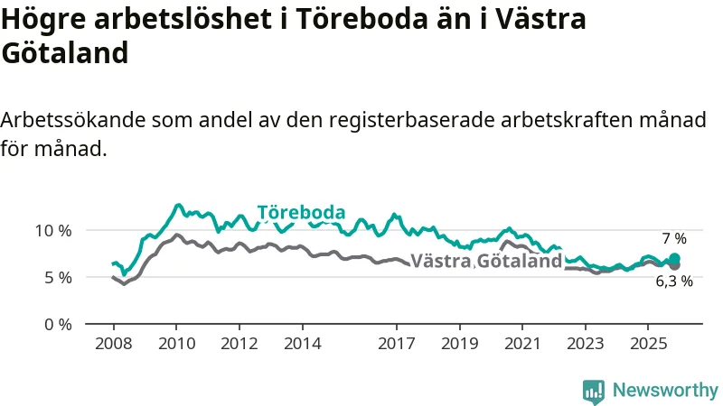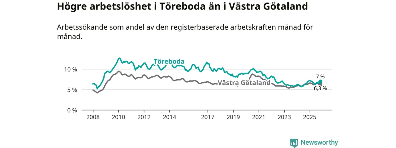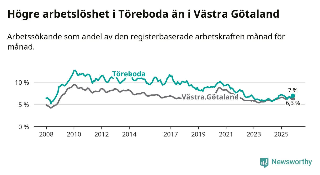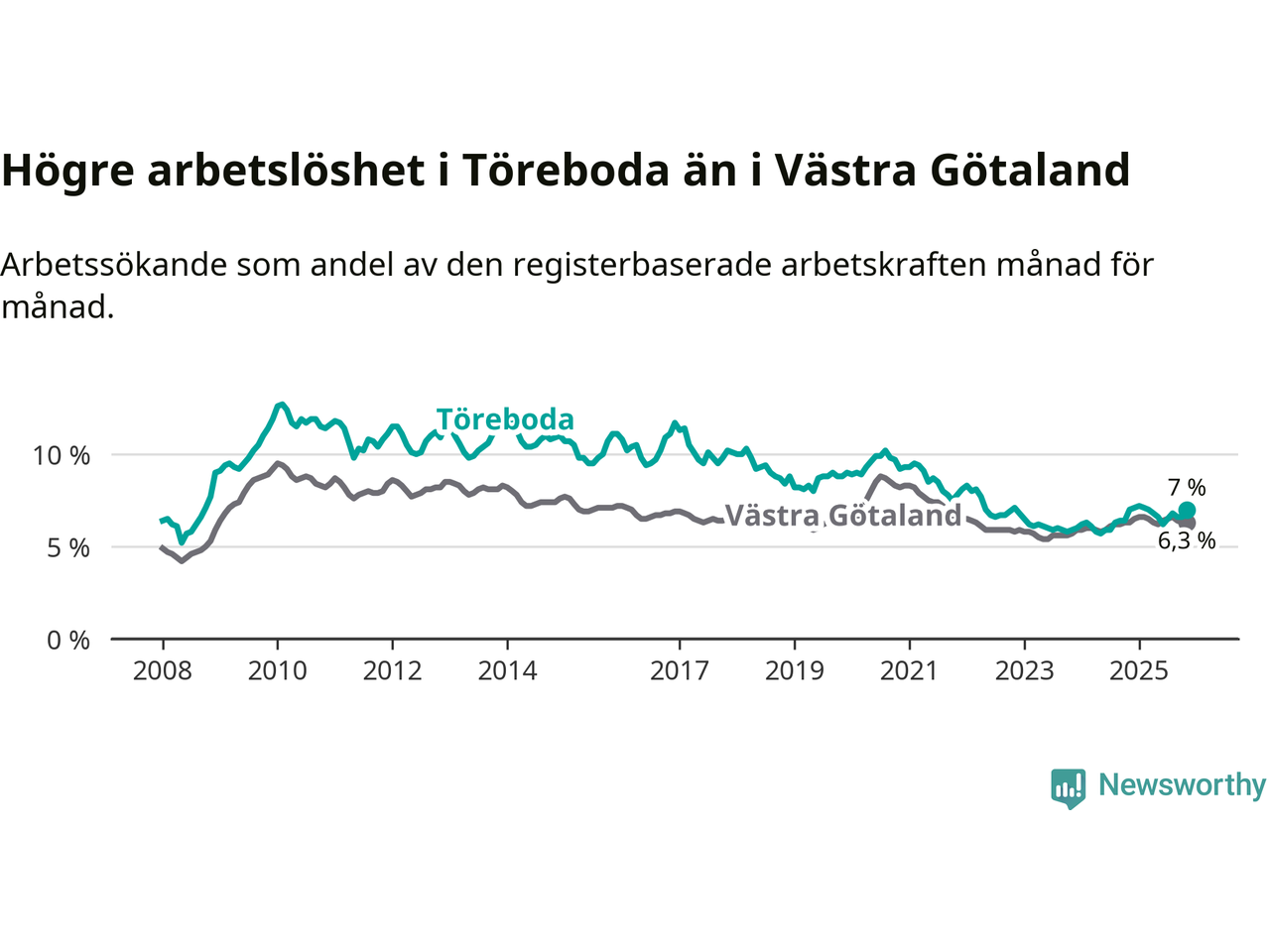 Precis som den totala arbetslösheten ligger ungdomsarbetslösheten i Töreboda högre än i Västra Götaland som helhet. Skillnaden mellan kommunen och länet är 3,1 procentenheter.