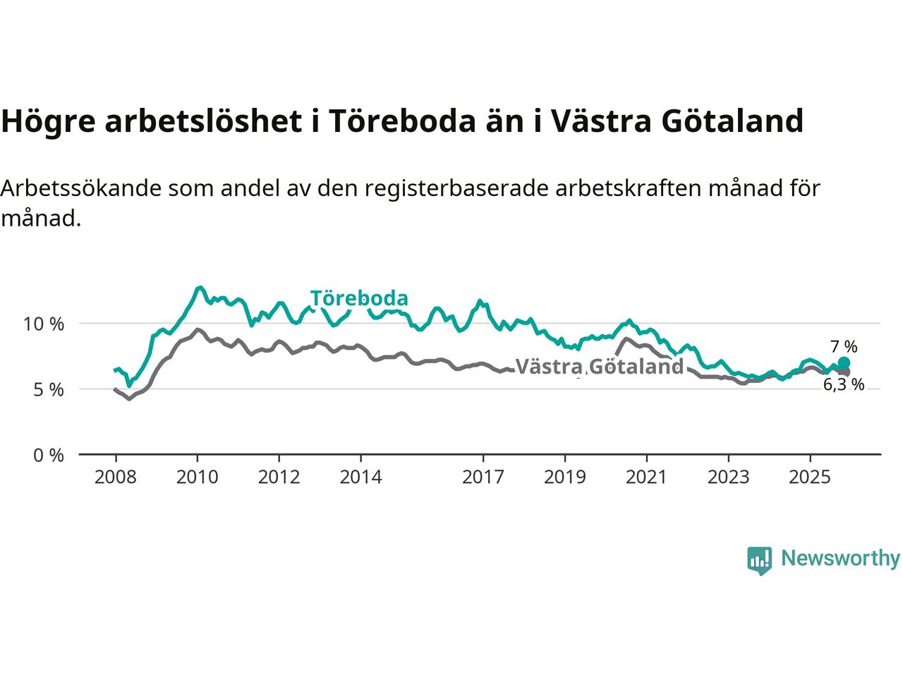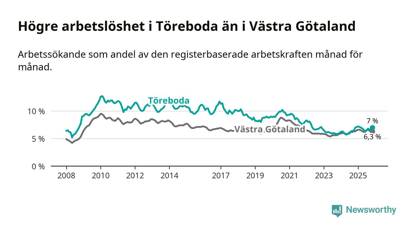 Arbetslösheten i Töreboda ligger över nivån i hela Västra Götalands län (7,0 procent i kommunen, jämfört med 6,3 procent i hela länet). Öckerö har den lägsta arbetslösheten i länet (2,9 procent), medan Gullspång har den högsta (8,6 procent). För att Töreboda skulle komma ner i samma arbetslöshetsnivå som Öckerö skulle 165 personer behöva sysselsättas.