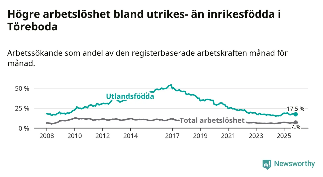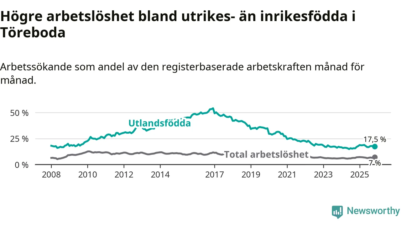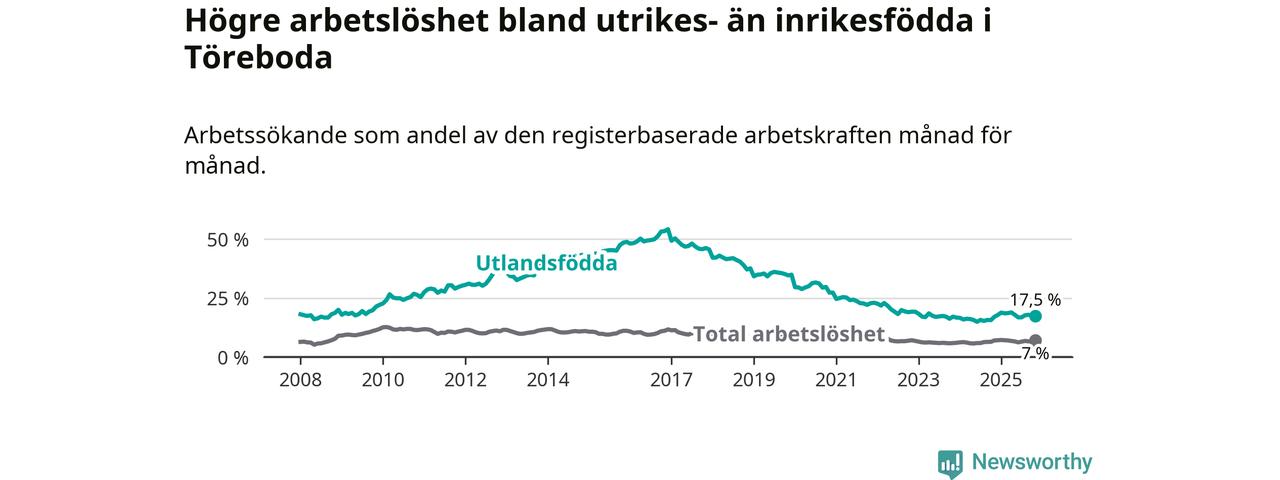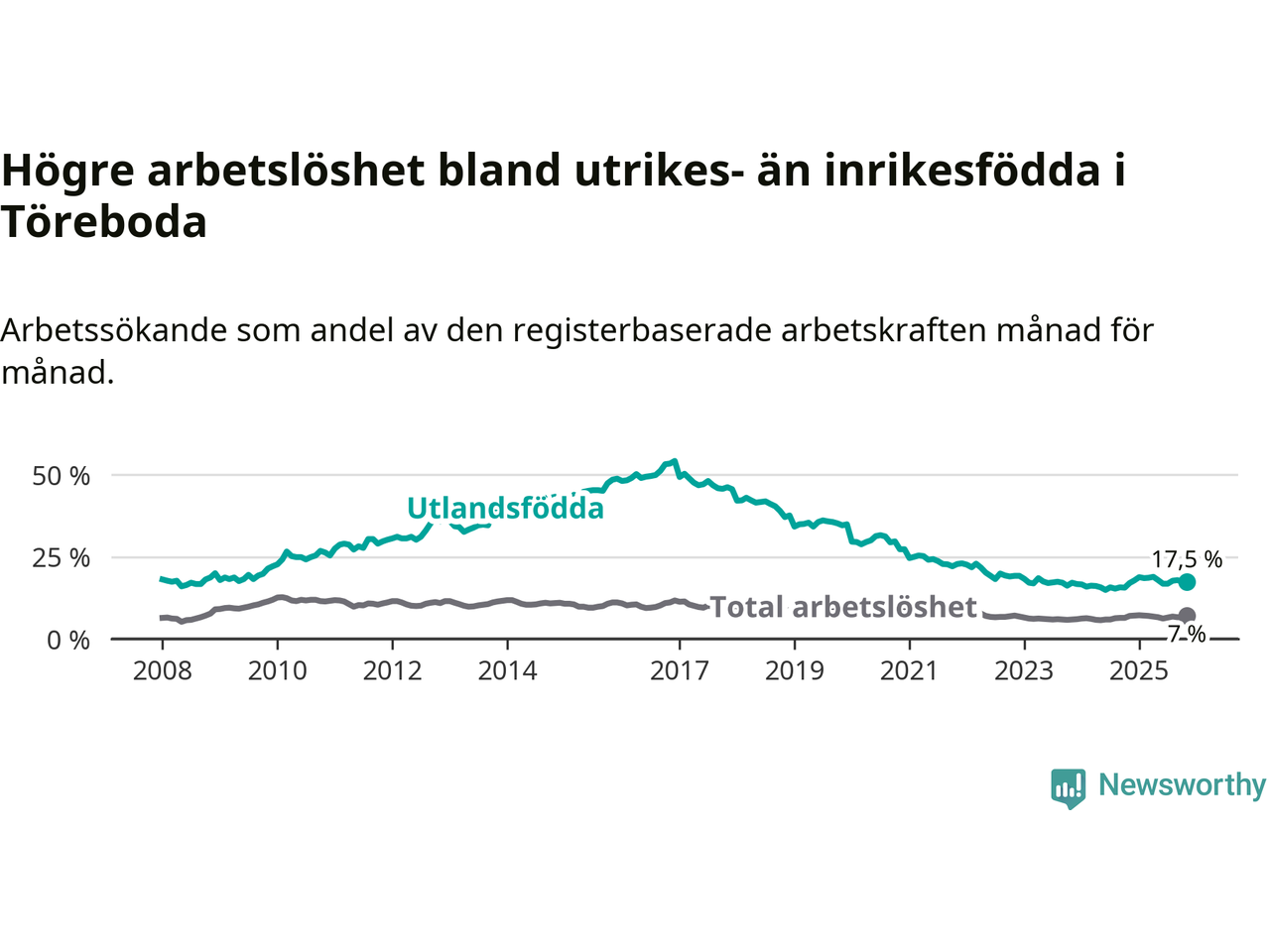 Arbetslösheten bland utlandsfödda var 17,5 procent i Töreboda under november månad, motsvarande 114 av 651 personer. Det är 0,5 procentenheter fler än vid samma tidpunkt i fjol (+2 om man räknar personer). Därmed är de utlandsföddas arbetslöshet högre än vid samma tidpunkt i fjol för tolfte månaden i följd.