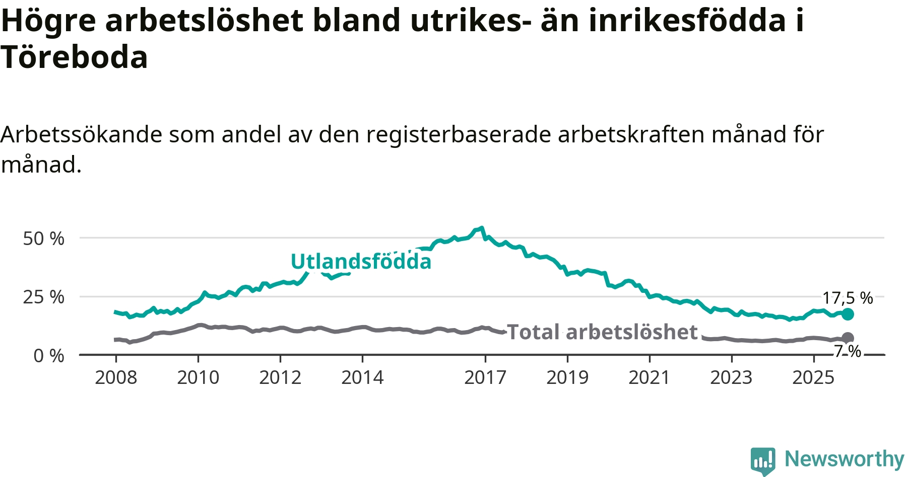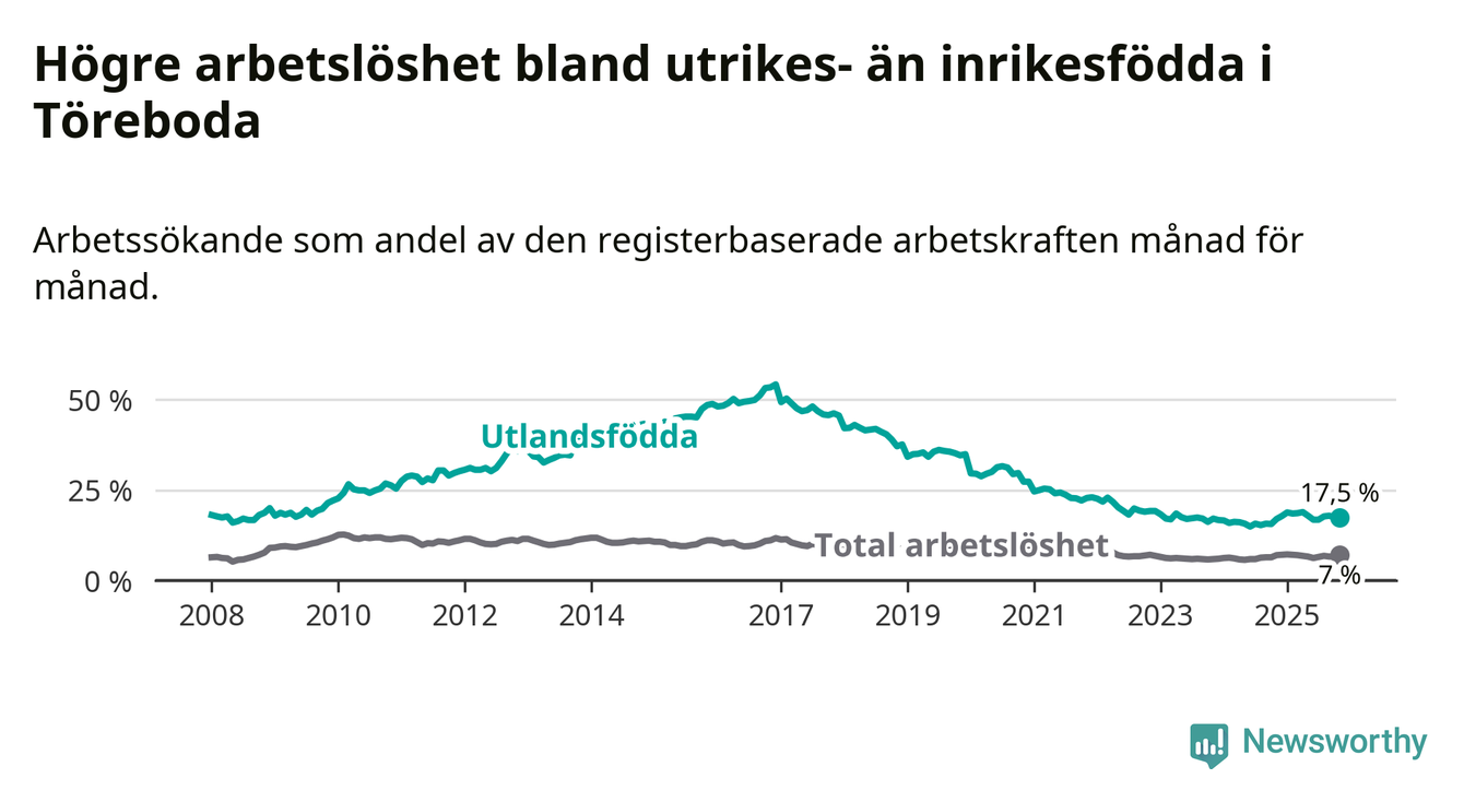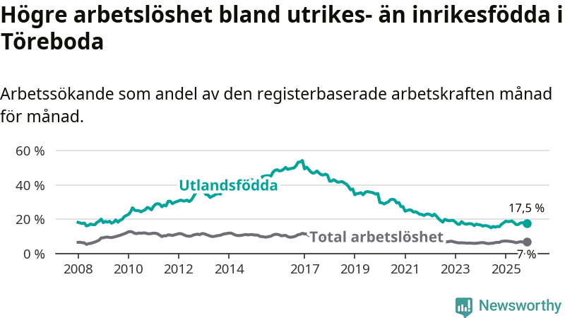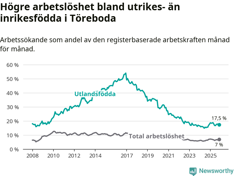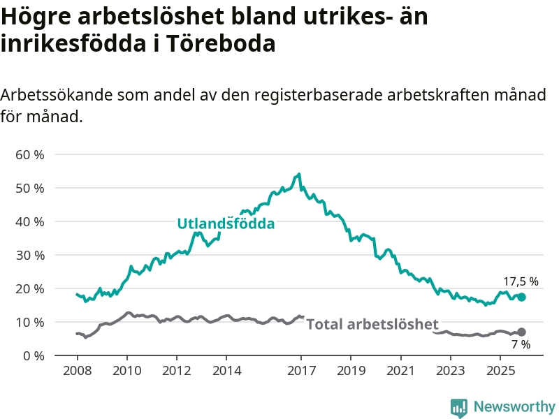 Arbetslösheten bland utlandsfödda var 17,5 procent i Töreboda under november månad, motsvarande 114 av 651 personer. Det är 0,5 procentenheter fler än vid samma tidpunkt i fjol (+2 om man räknar personer). Därmed är de utlandsföddas arbetslöshet högre än vid samma tidpunkt i fjol för tolfte månaden i följd.