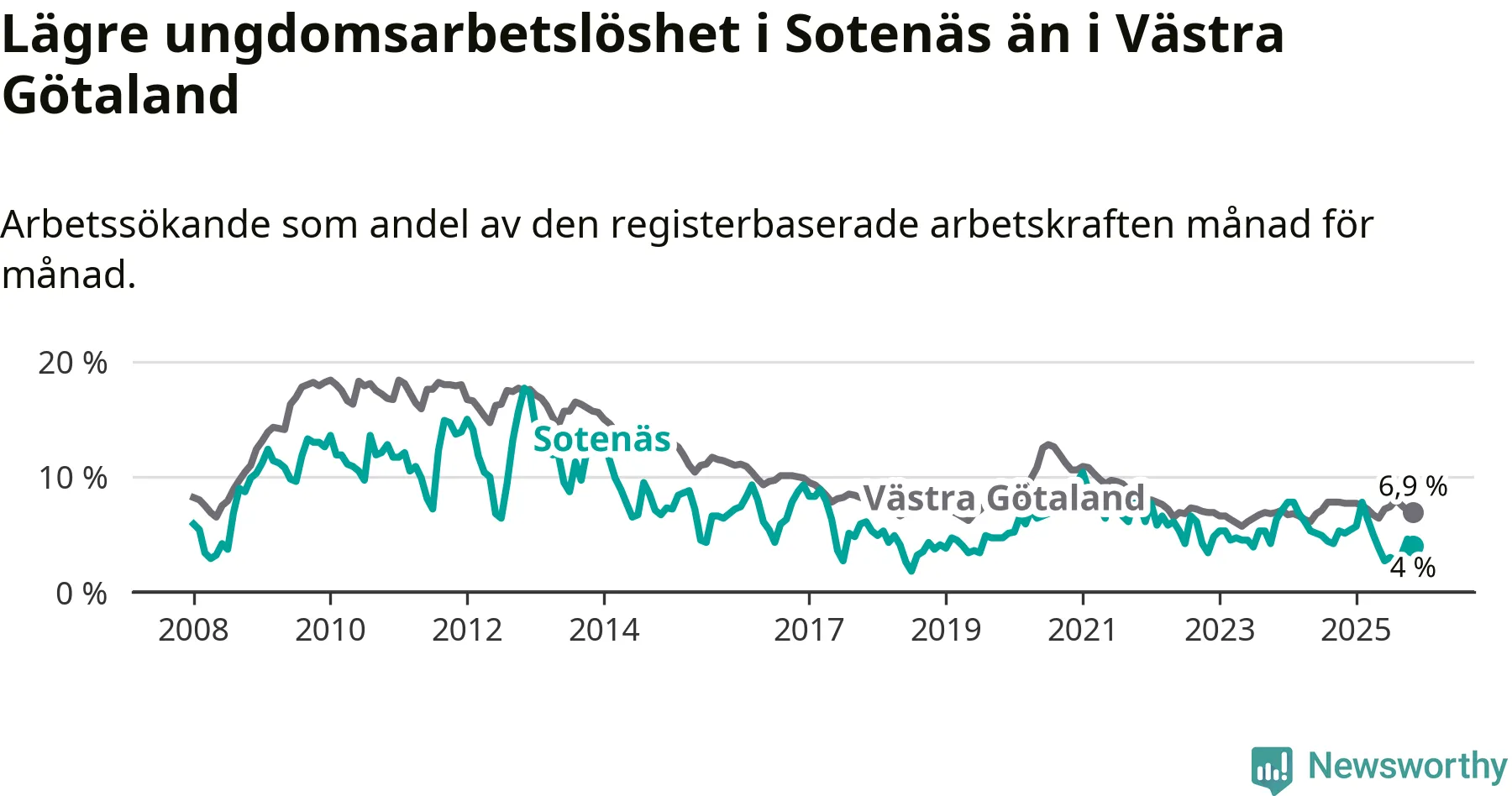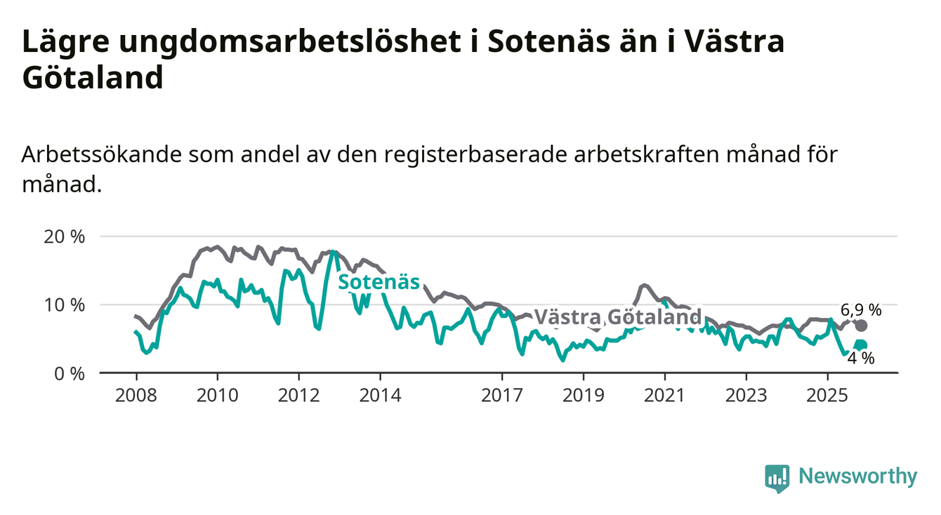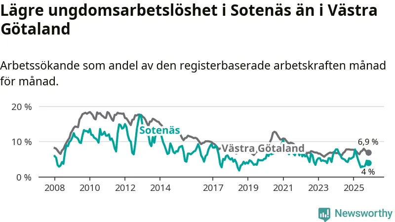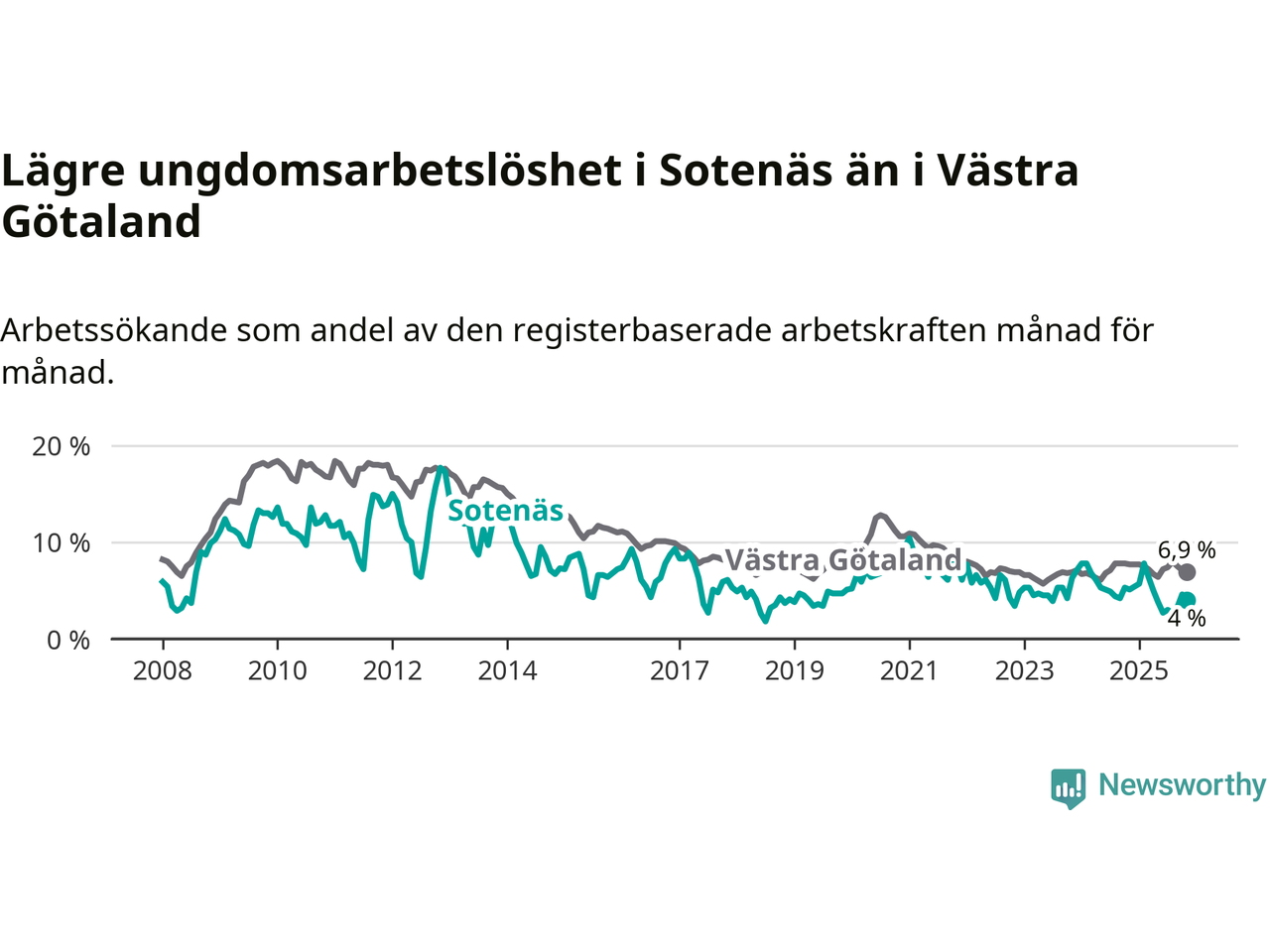 Precis som den totala arbetslösheten ligger ungdomsarbetslösheten i Sotenäs lägre än i Västra Götaland som helhet. Skillnaden mellan kommunen och länet är 2,9 procentenheter.