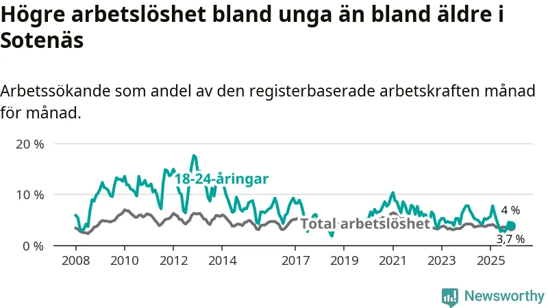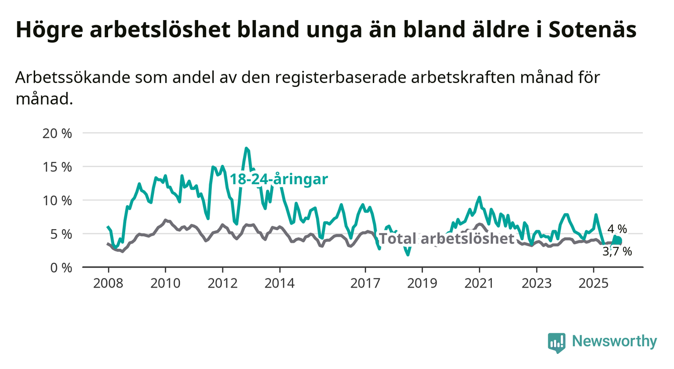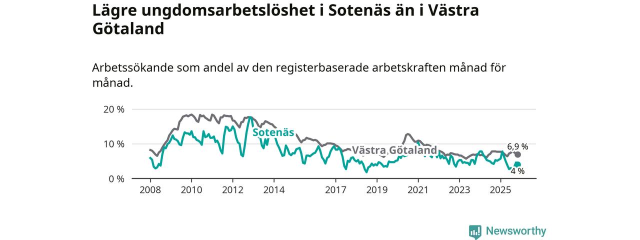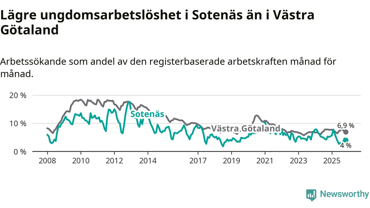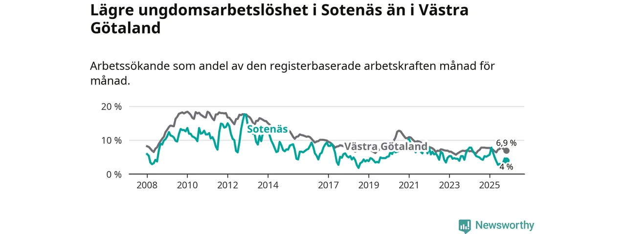 Precis som den totala arbetslösheten ligger ungdomsarbetslösheten i Sotenäs lägre än i Västra Götaland som helhet. Skillnaden mellan kommunen och länet är 2,9 procentenheter.