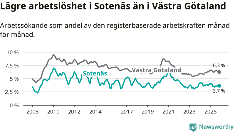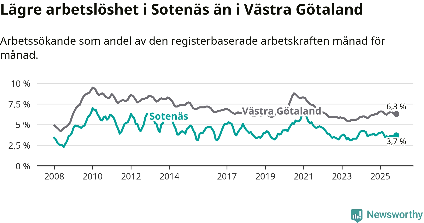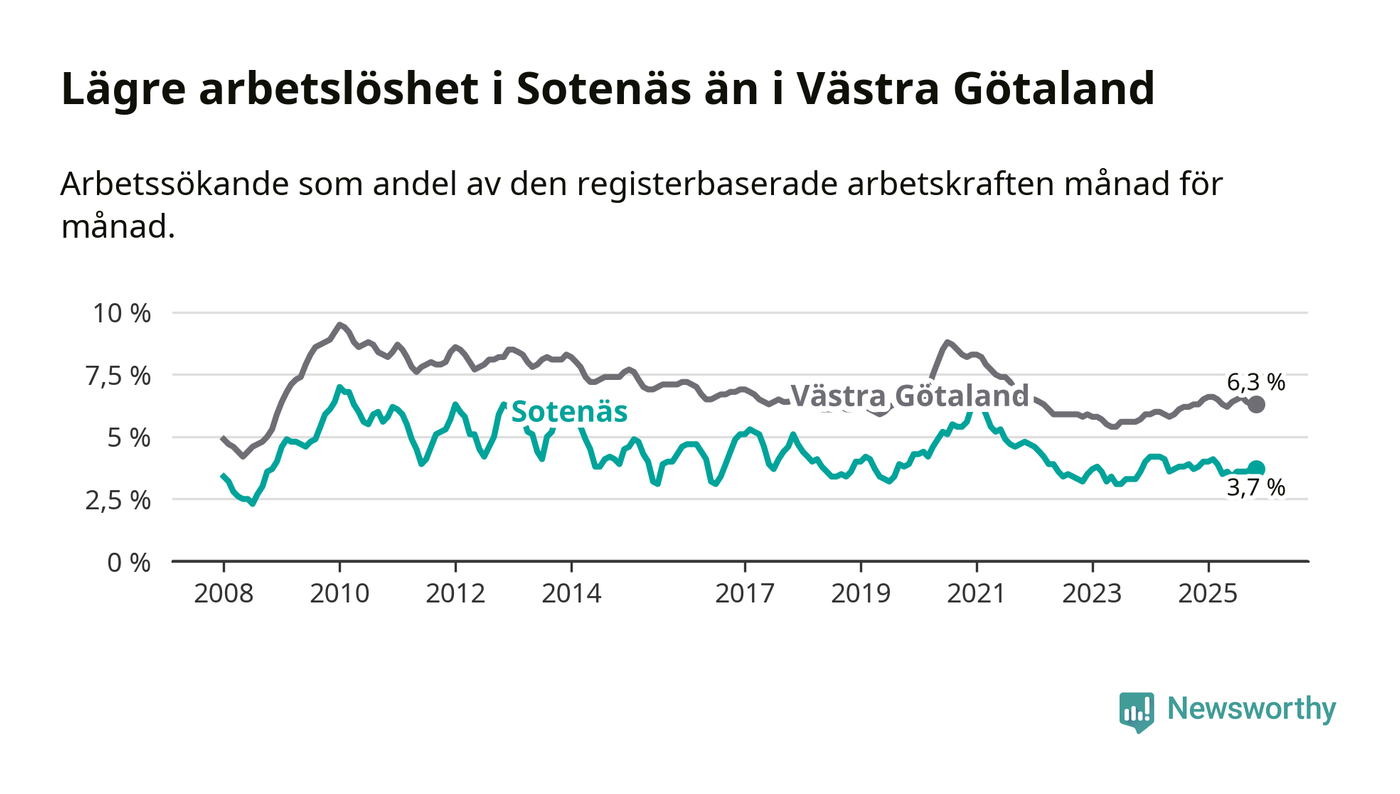 Sotenäs hade redan tidigare lägre arbetslöshet än snittet i hela Västra Götalands län och nu växer klyftan (3,7 procent i kommunen, jämfört med 6,3 procent i hela länet). Öckerö har den lägsta arbetslösheten i länet (2,9 procent), medan Gullspång har den högsta (8,6 procent). För att Sotenäs skulle komma ner i samma arbetslöshetsnivå som Öckerö skulle 32 personer behöva sysselsättas.