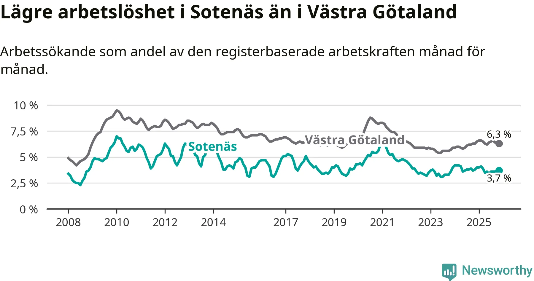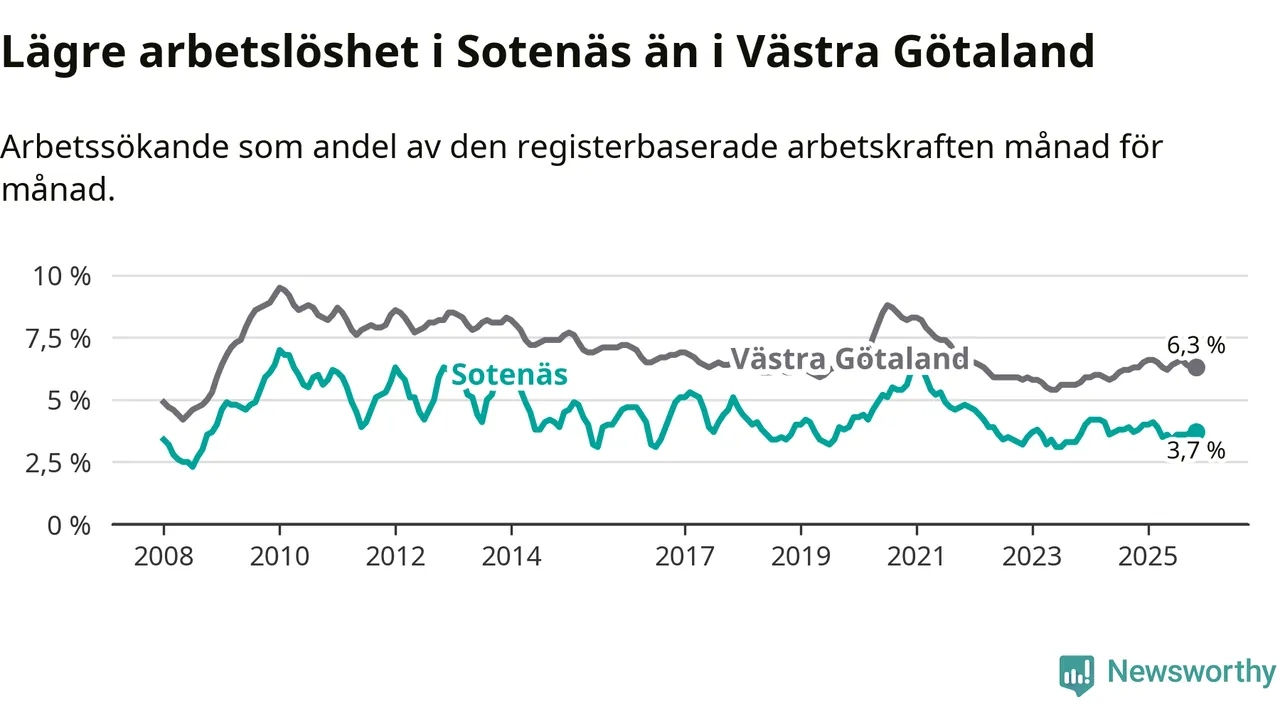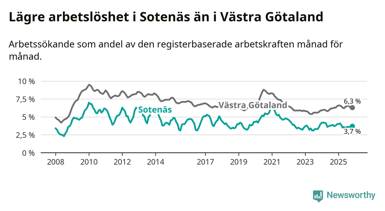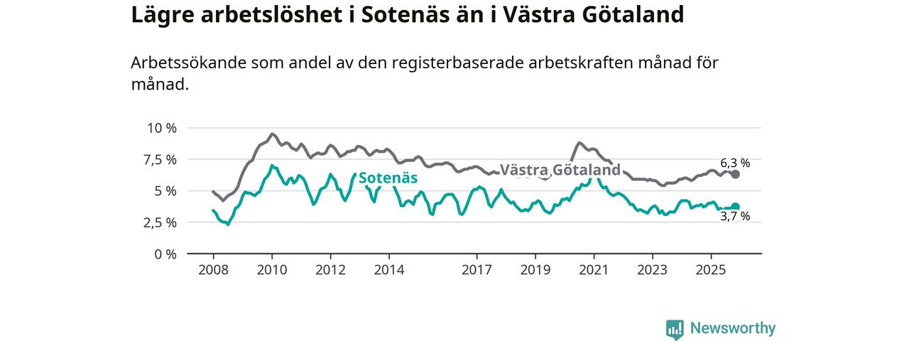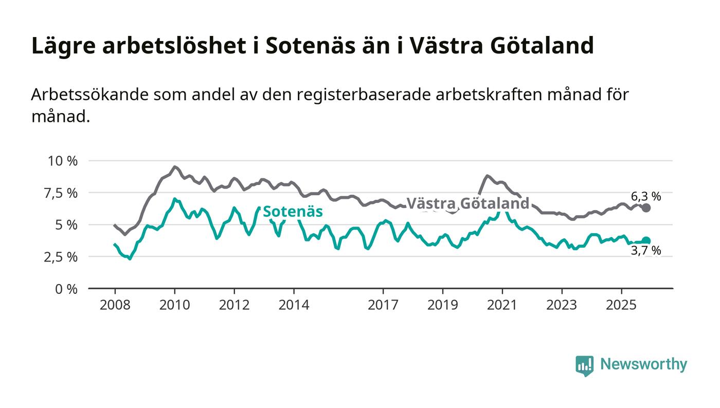 Under november månad rapporterade Sotenäs kommun en total arbetslöshet på 3,7 procent. Det är en minskning jämfört med samma tidpunkt i fjol (−0,1 procentenheter). I Västra Götalands län däremot står arbetslösheten stilla.