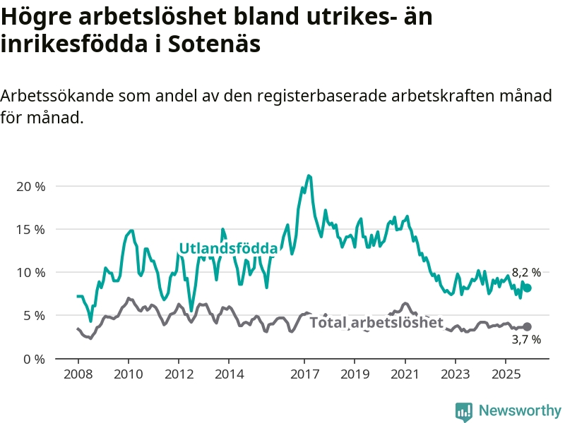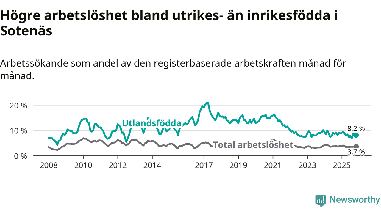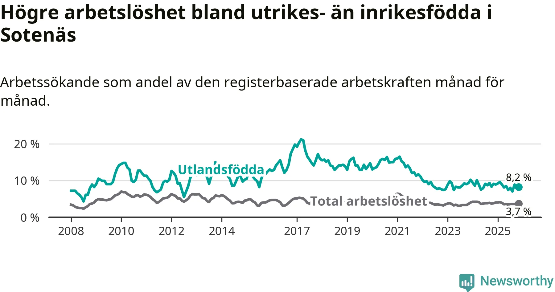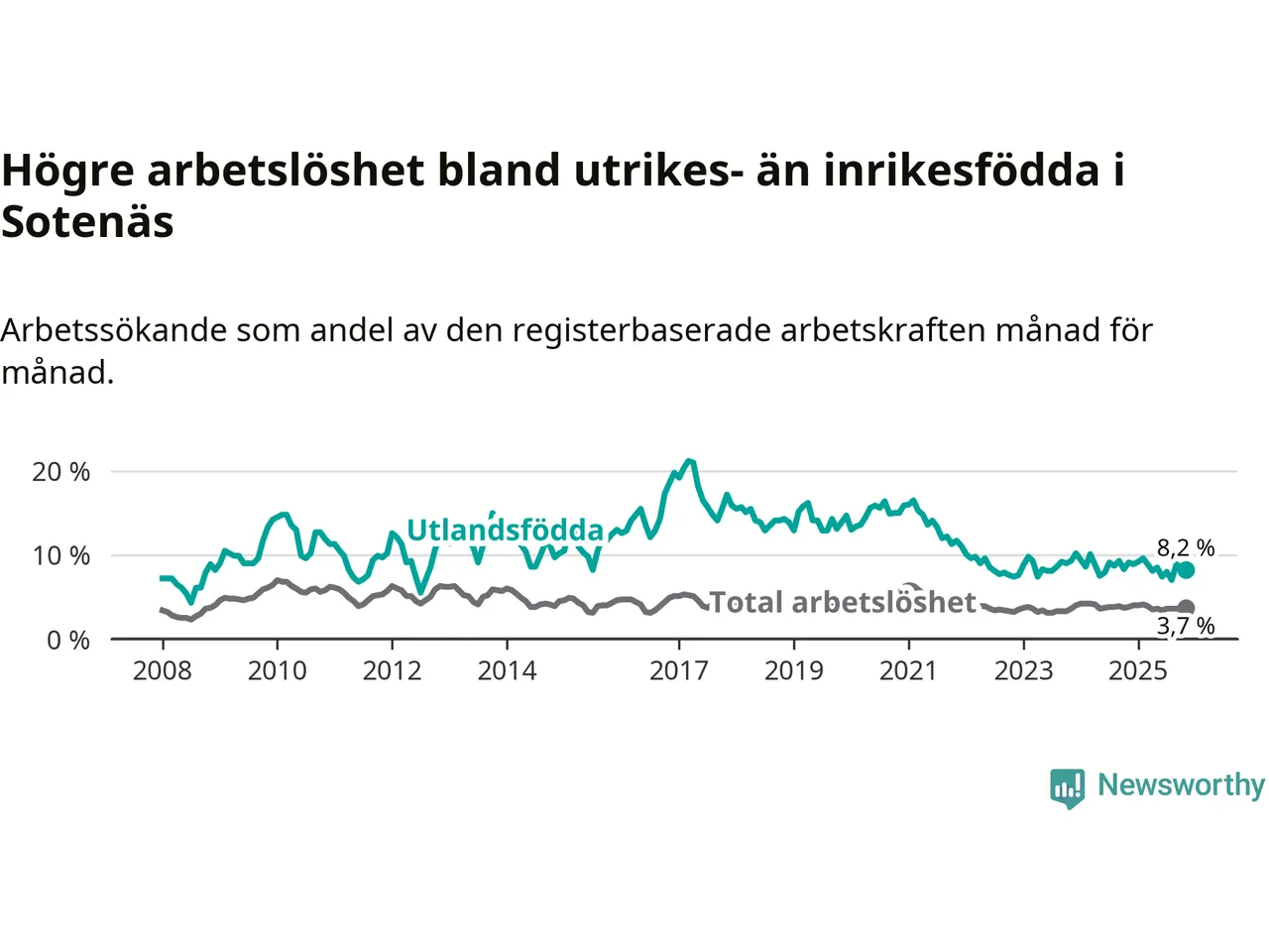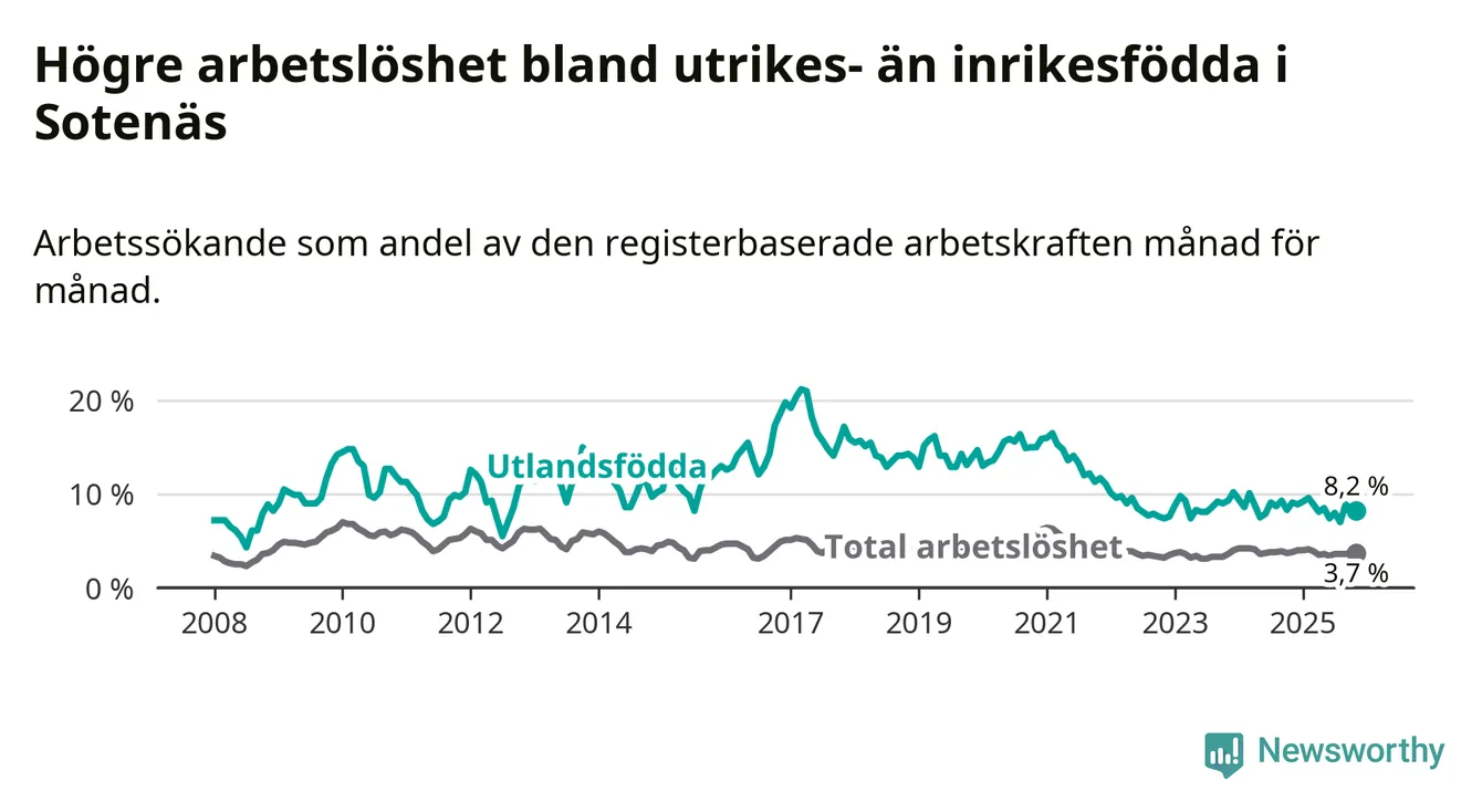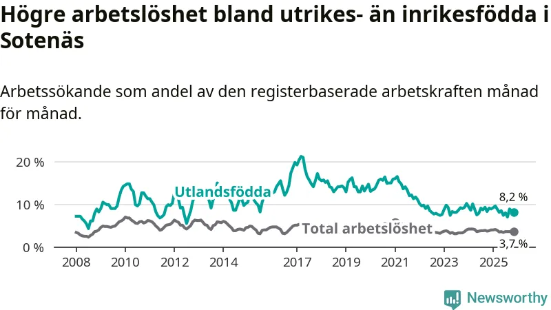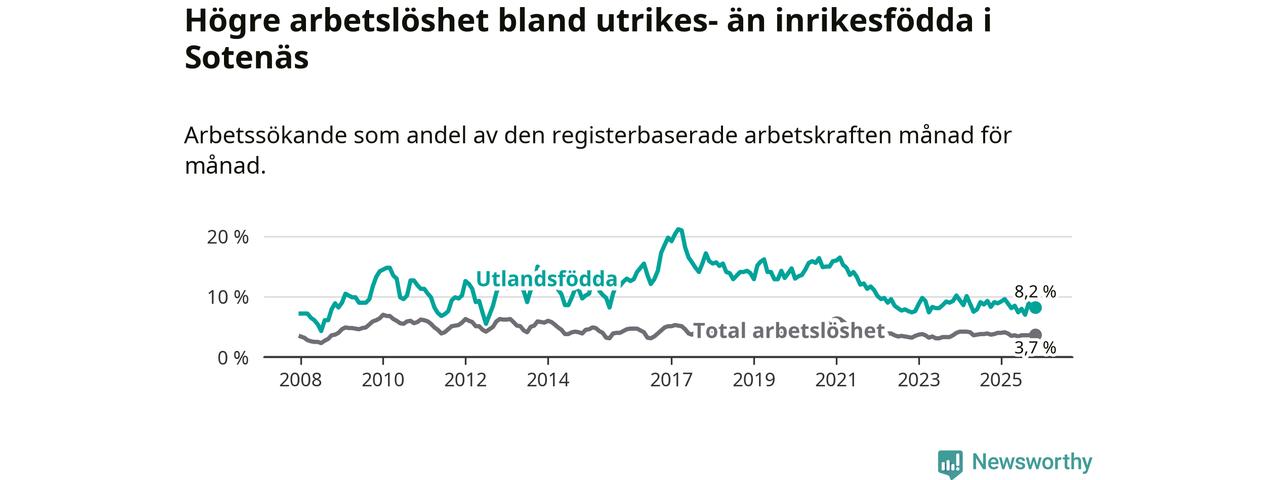 Skillnaden i arbetslöshet mellan utrikesfödda och hela befolkningen är 4,5 procentenheter i Sotenäs. Det är en mindre skillnad än för ett år sedan (−0,8 procentenheter).