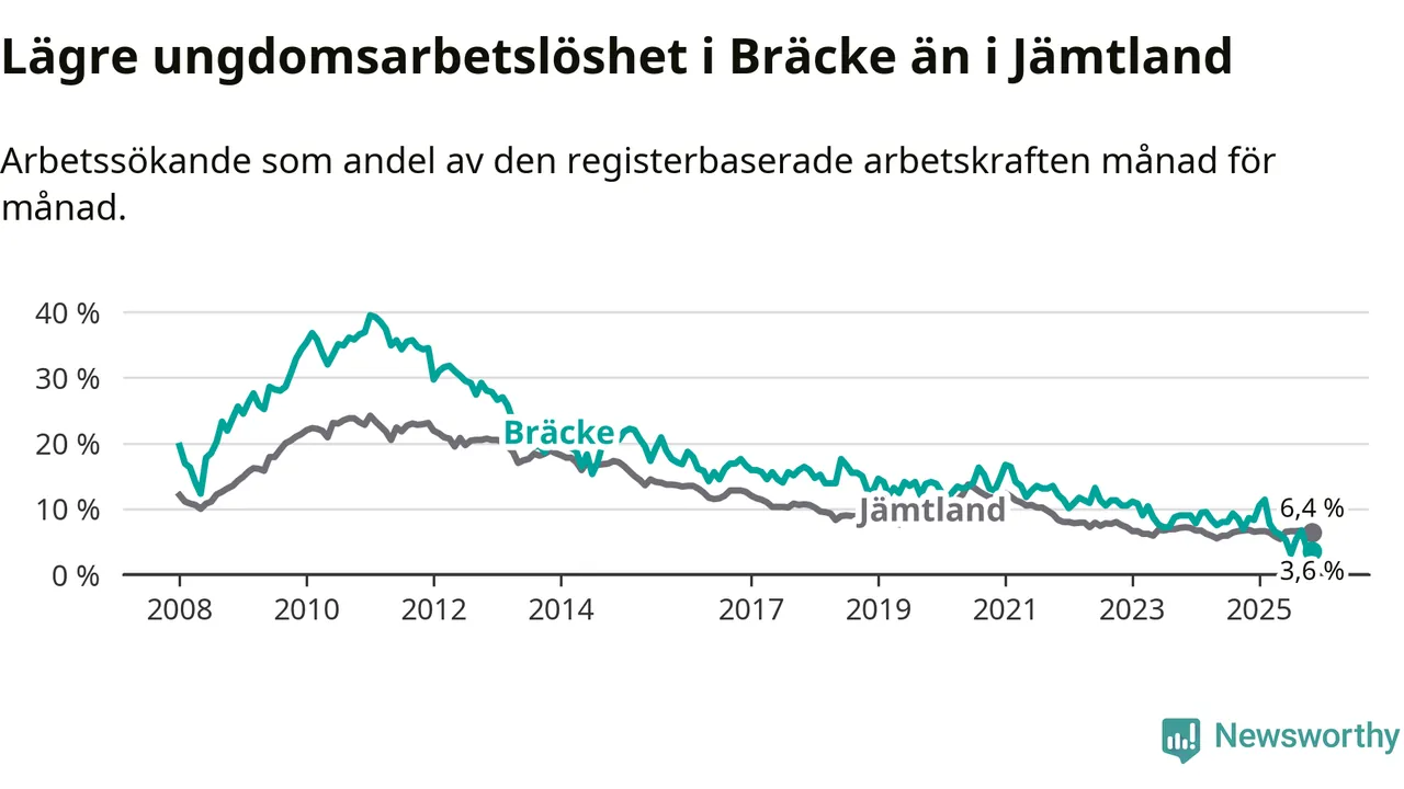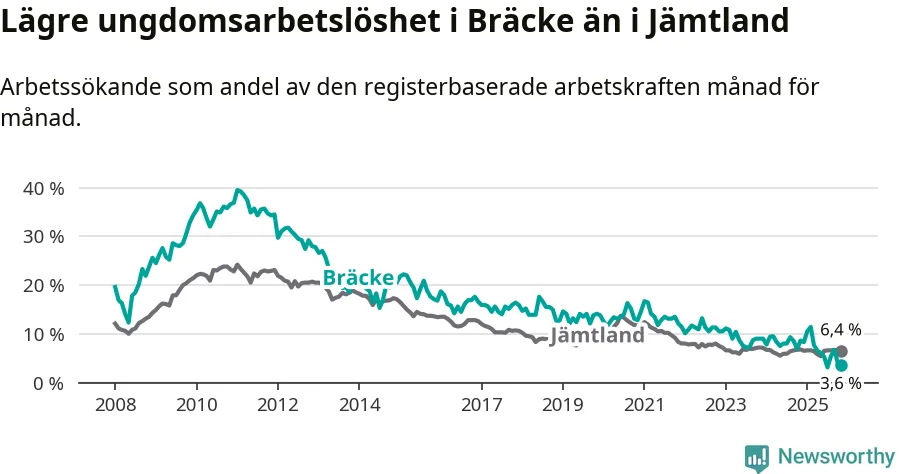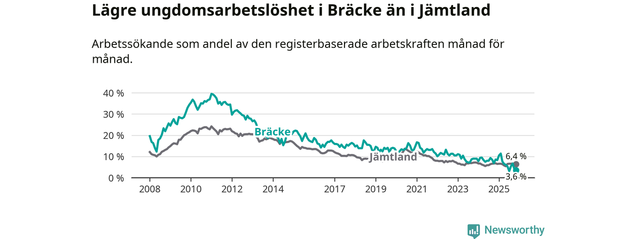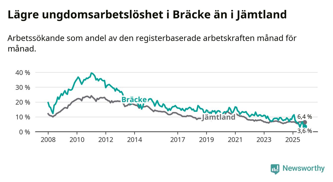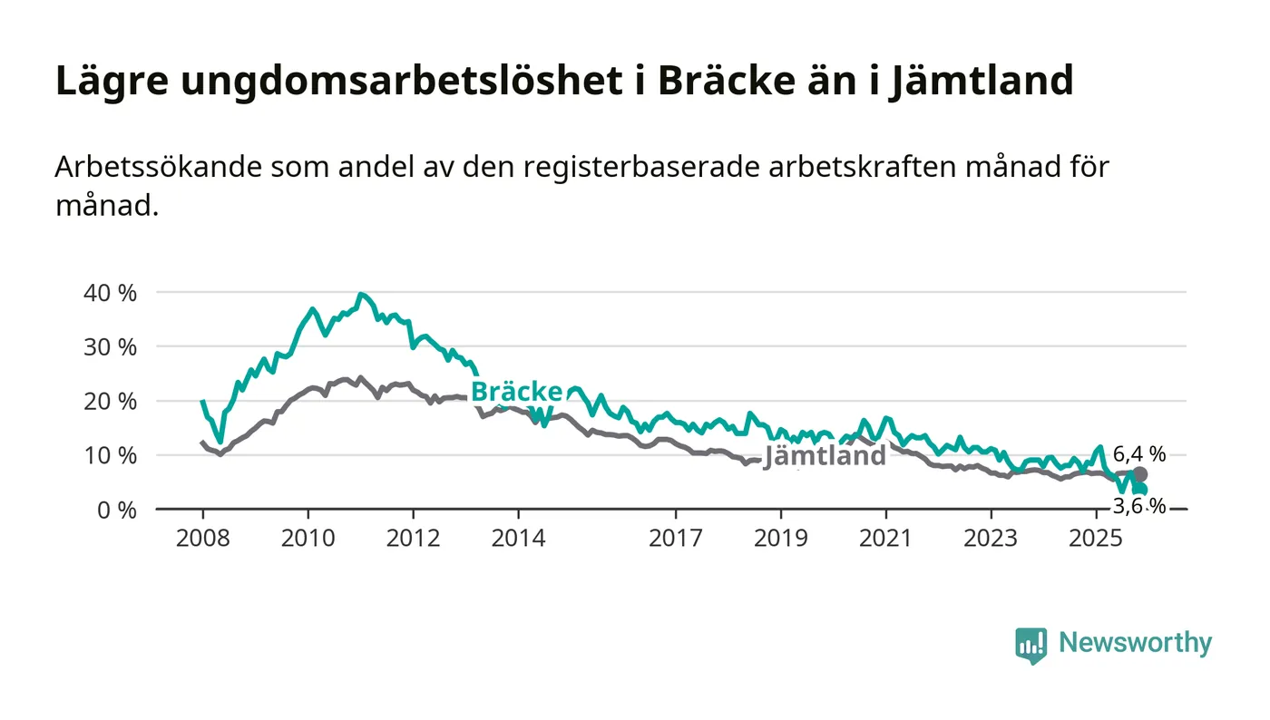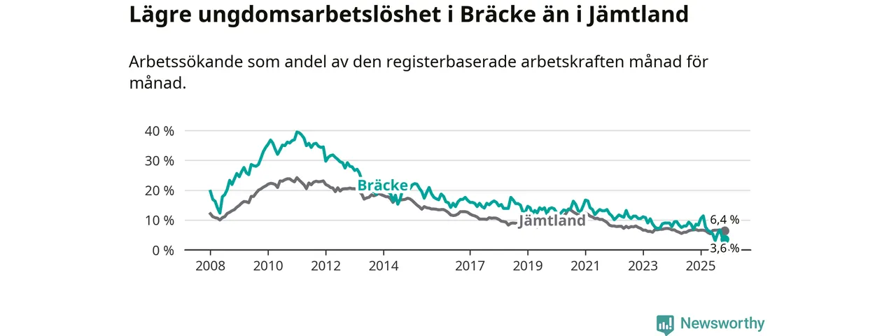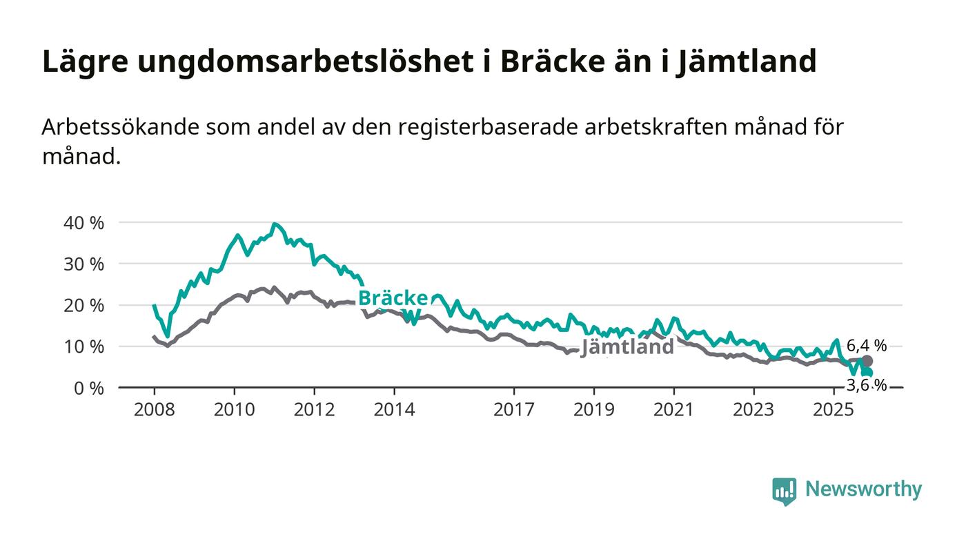 Medan Bräcke har ungefär samma total arbetslöshet som Jämtland, ligger ungdomsarbetslösheten 2,8 procentenheter lägre i Bräcke.