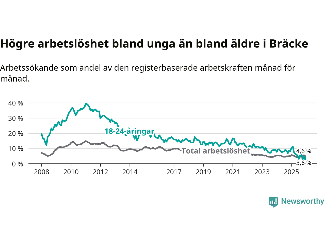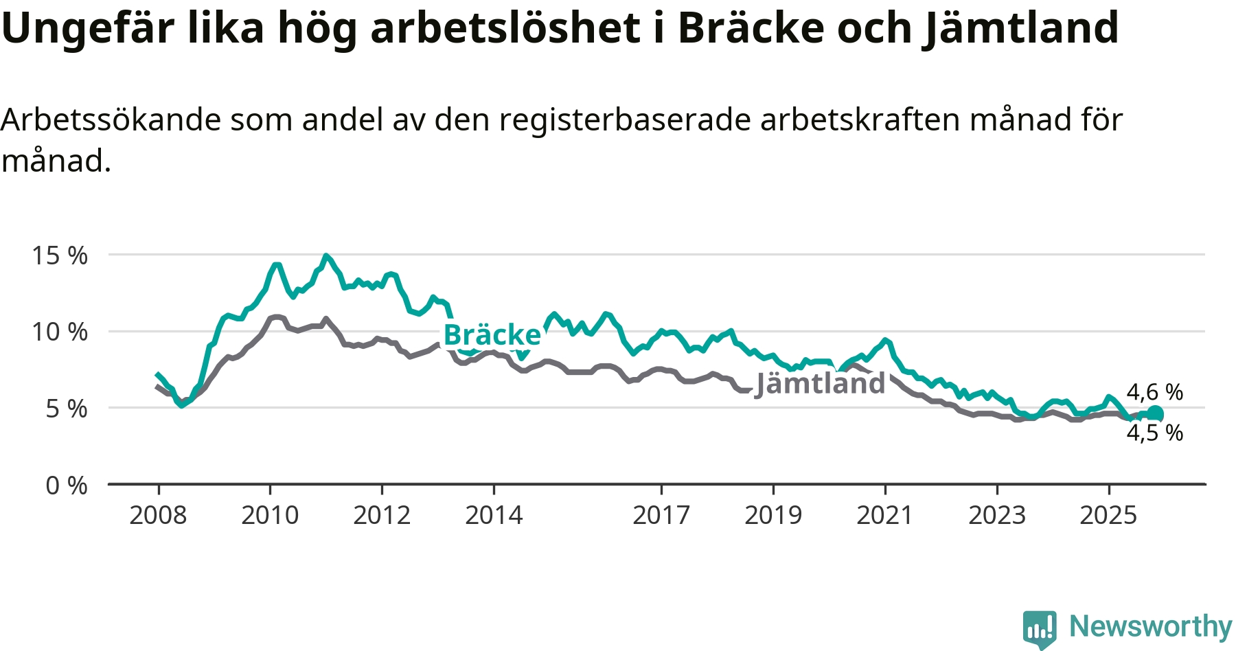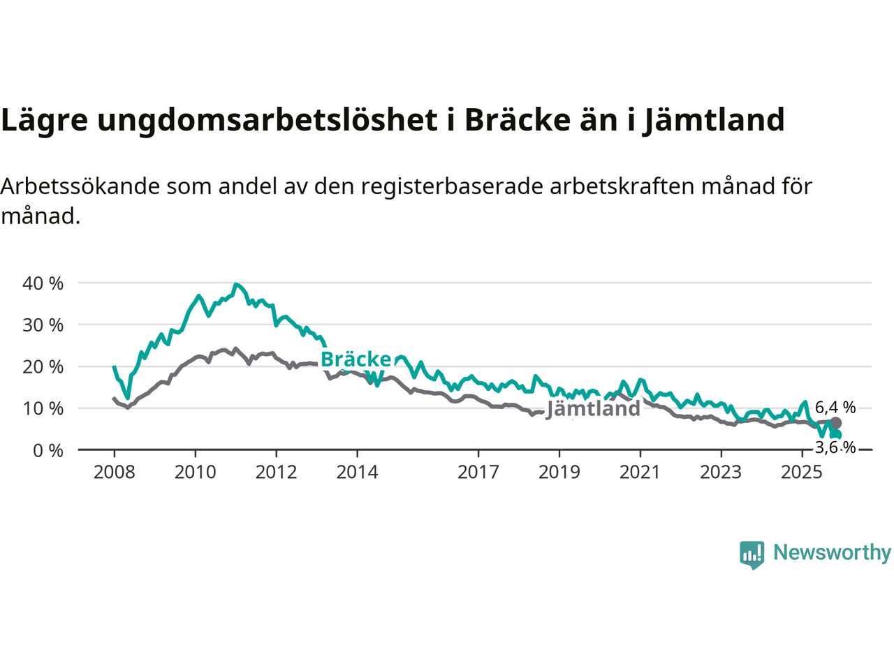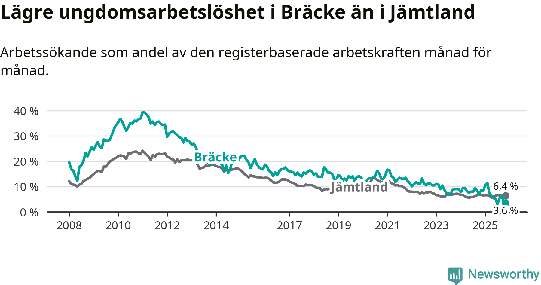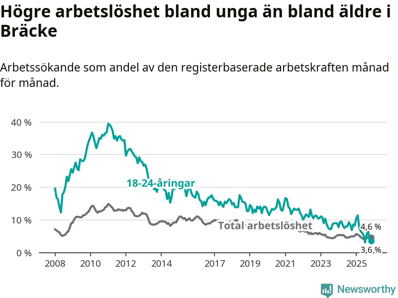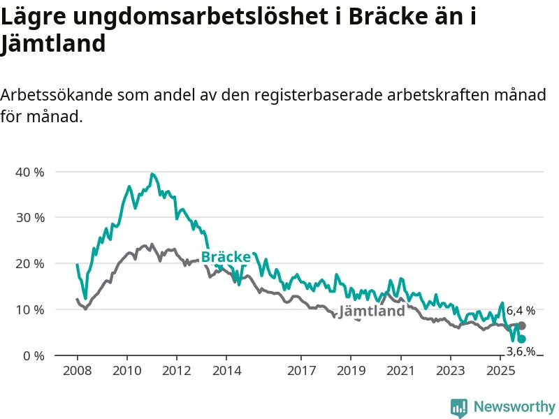 Medan Bräcke har ungefär samma total arbetslöshet som Jämtland, ligger ungdomsarbetslösheten 2,8 procentenheter lägre i Bräcke.