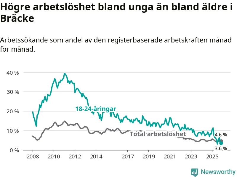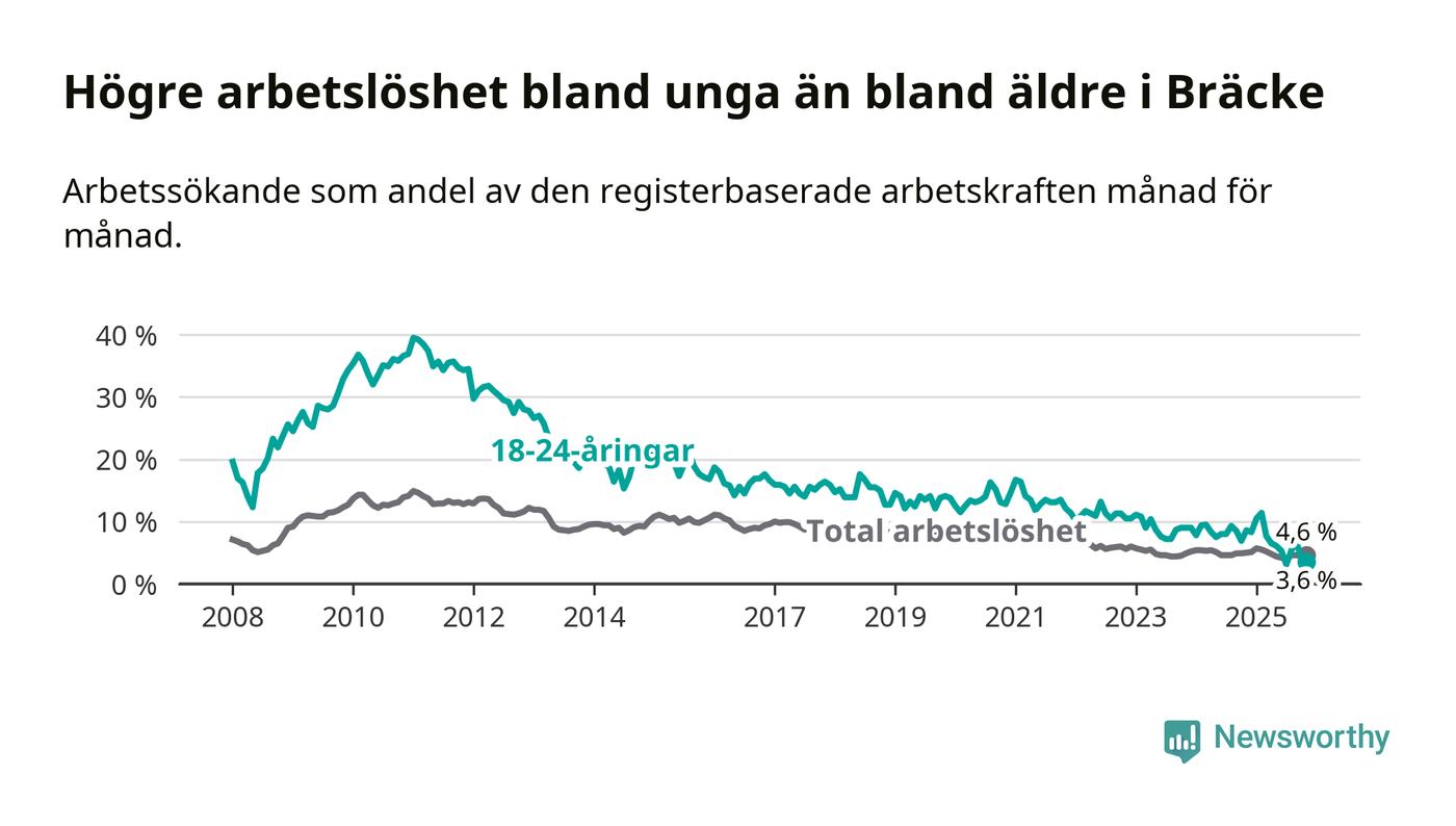 Den senaste månadsstatistiken från Arbetsförmedlingen visar på en nedgång i ungdomsarbetslöshet i Bräcke kommun med 5,0 procentenheter. Arbetslösheten bland personer i åldern 18–24 år låg i november på 3,6 procent.