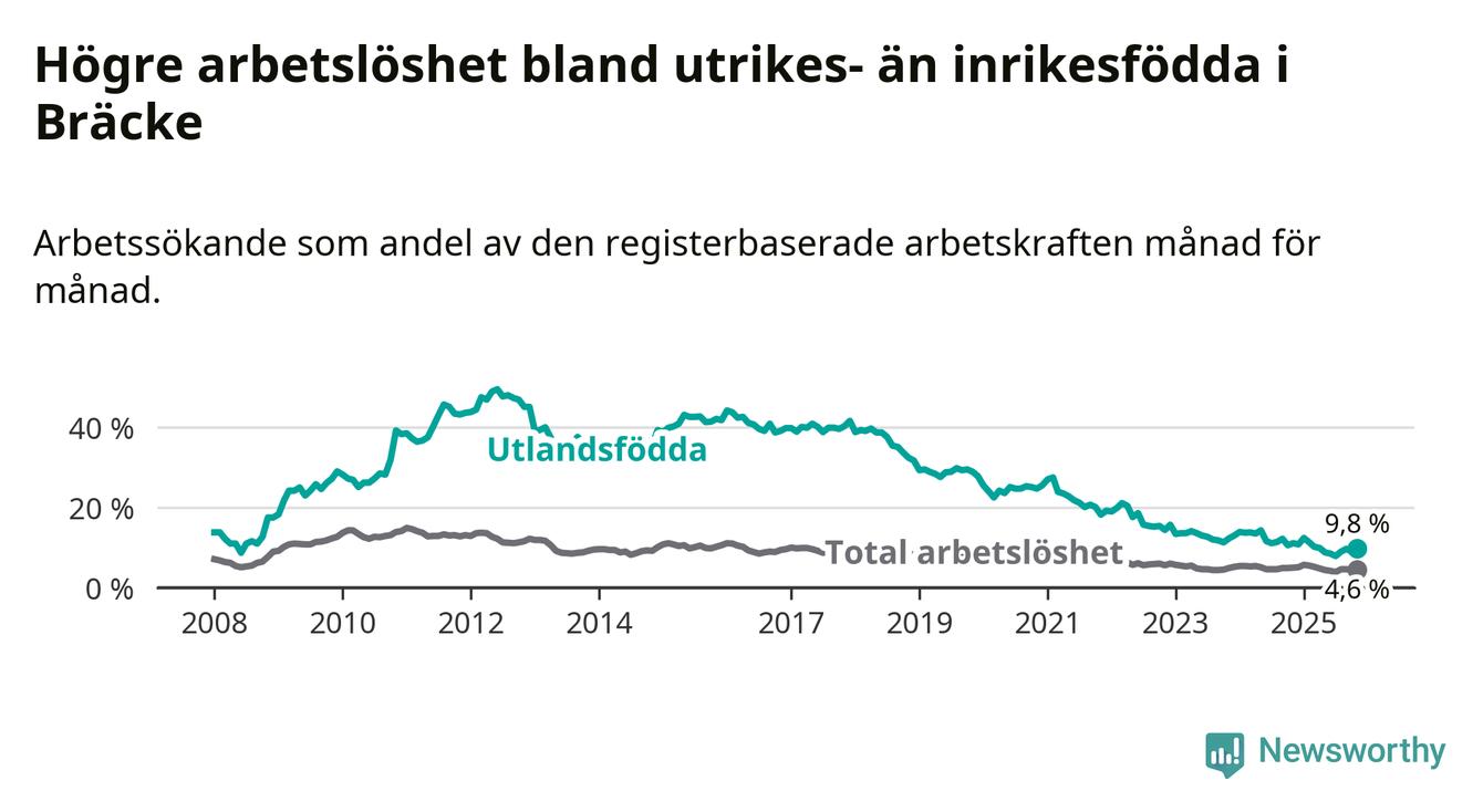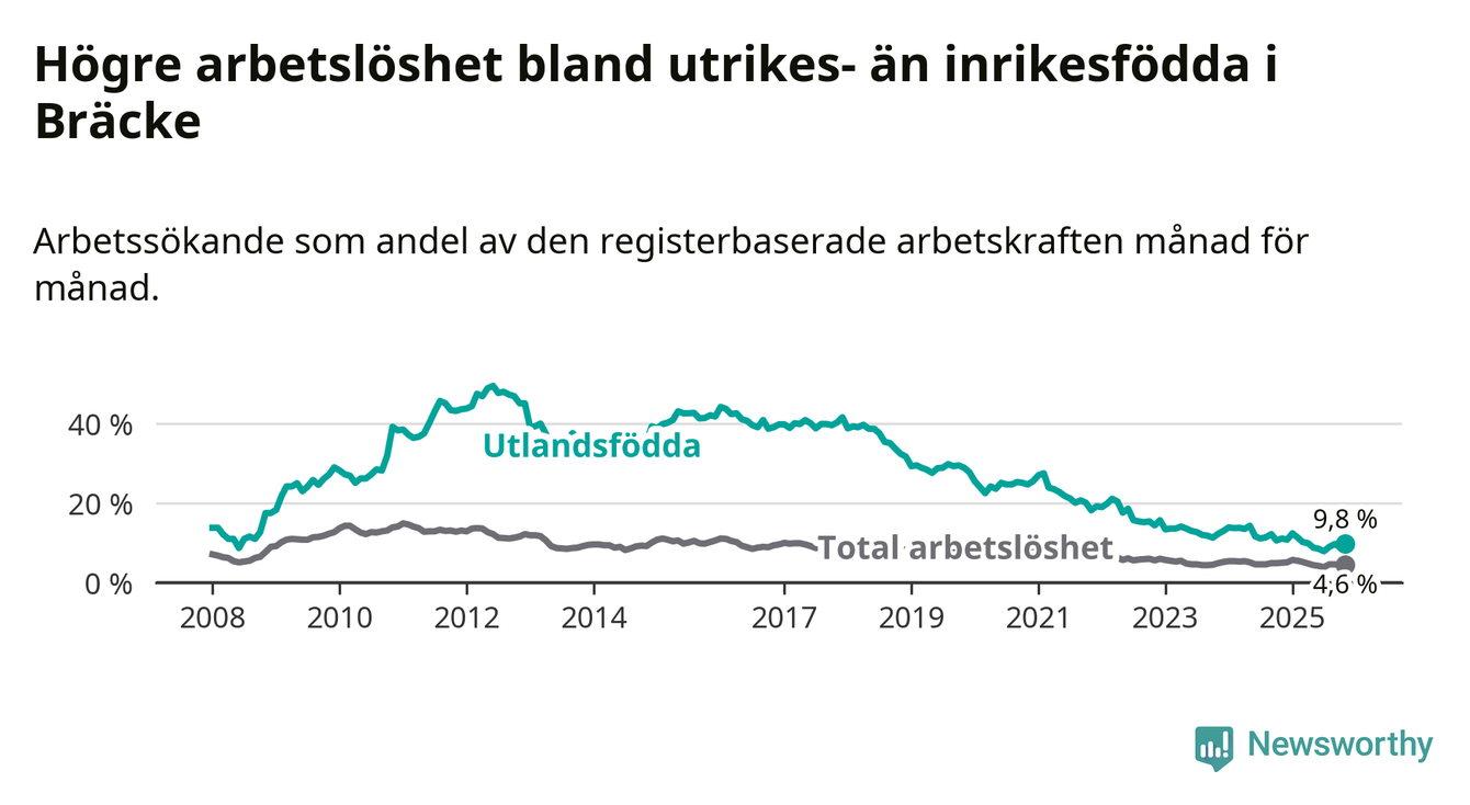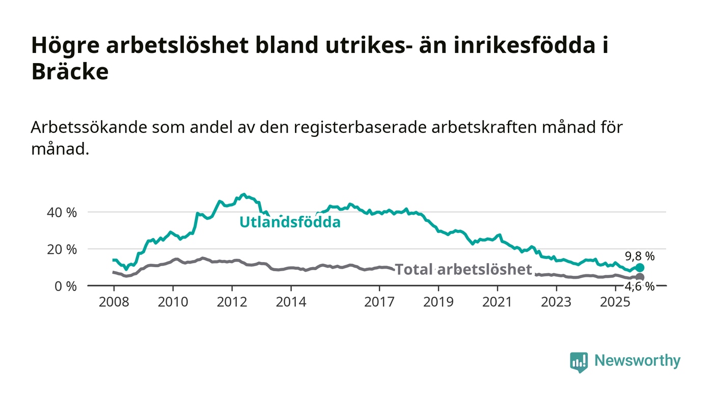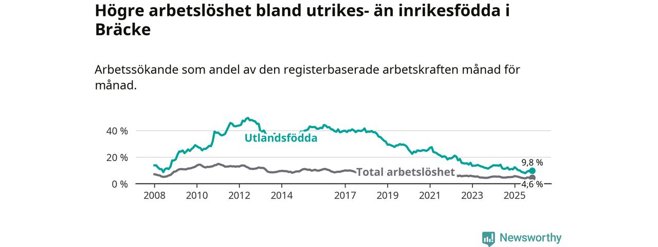Arbetslösheten bland utlandsfödda var 9,8 procent i Bräcke under november månad, motsvarande 38 av 388 personer. Det är 1,3 procentenheter färre än vid samma tidpunkt i fjol (−3 om man räknar personer). Därmed är de utlandsföddas arbetslöshet lägre än vid samma tidpunkt i fjol för 14:e månaden i följd. Sedan september 2024 har arbetslösheten bland utlandsfödda minskat från 12,2 till 9,8 procent.