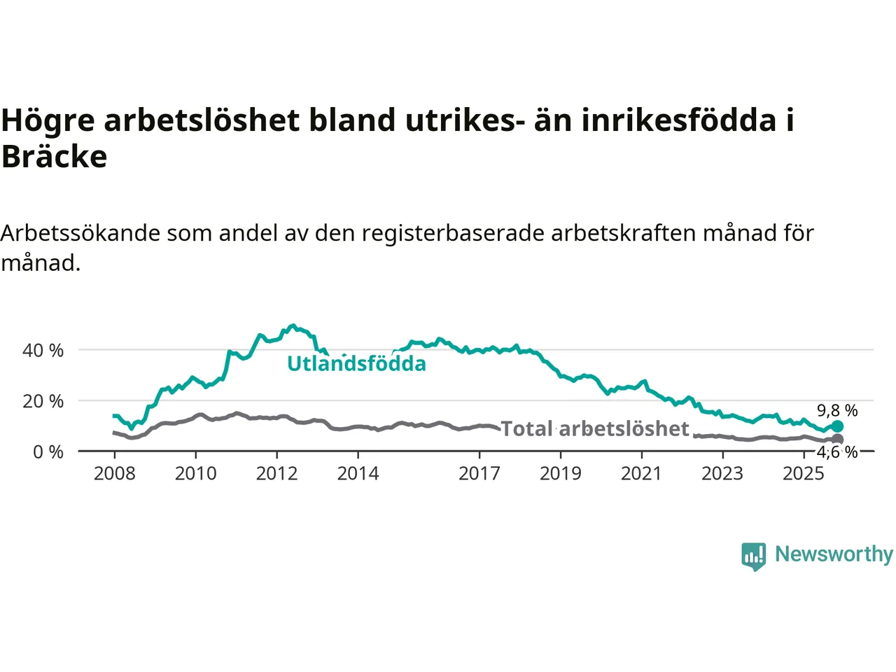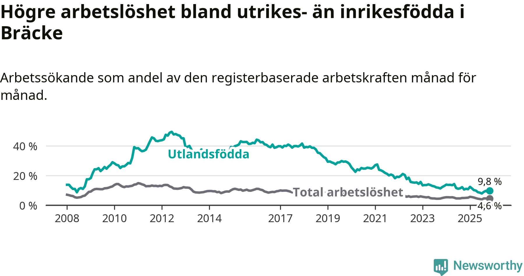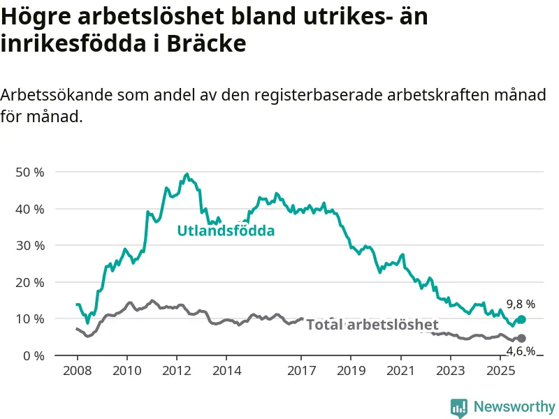 Arbetslösheten bland utlandsfödda var 9,8 procent i Bräcke under november månad, motsvarande 38 av 388 personer. Det är 1,3 procentenheter färre än vid samma tidpunkt i fjol (−3 om man räknar personer). Därmed är de utlandsföddas arbetslöshet lägre än vid samma tidpunkt i fjol för 14:e månaden i följd. Sedan september 2024 har arbetslösheten bland utlandsfödda minskat från 12,2 till 9,8 procent.