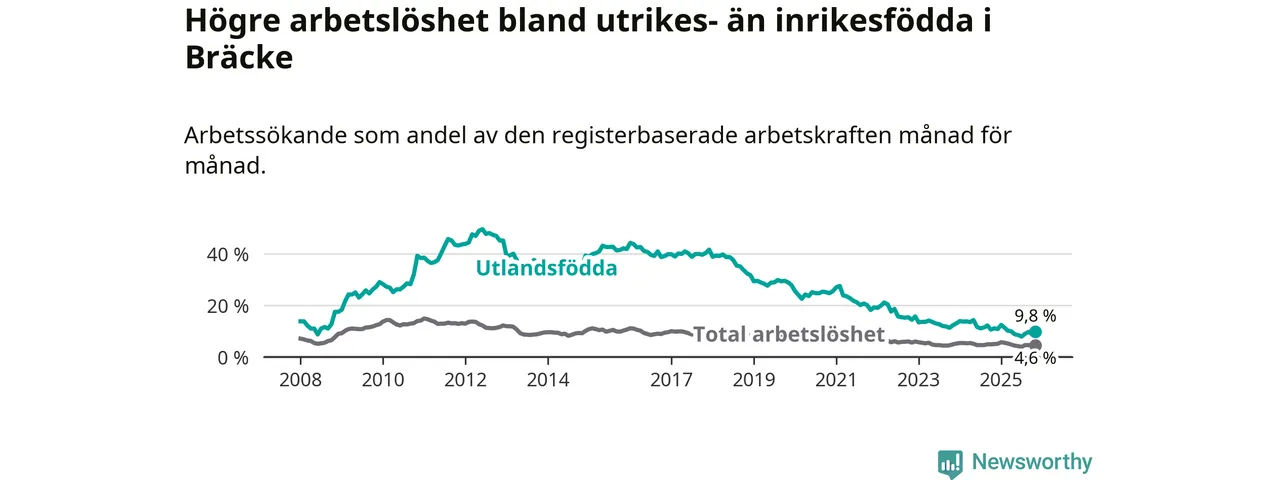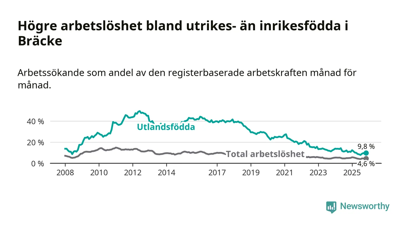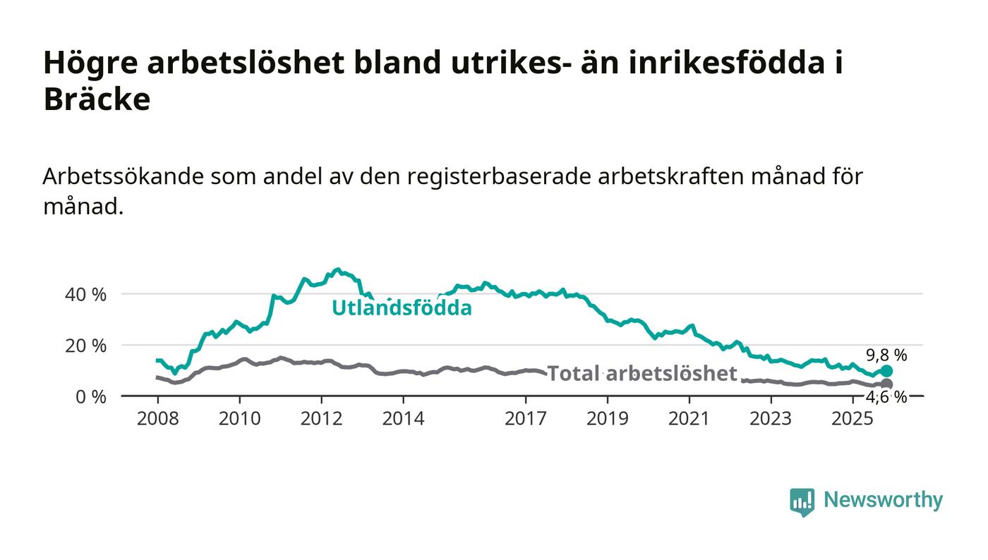 Skillnaden i arbetslöshet mellan utrikesfödda och hela befolkningen är 5,2 procentenheter i Bräcke. Det är en mindre skillnad än för ett år sedan (−0,9 procentenheter).