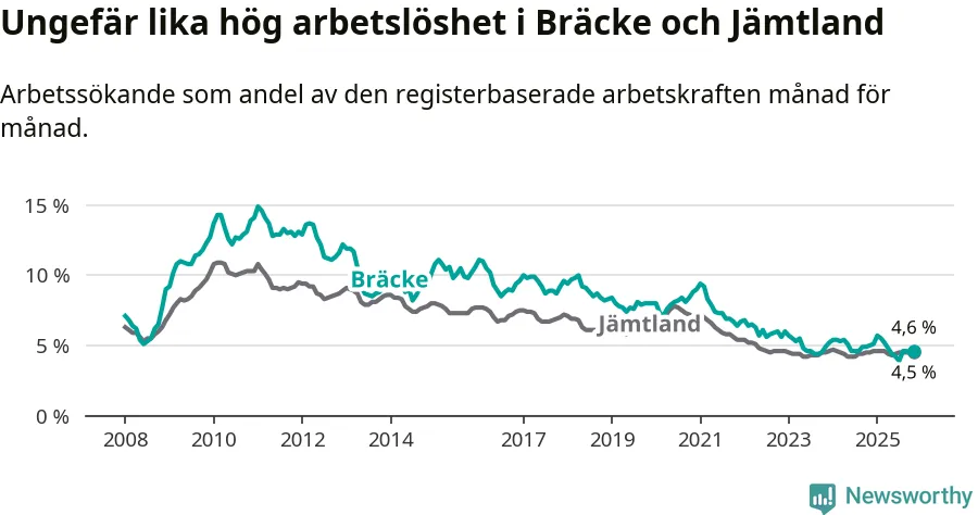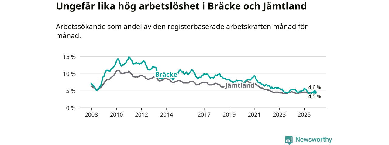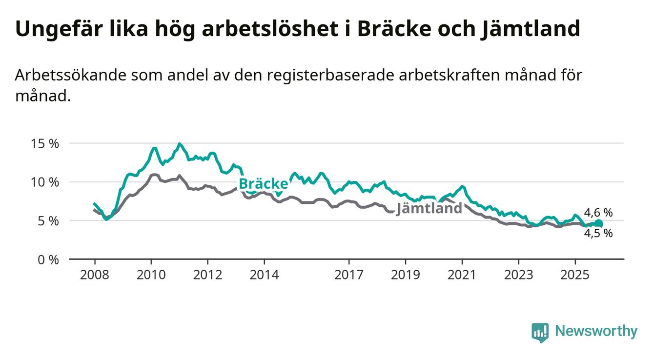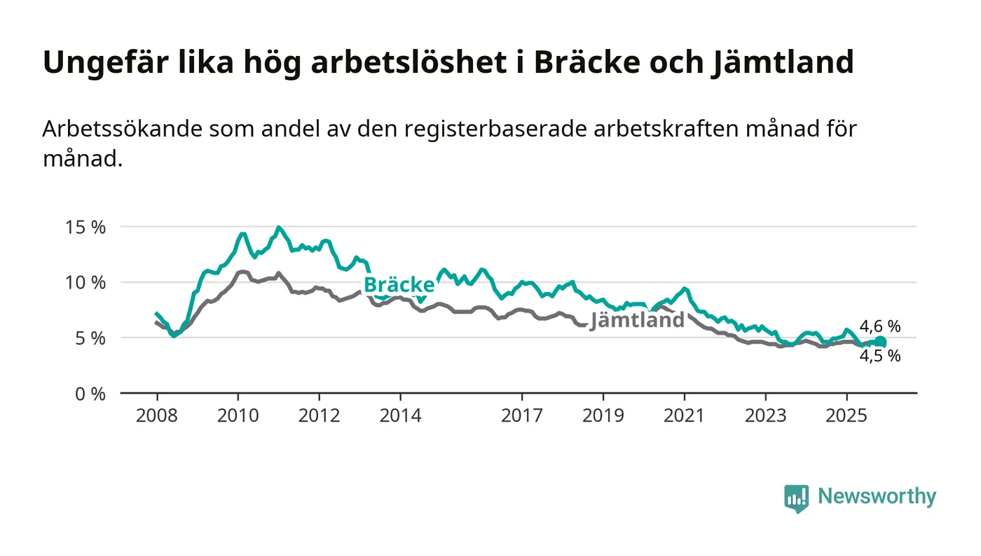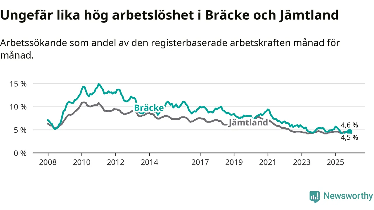 Under november månad rapporterade Bräcke kommun en total arbetslöshet på 4,6 procent. Det är en minskning jämfört med samma tidpunkt i fjol (−0,4 procentenheter). I Jämtlands län däremot står arbetslösheten stilla.