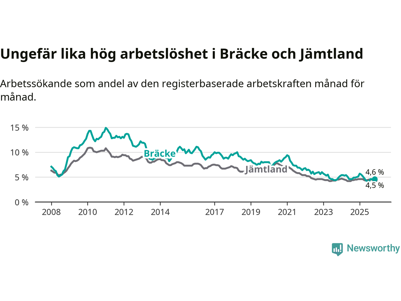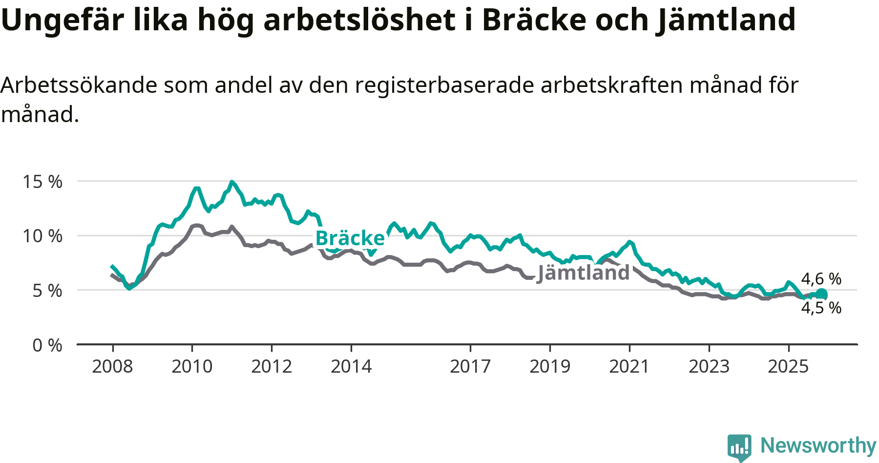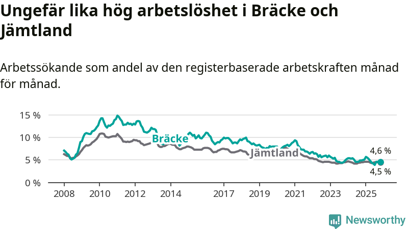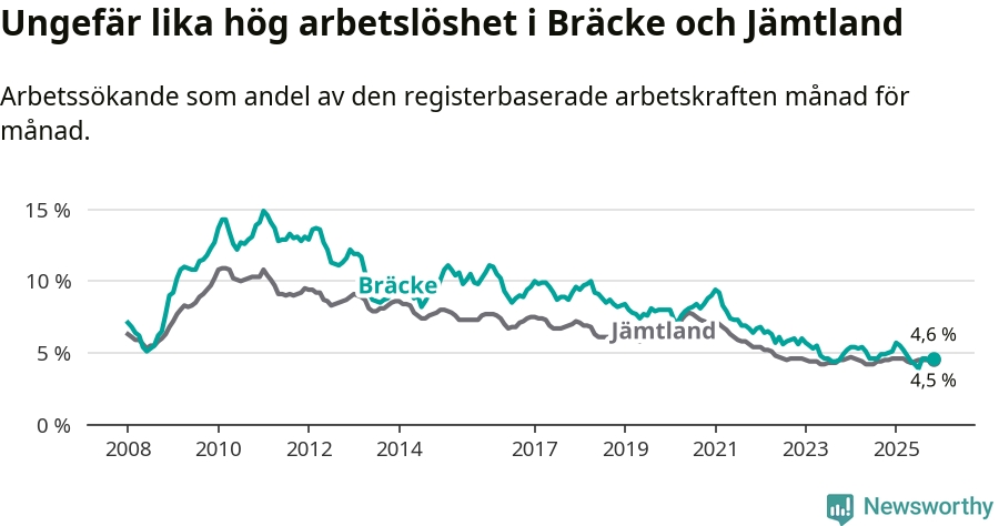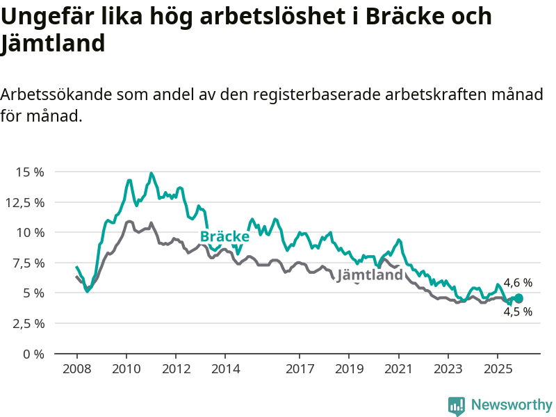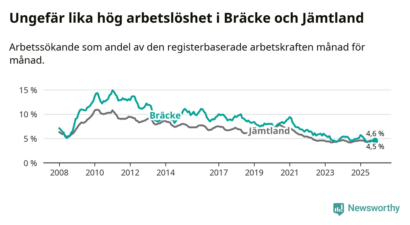 Under november månad rapporterade Bräcke kommun en total arbetslöshet på 4,6 procent. Det är en minskning jämfört med samma tidpunkt i fjol (−0,4 procentenheter). I Jämtlands län däremot står arbetslösheten stilla.