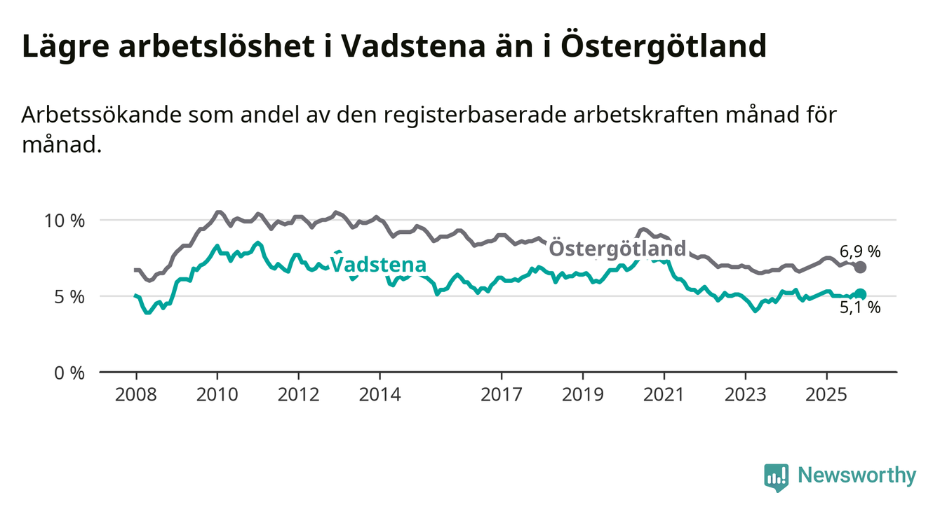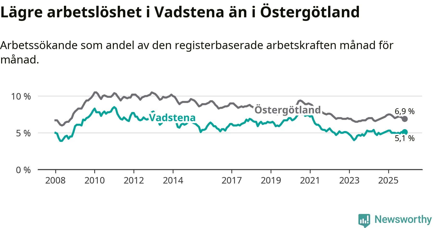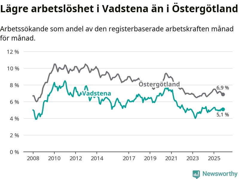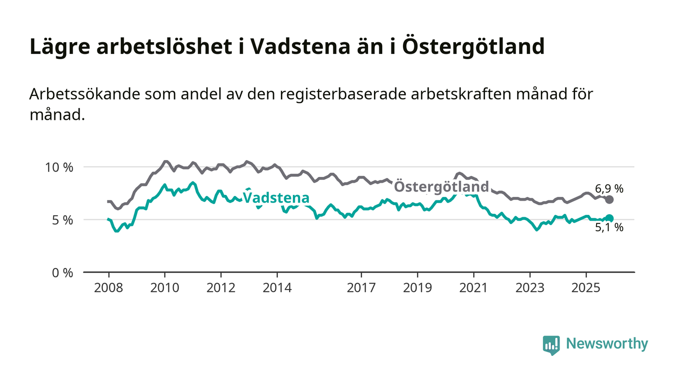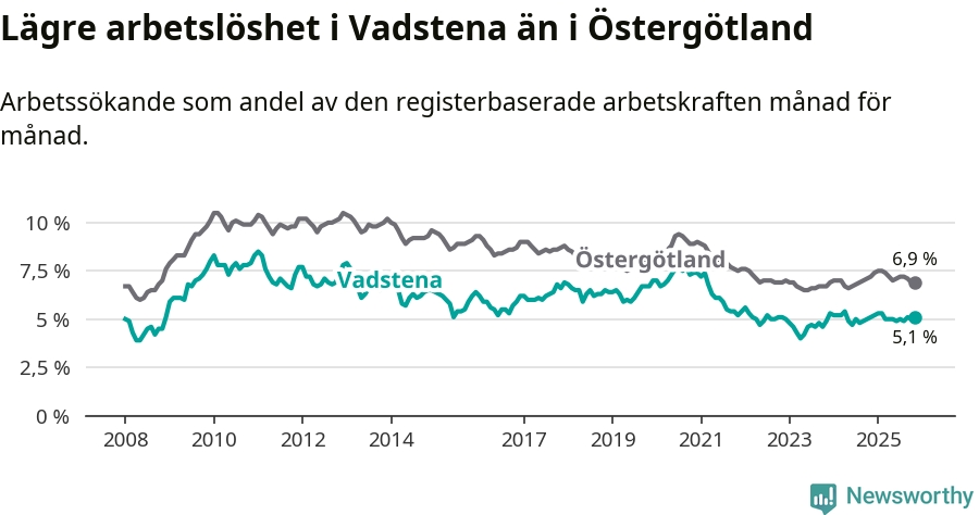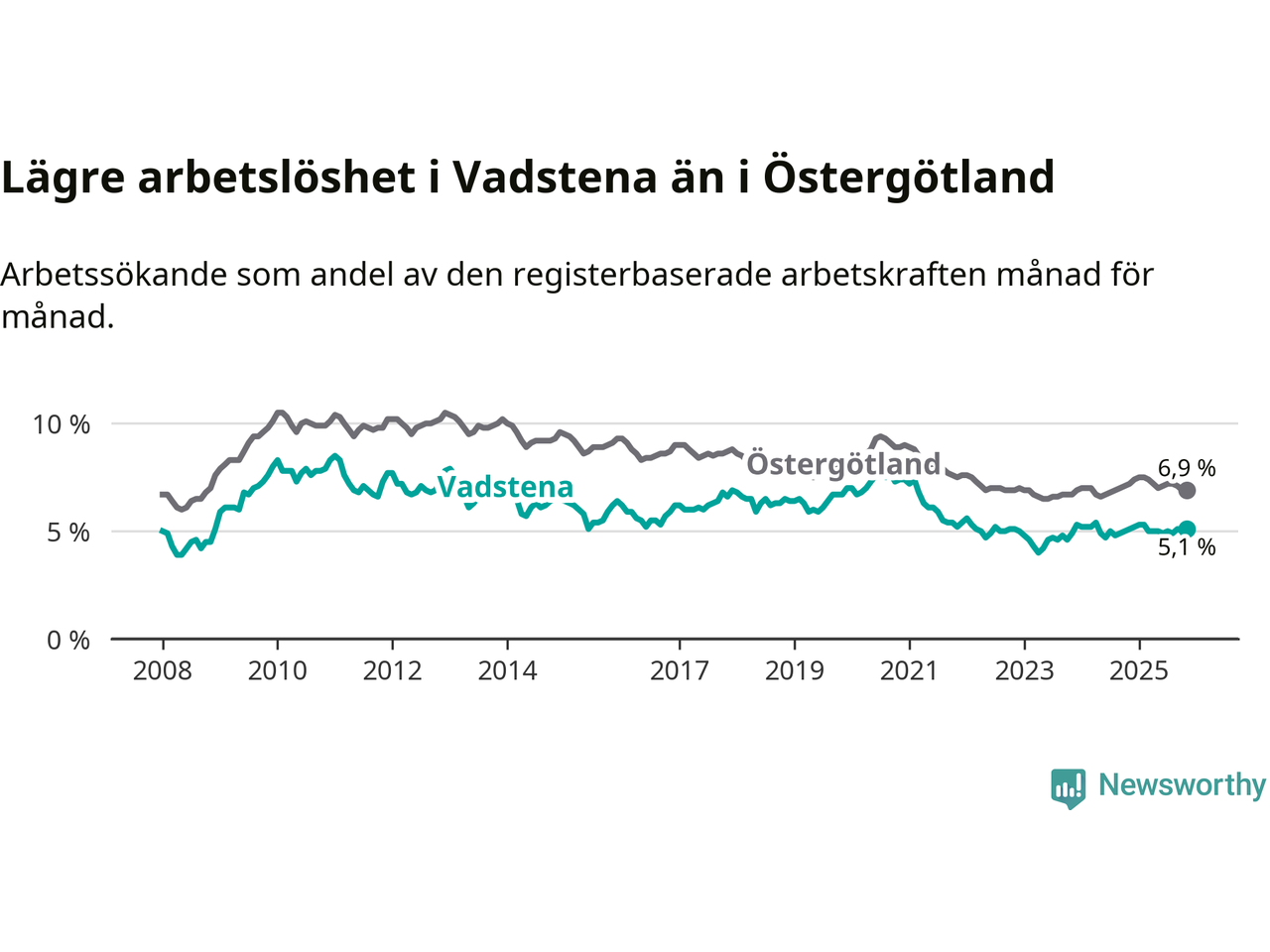 Under november månad rapporterade Vadstena kommun en total arbetslöshet på 5,1 procent. Det är i samma nivå som i november i fjol. I Östergötlands län däremot sjunker arbetslösheten