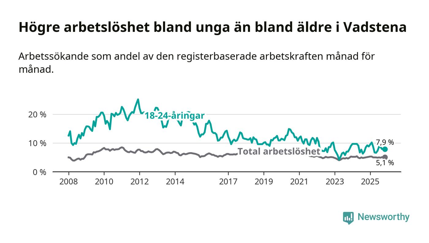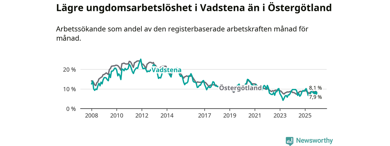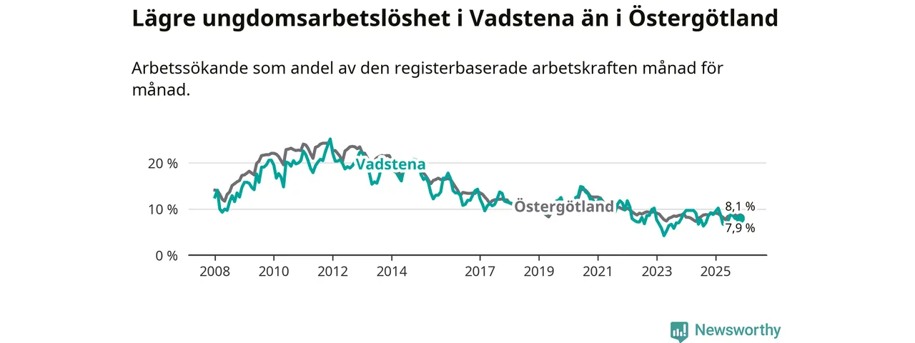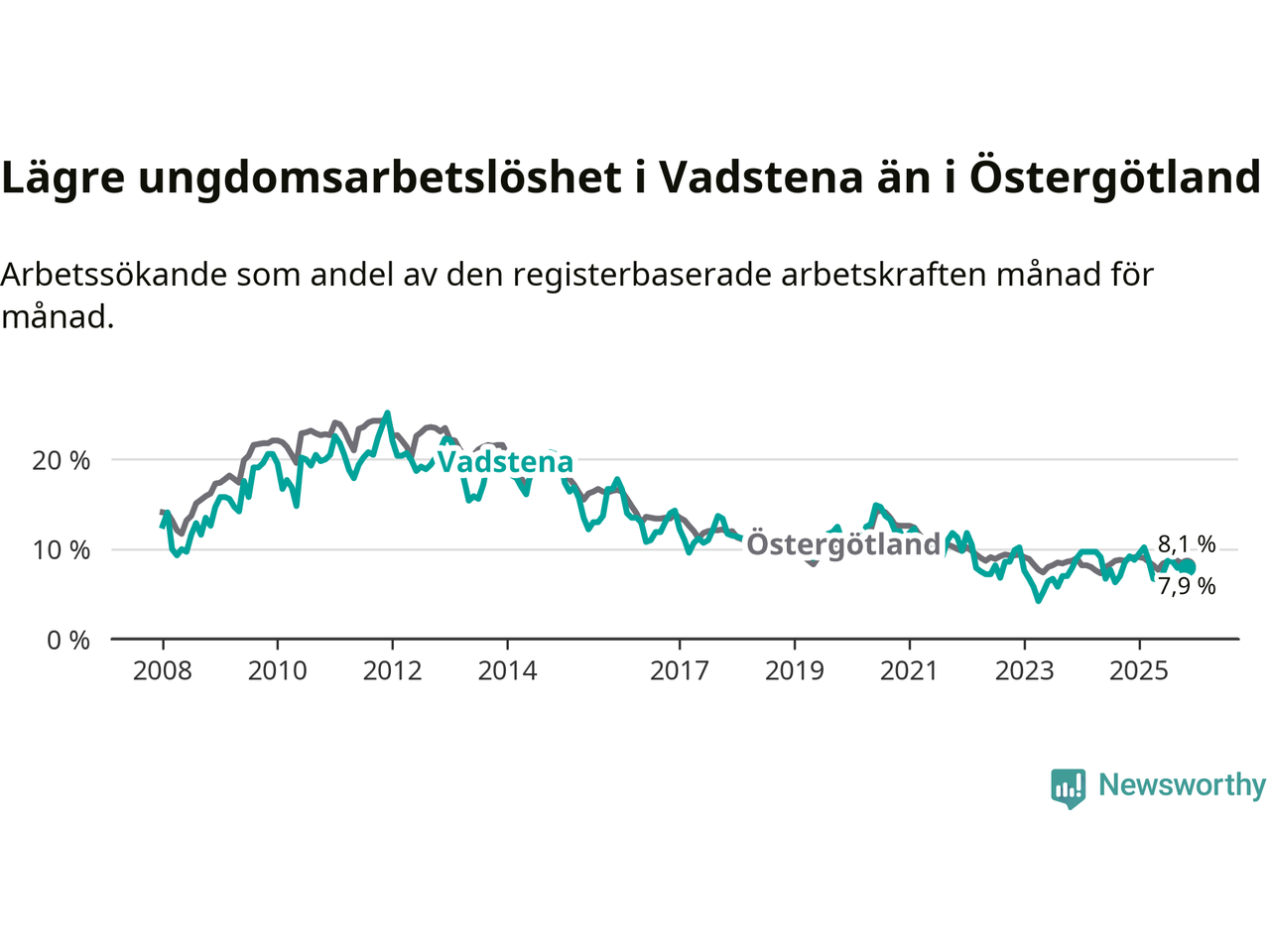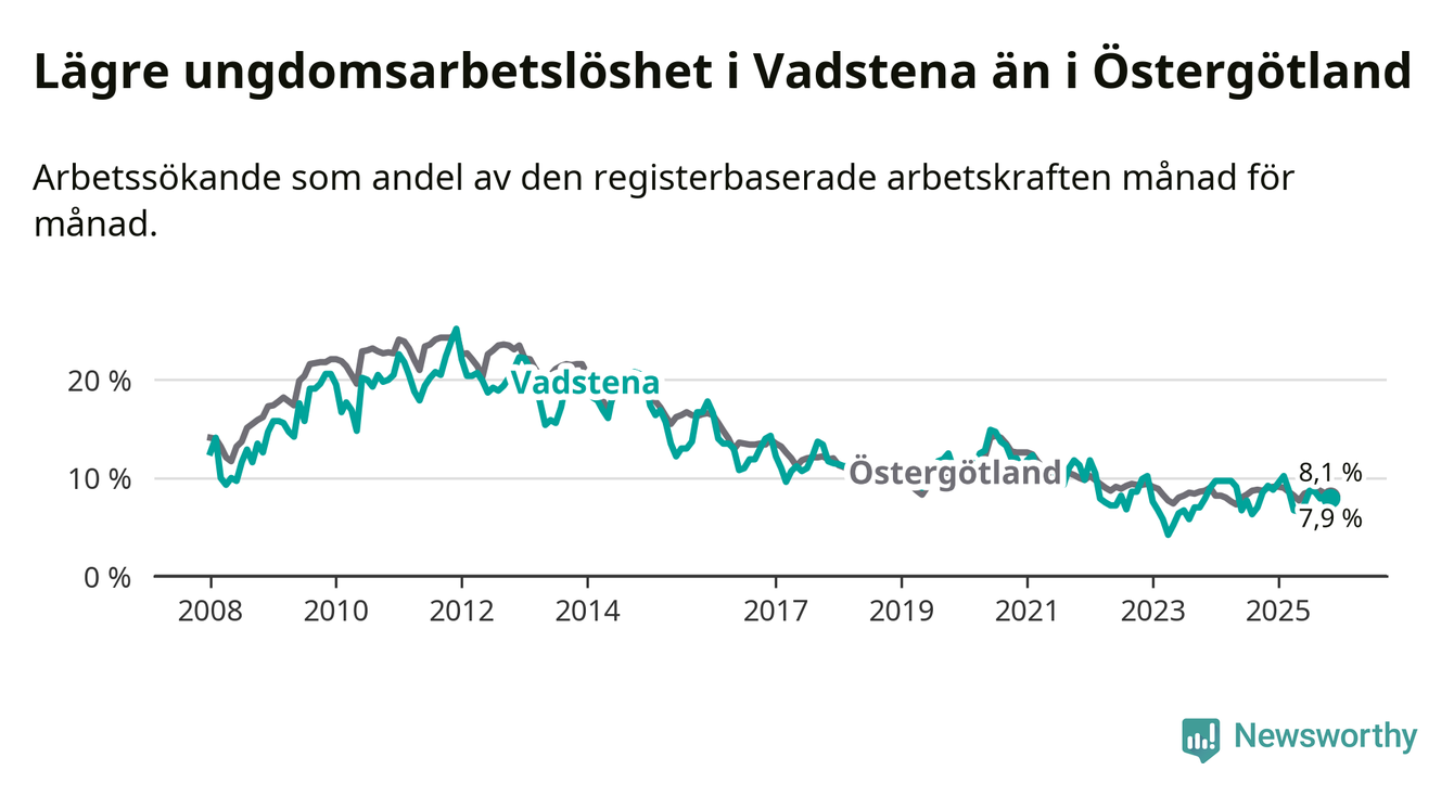Graf: Arbetslöshet bland unga i Vadstena kommun och Östergötlands län