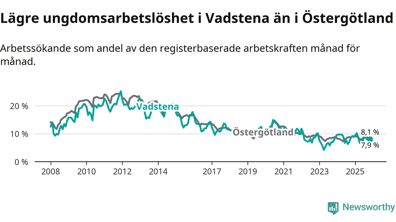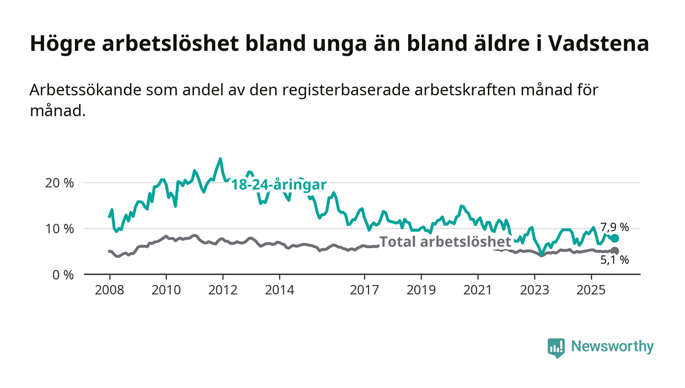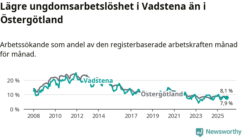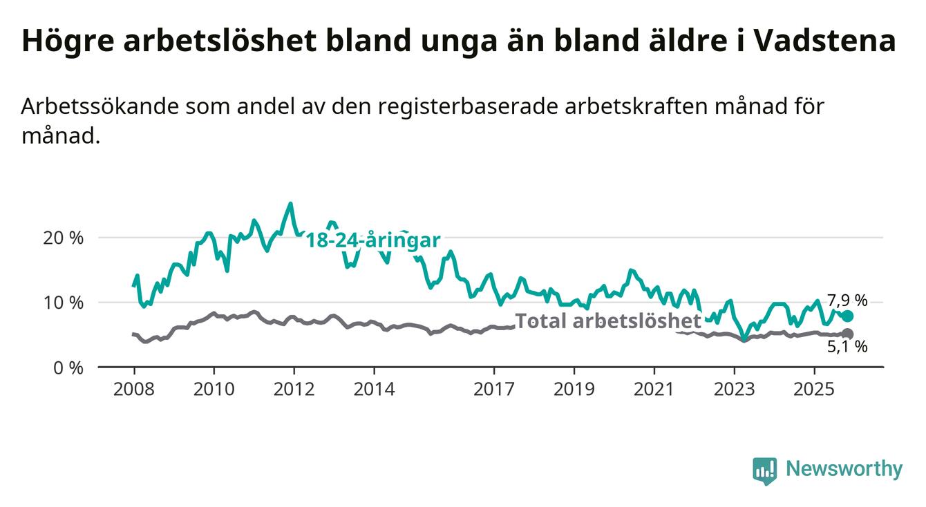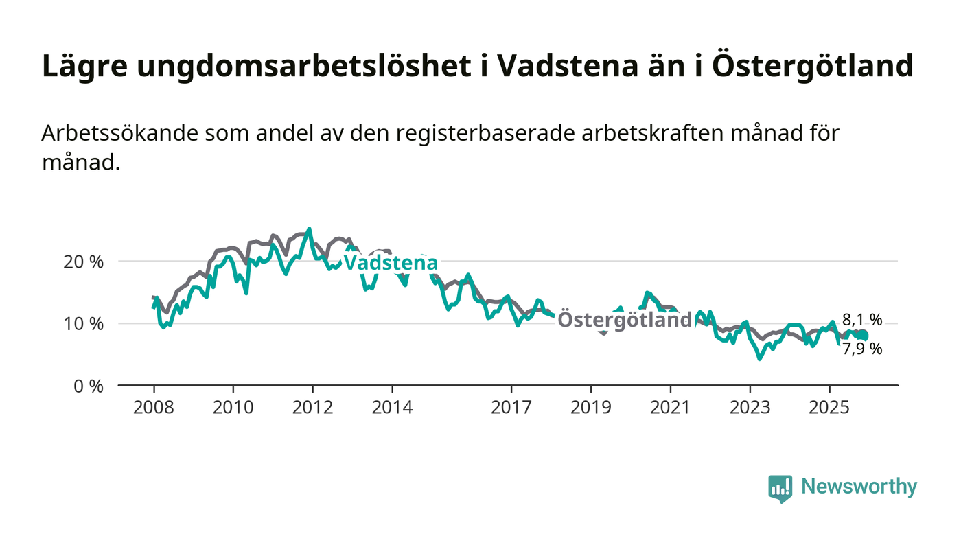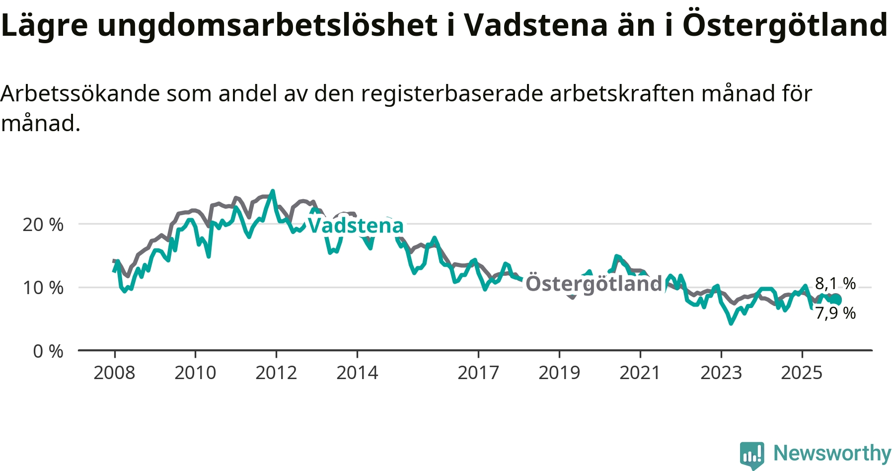 Graf: Arbetslöshet bland unga i Vadstena kommun och Östergötlands län