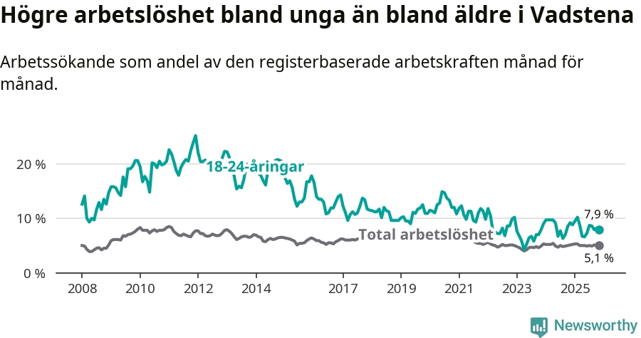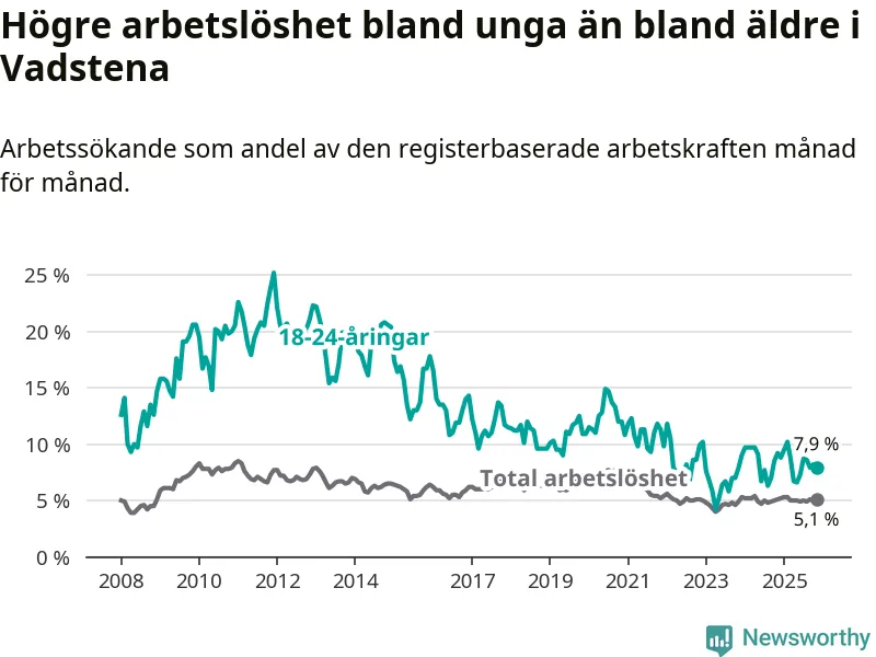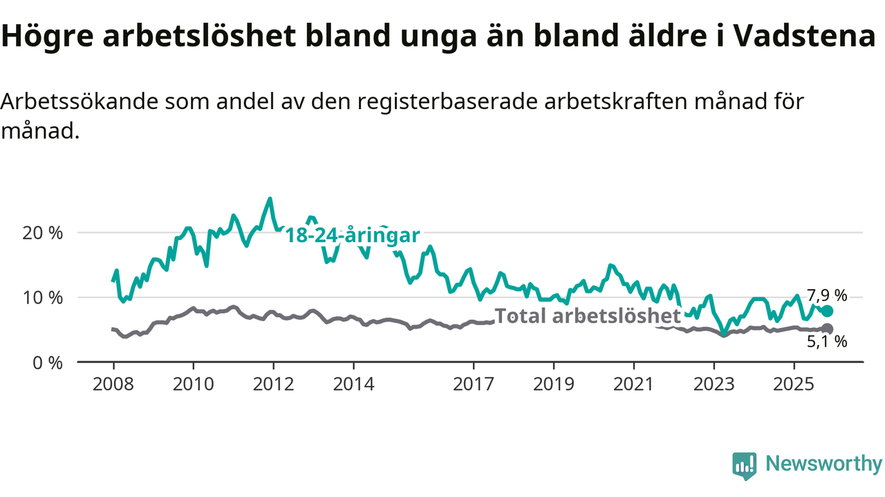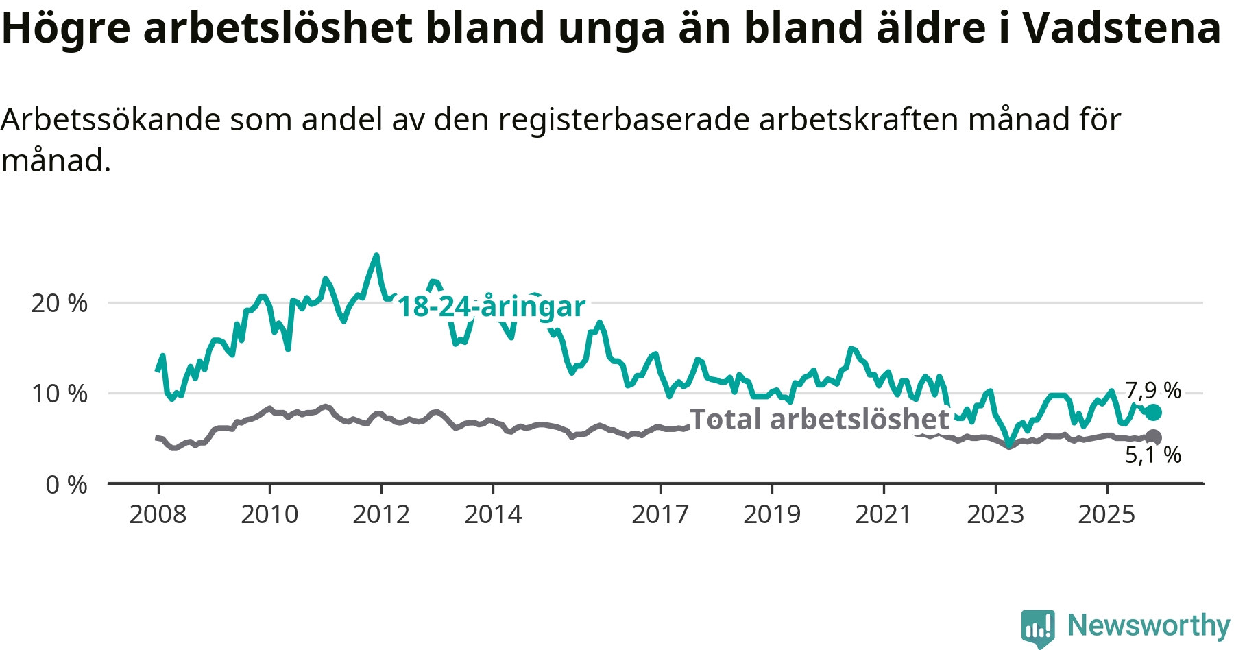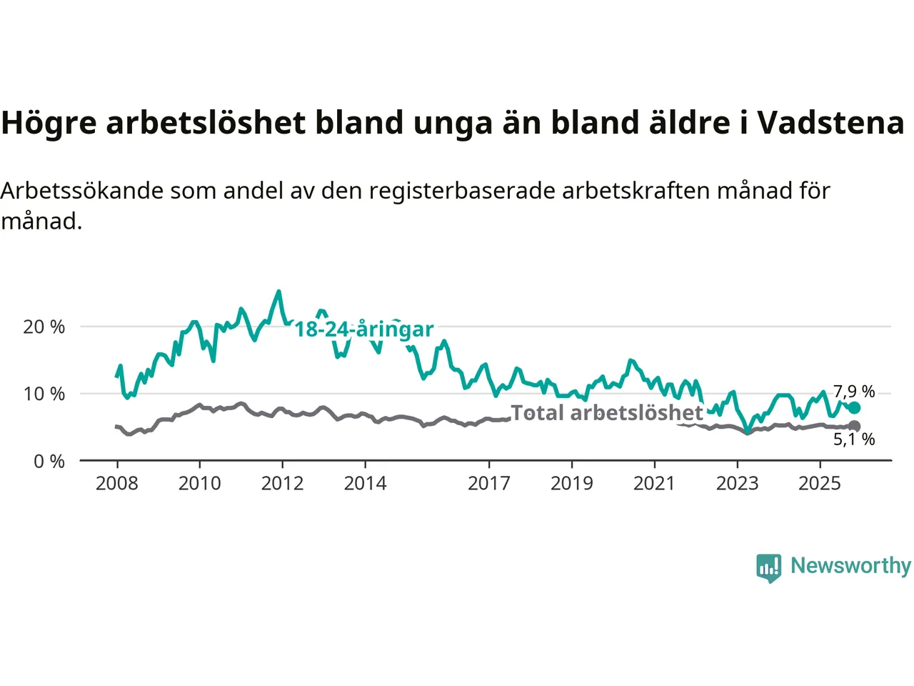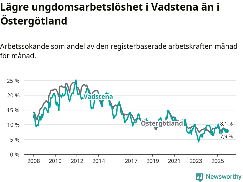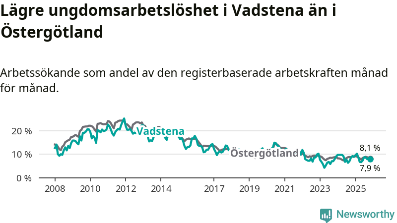 Graf: Arbetslöshet bland unga i Vadstena kommun och Östergötlands län