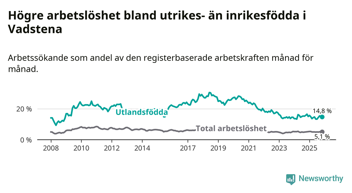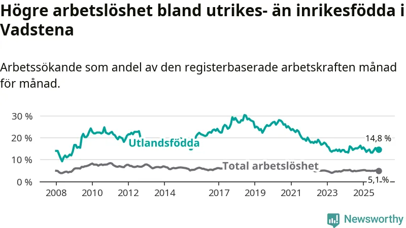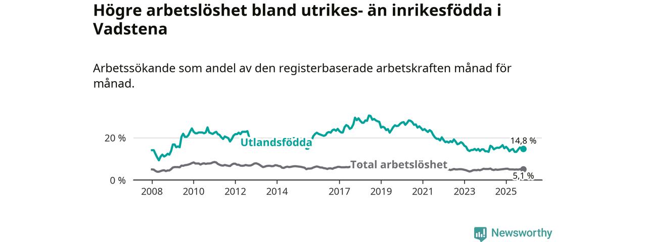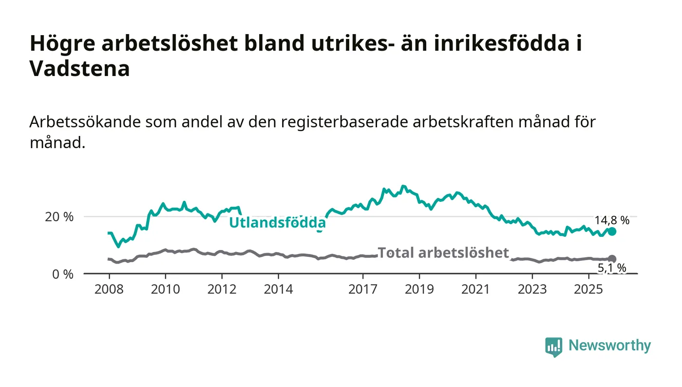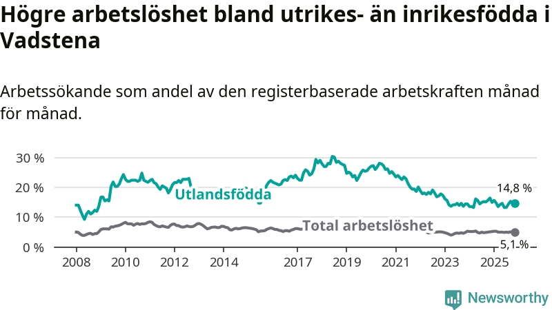 Arbetslösheten bland utlandsfödda var 14,8 procent i Vadstena under november månad, motsvarande 55 av 372 personer. Det är 1,7 procentenheter färre än vid samma tidpunkt i fjol (−3 om man räknar personer).