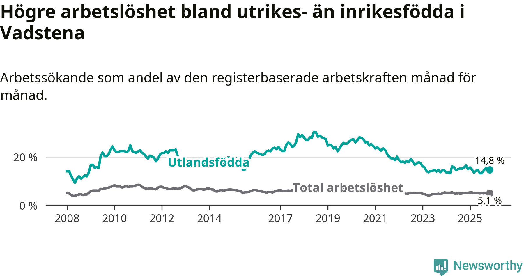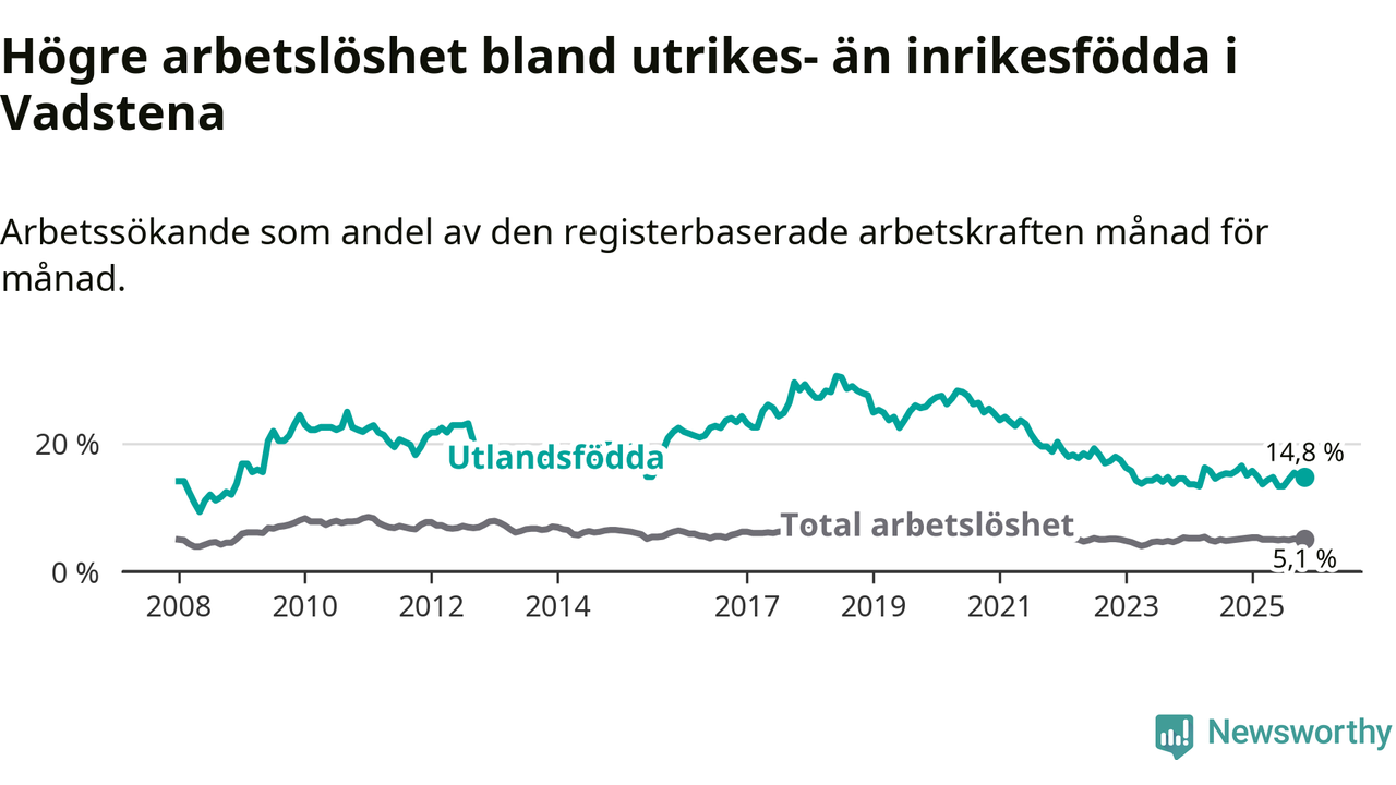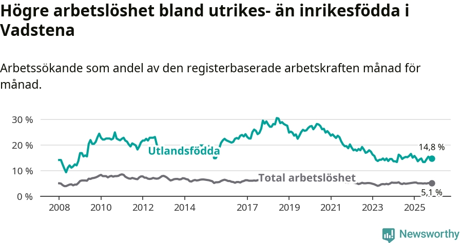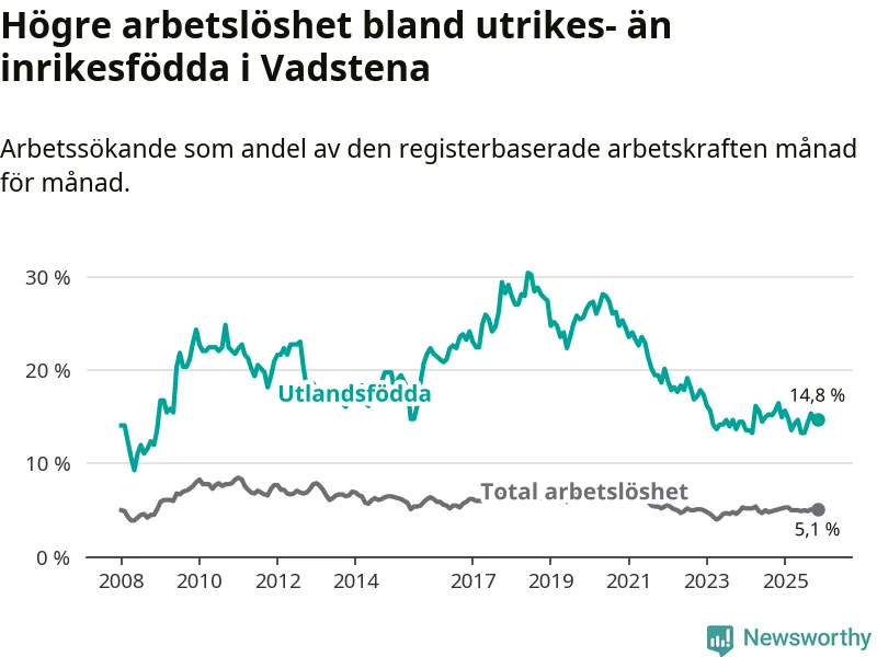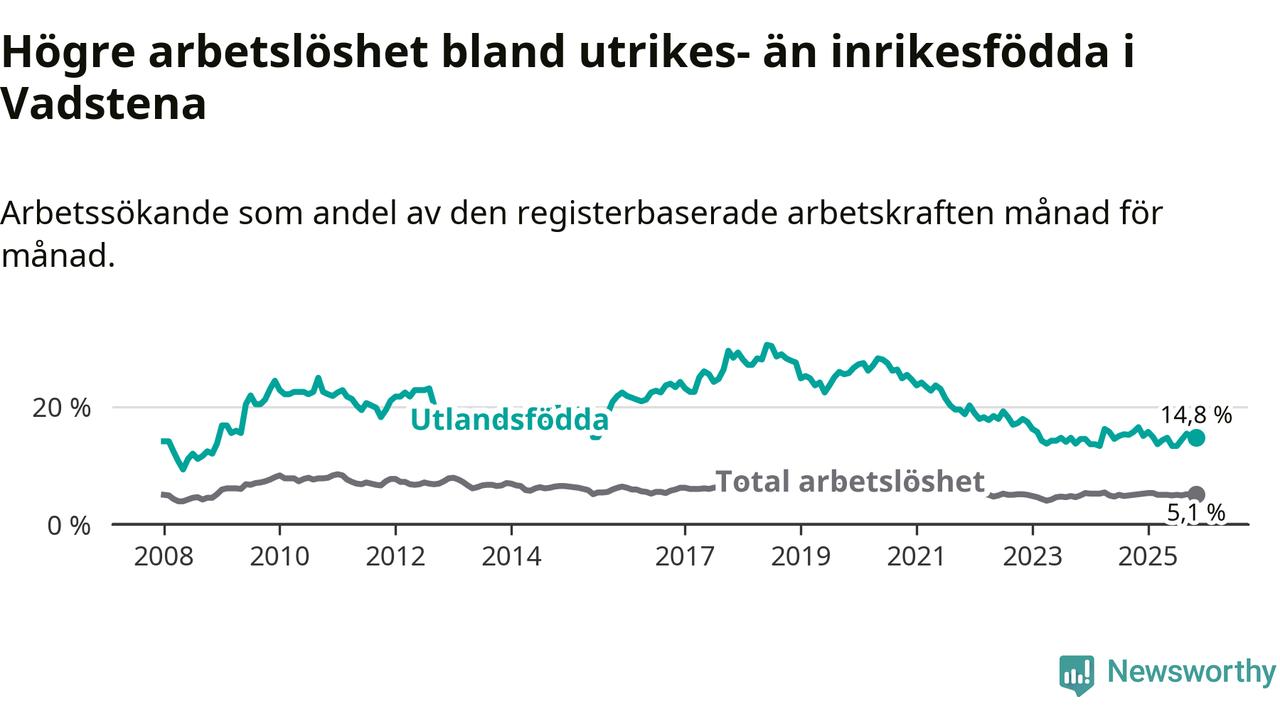 Arbetslösheten bland utlandsfödda var 14,8 procent i Vadstena under november månad, motsvarande 55 av 372 personer. Det är 1,7 procentenheter färre än vid samma tidpunkt i fjol (−3 om man räknar personer).