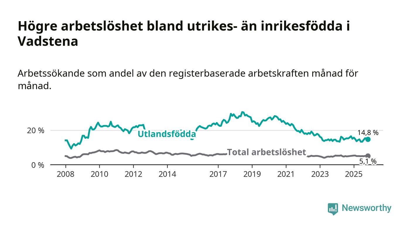 Skillnaden i arbetslöshet mellan utrikesfödda och hela befolkningen är 9,7 procentenheter i Vadstena. Det är en betydligt mindre skillnad än för ett år sedan (−1,7 procentenheter).