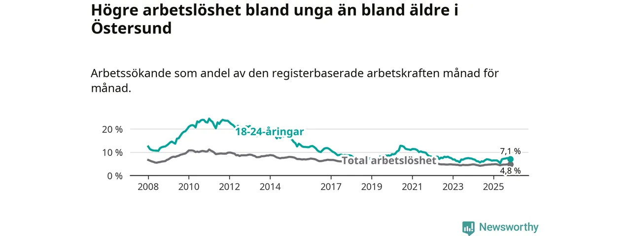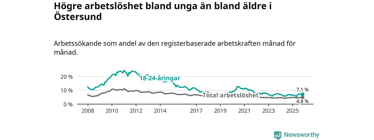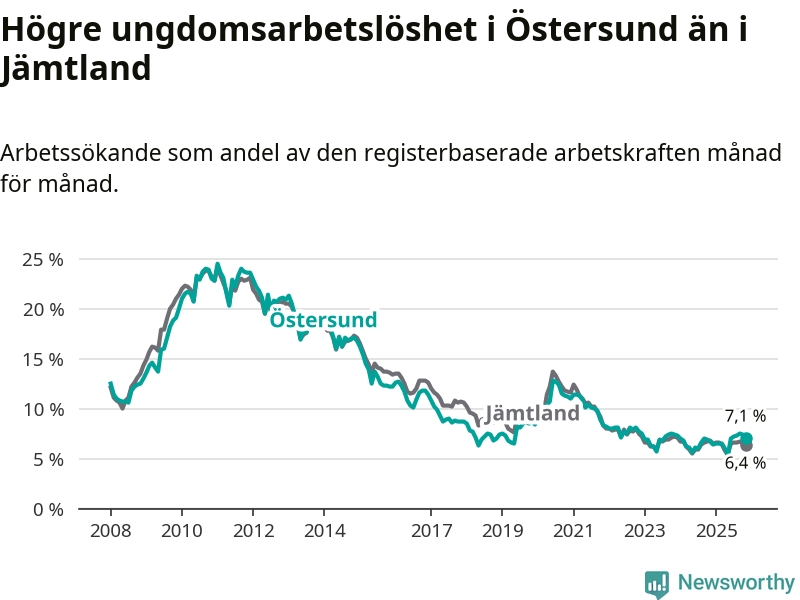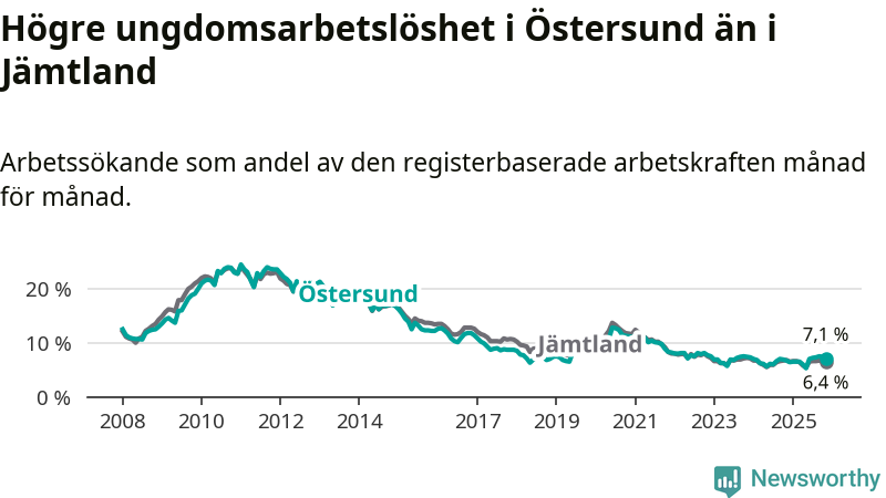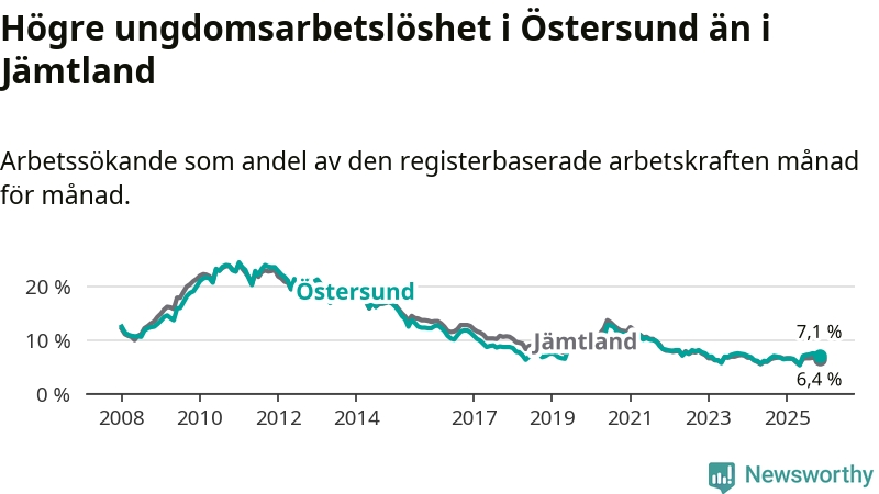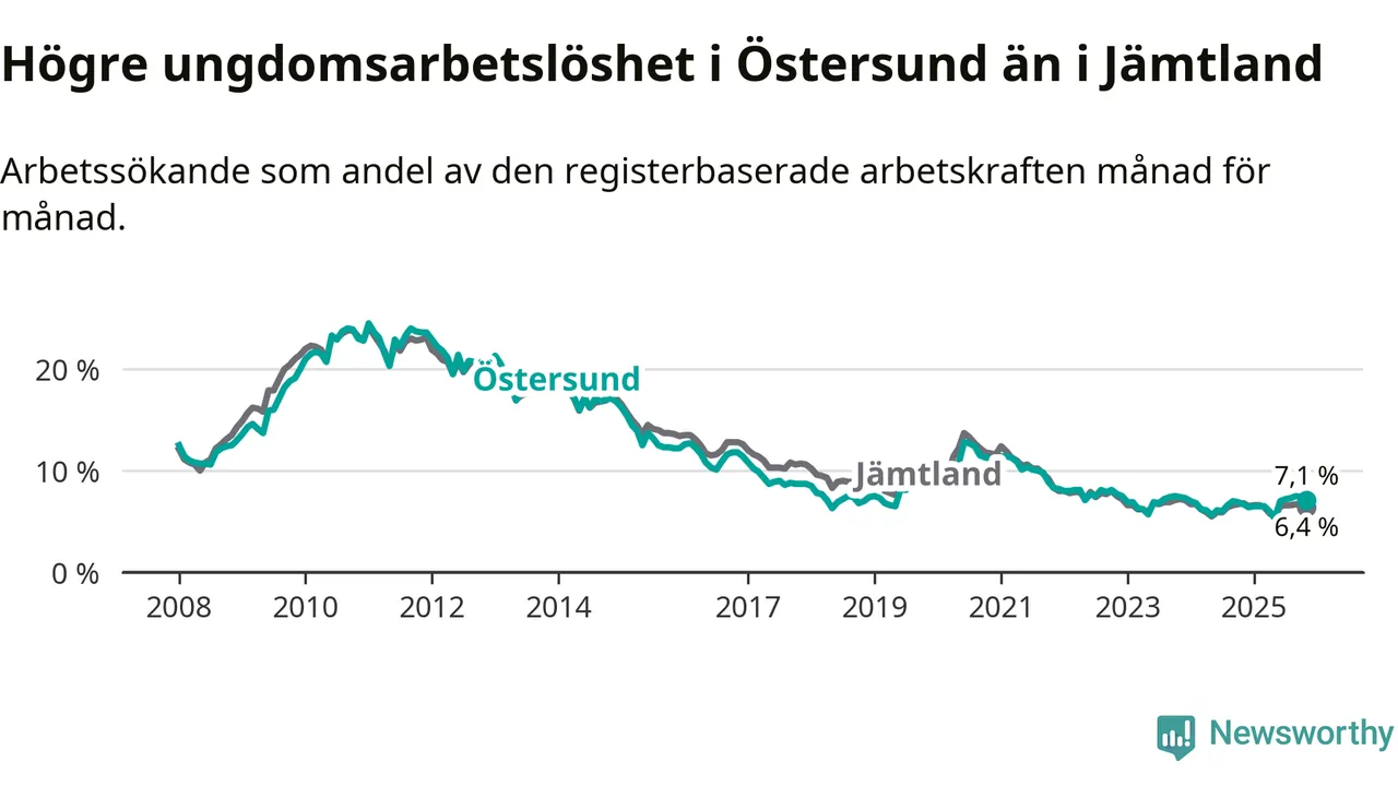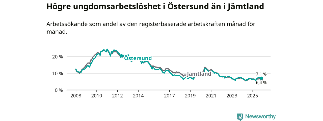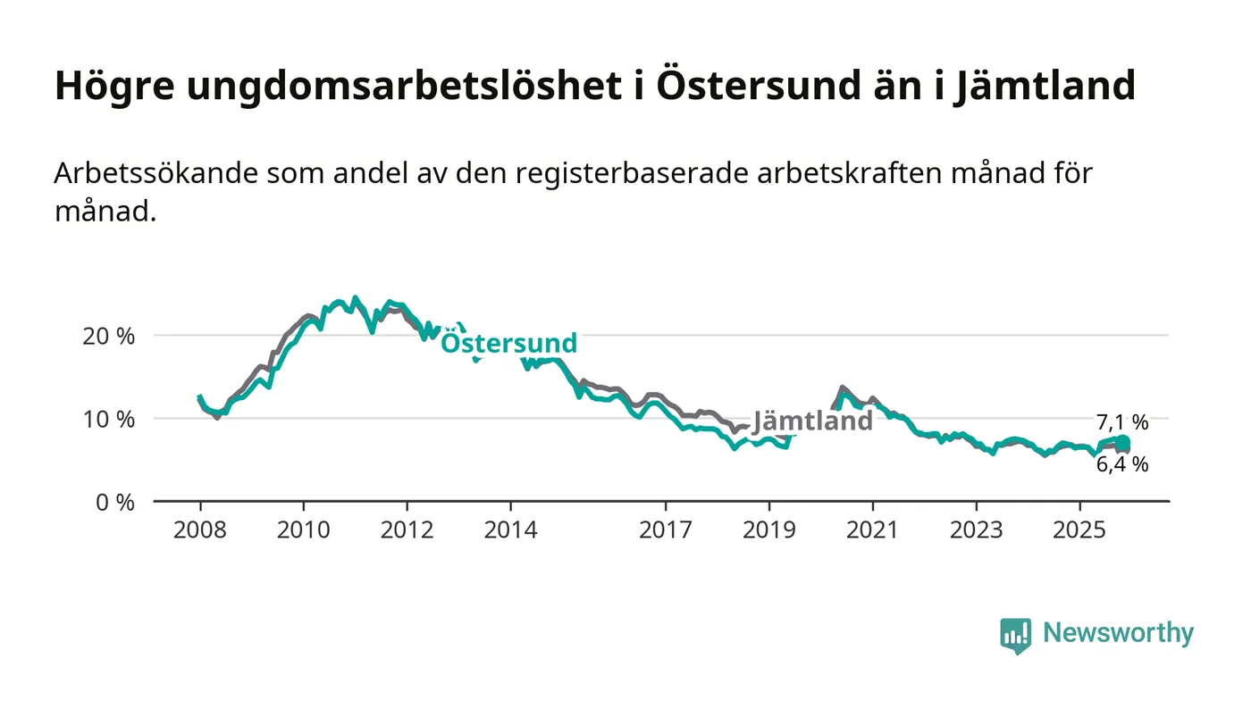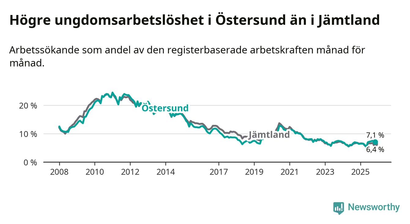 Precis som den totala arbetslösheten ligger ungdomsarbetslösheten i Östersund högre än i Jämtland som helhet. Skillnaden mellan kommunen och länet är 0,7 procentenheter.