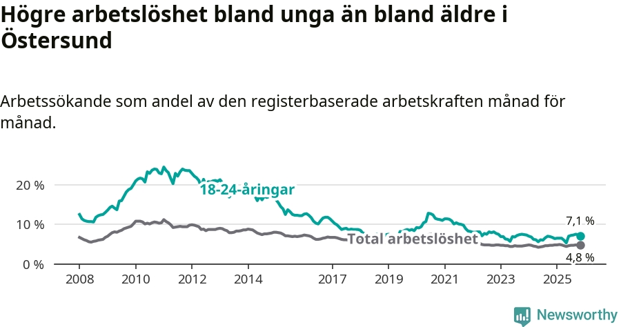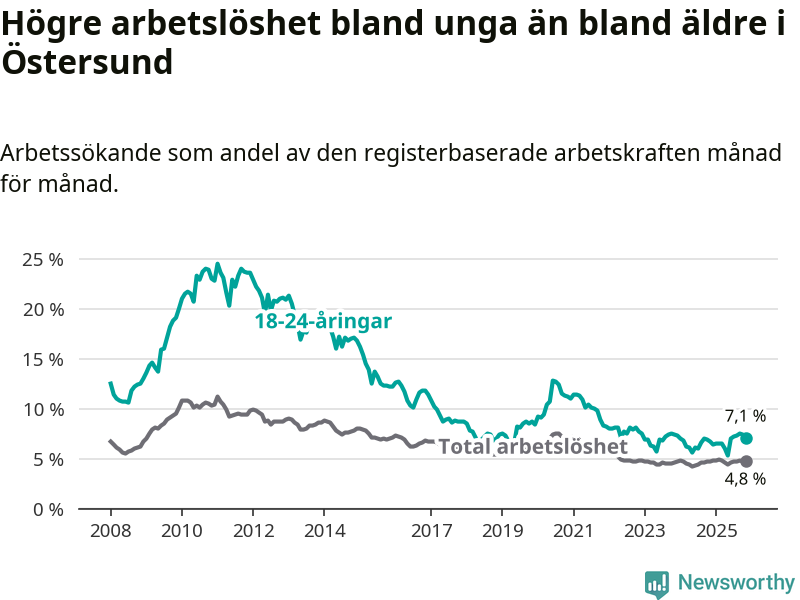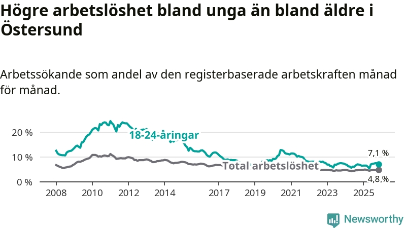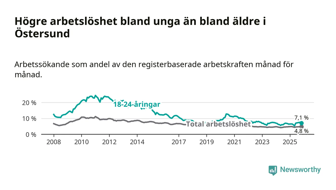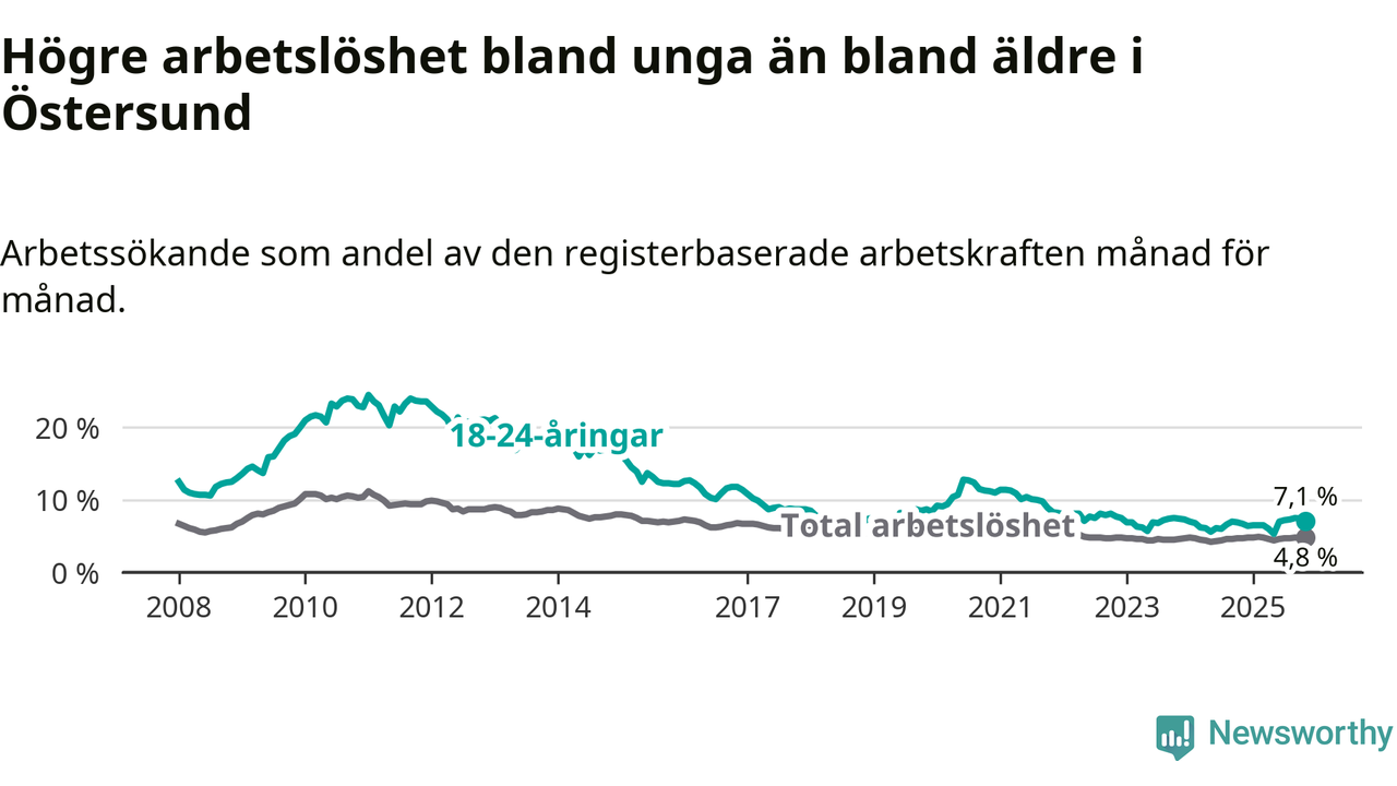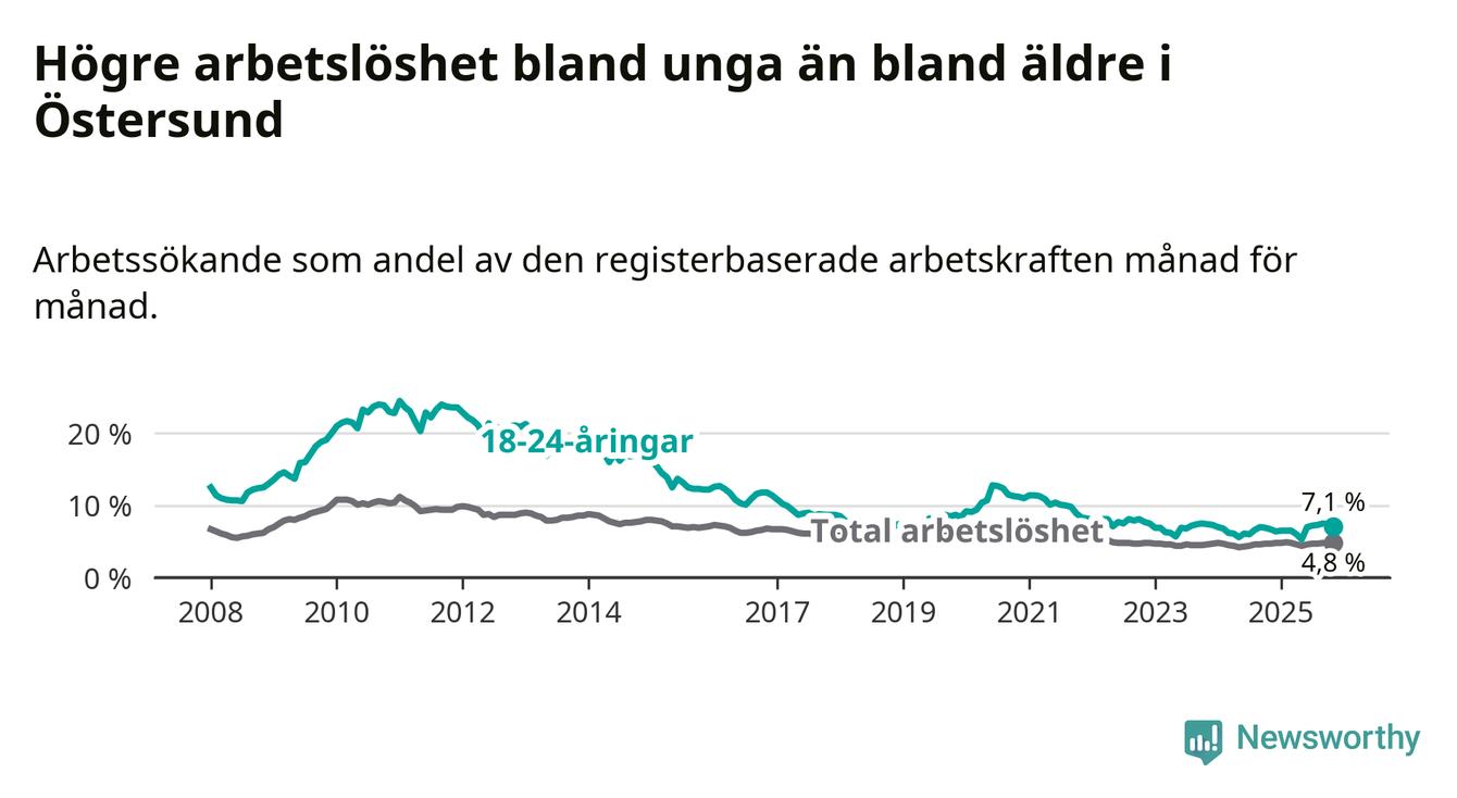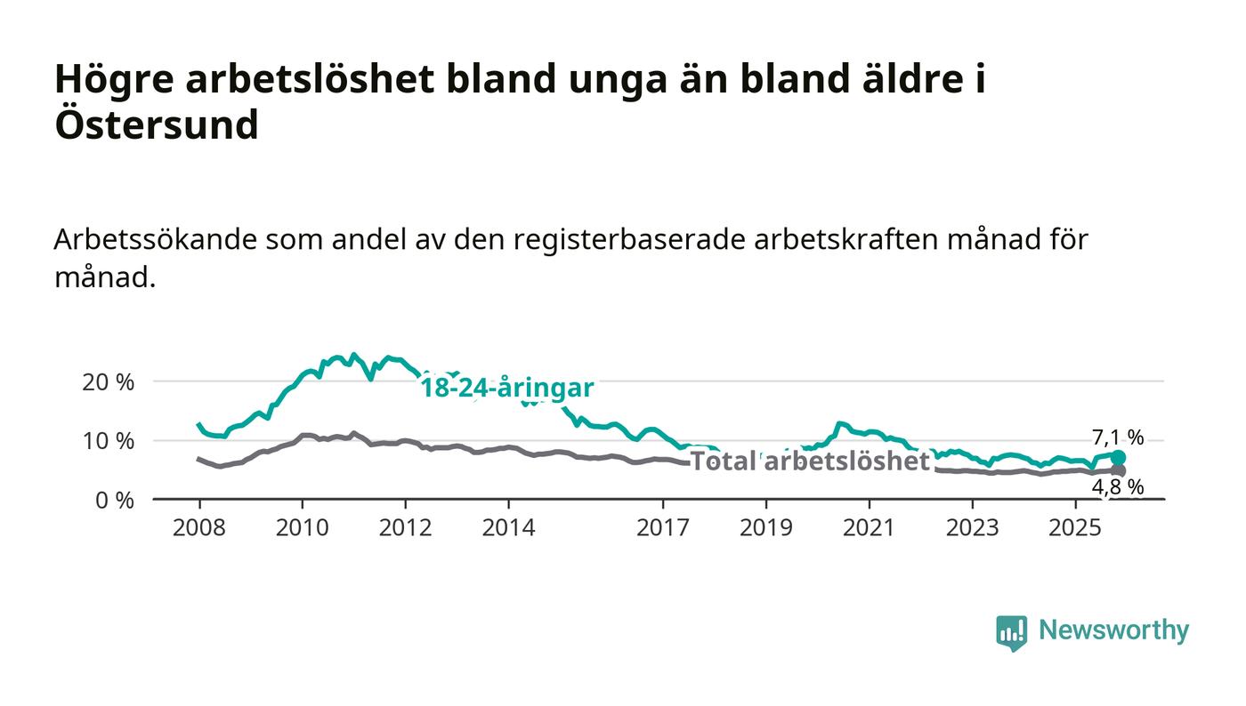 Precis som den totala arbetslösheten ligger ungdomsarbetslösheten i Östersund högre än i Jämtland som helhet. Skillnaden mellan kommunen och länet är 0,7 procentenheter.