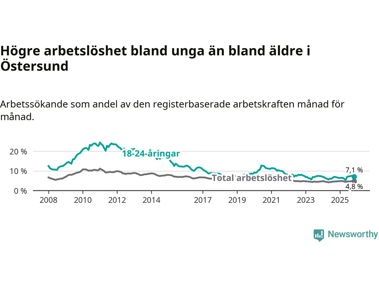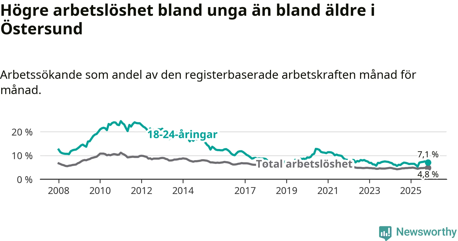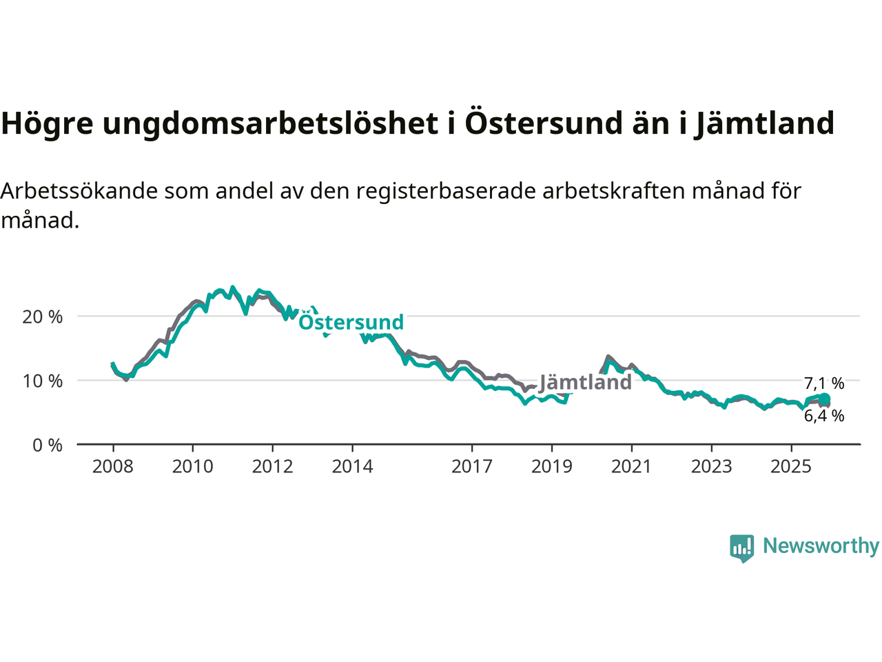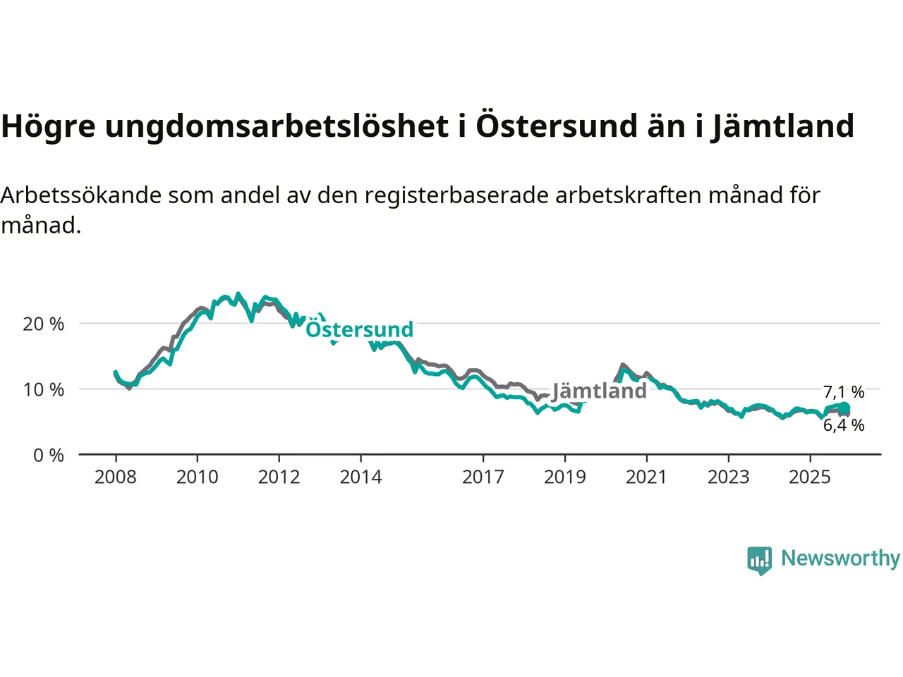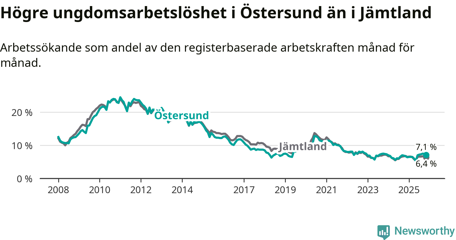 Precis som den totala arbetslösheten ligger ungdomsarbetslösheten i Östersund högre än i Jämtland som helhet. Skillnaden mellan kommunen och länet är 0,7 procentenheter.
