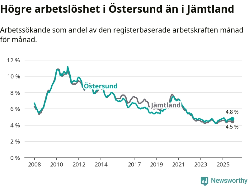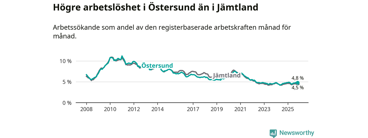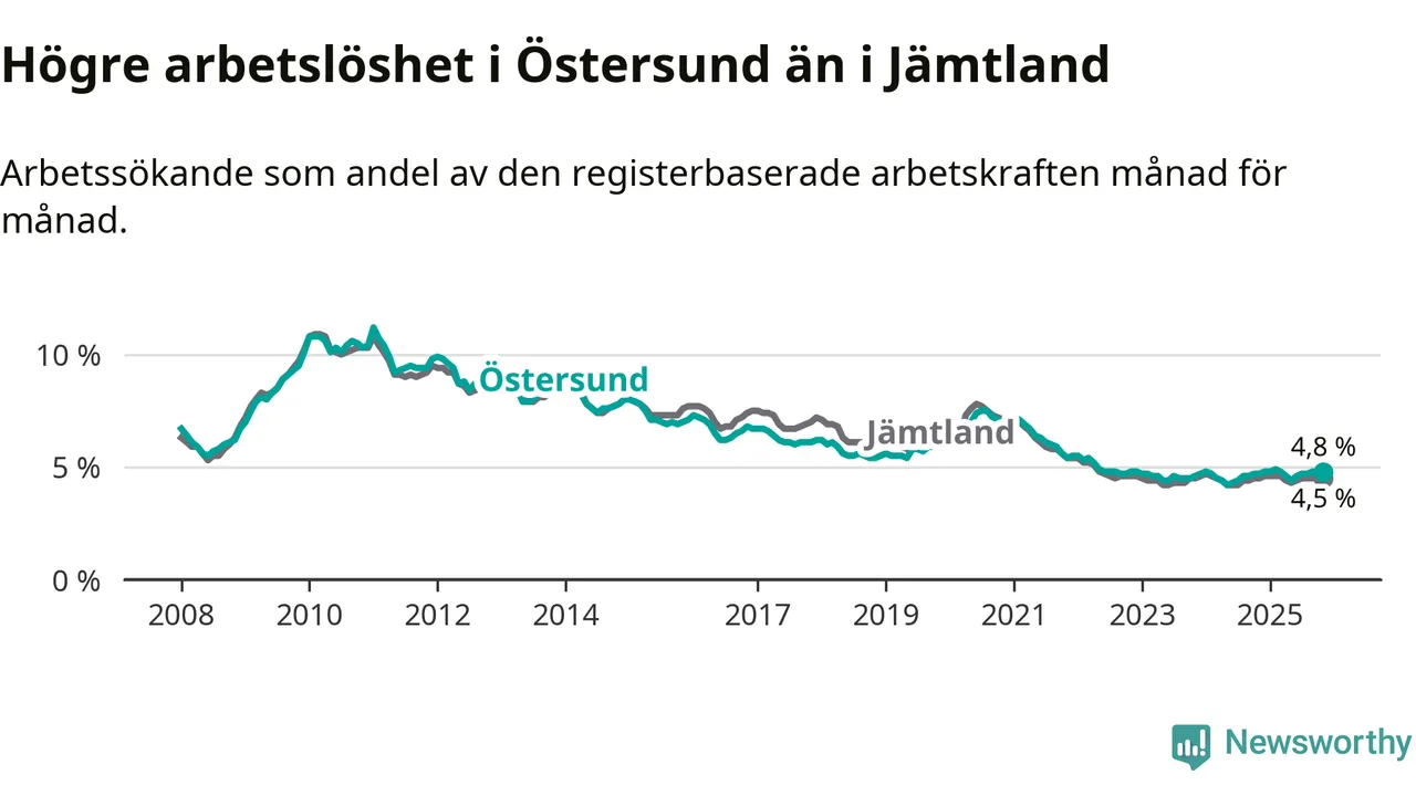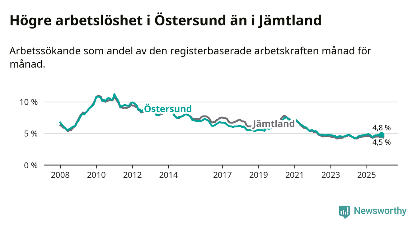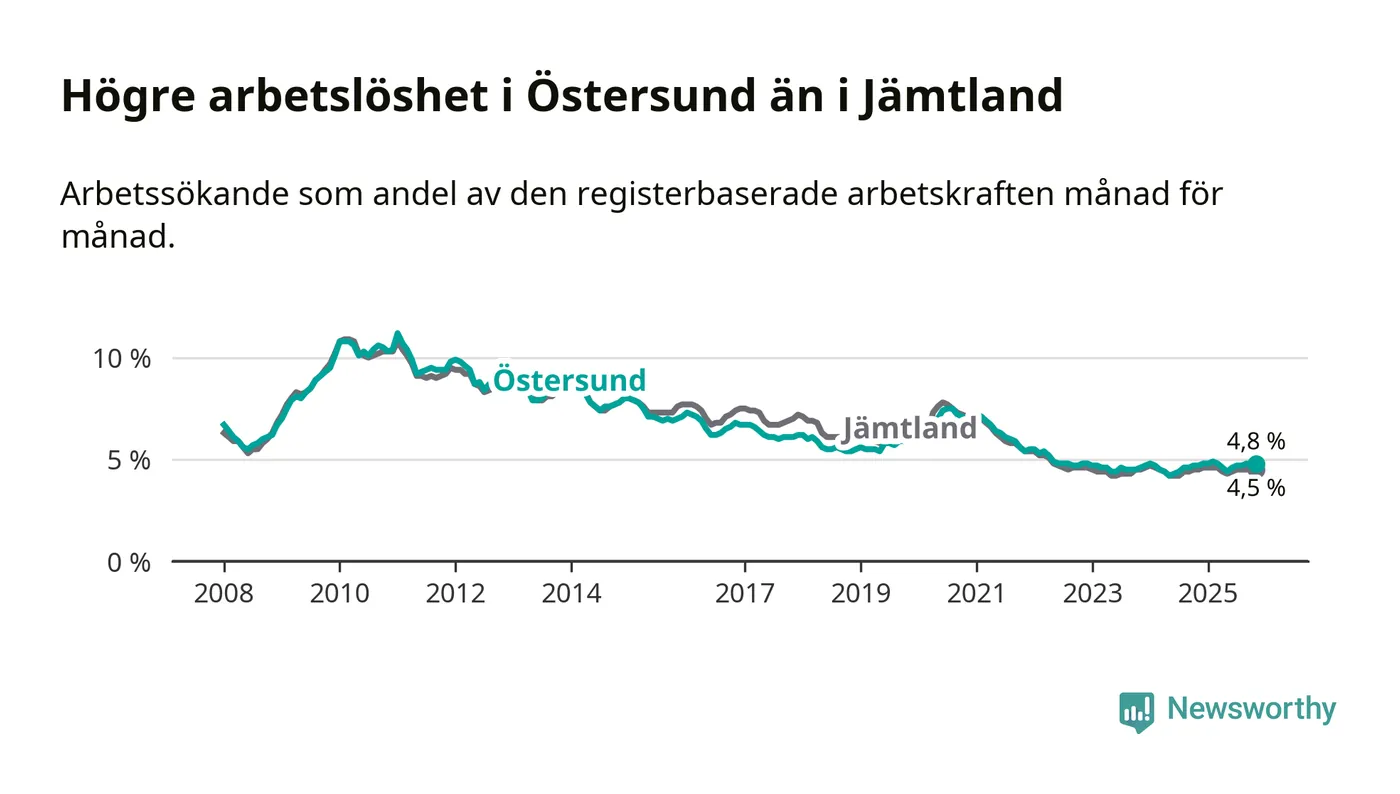 Östersund hade redan tidigare högre arbetslöshet än snittet i hela Jämtlands län och nu växer klyftan (4,8 procent i kommunen, jämfört med 4,5 procent i hela länet). Krokom har den lägsta arbetslösheten i länet (3,1 procent), medan Strömsund har den högsta (6,2 procent). För att Östersund skulle komma ner i samma arbetslöshetsnivå som Krokom skulle 554 personer behöva sysselsättas.