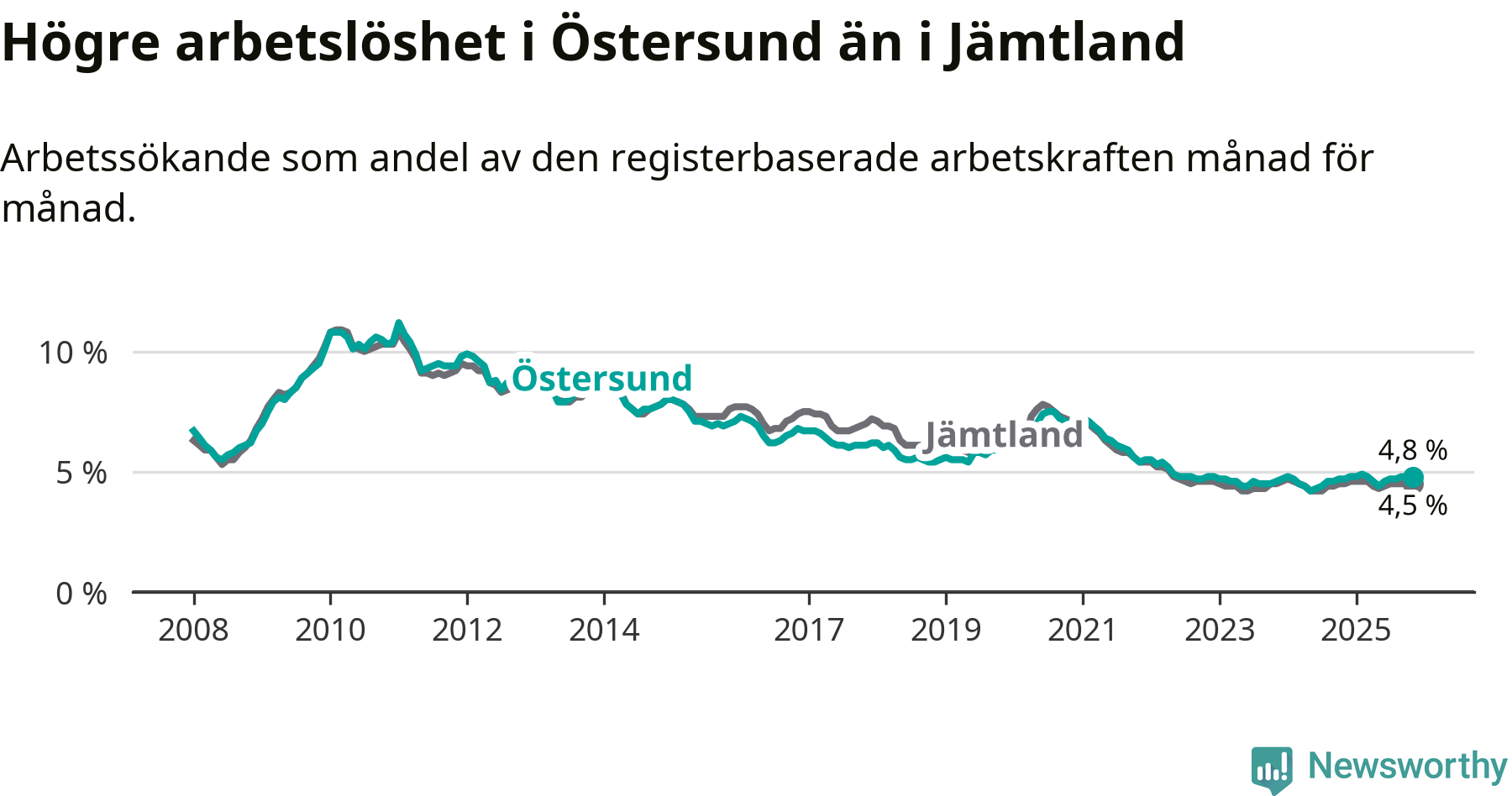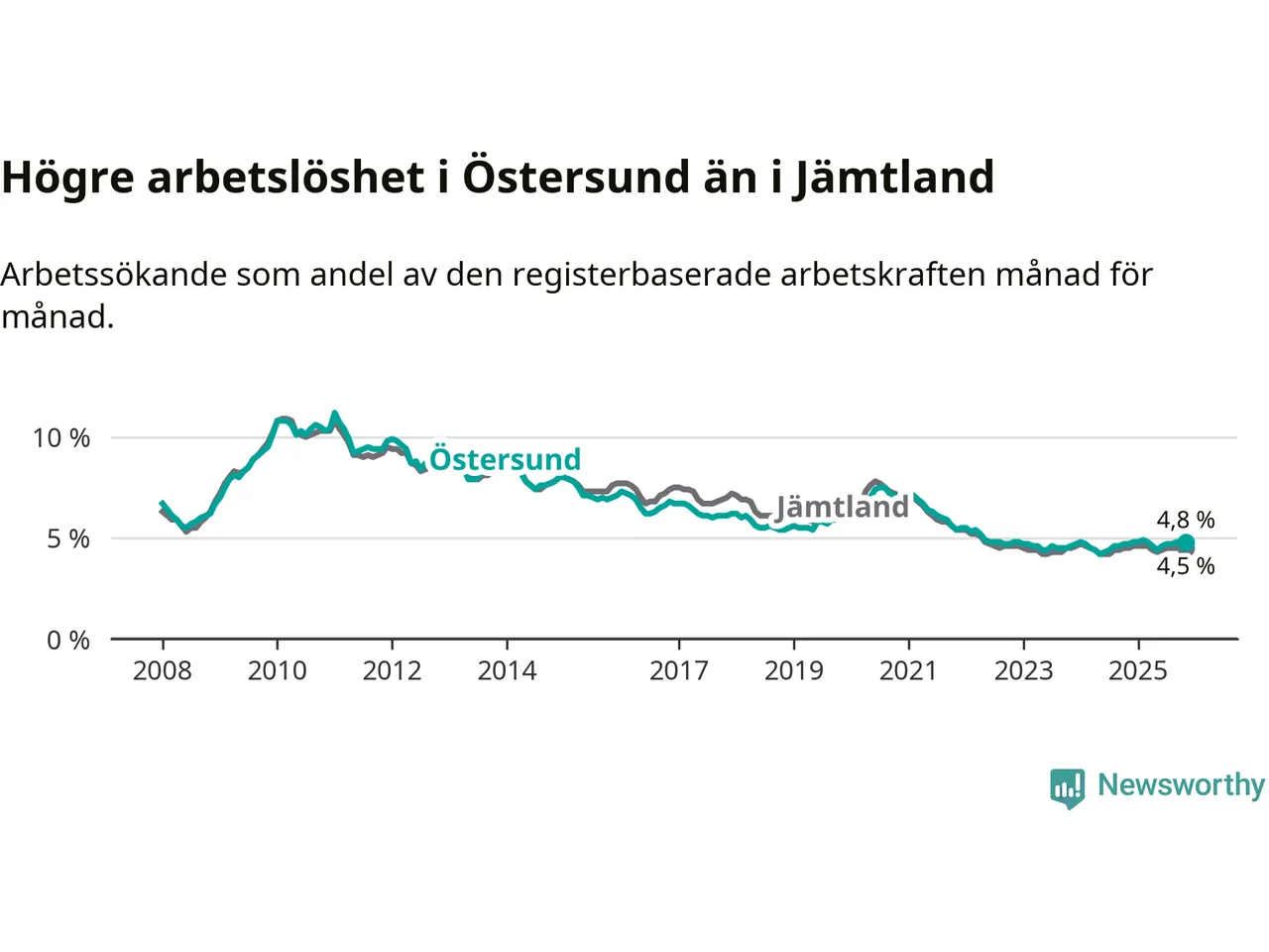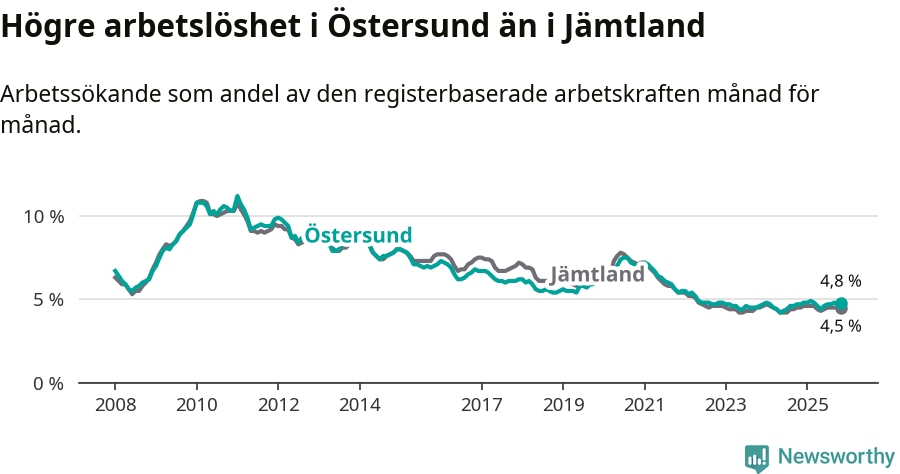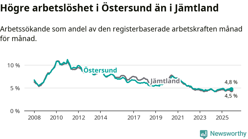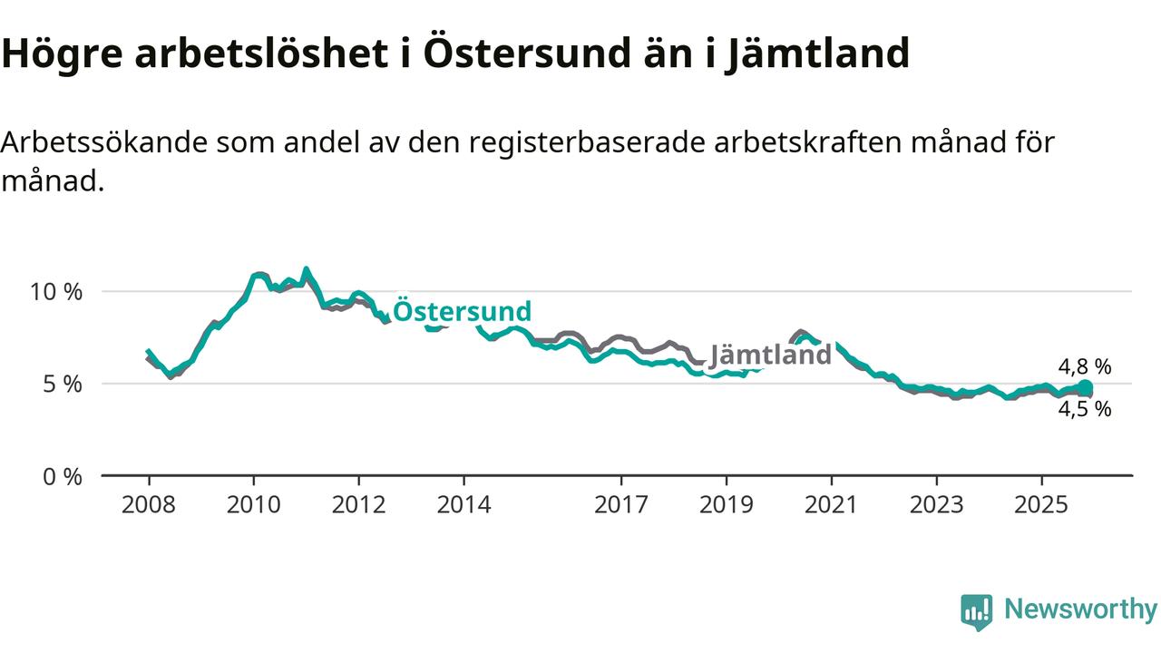 Östersund hade redan tidigare högre arbetslöshet än snittet i hela Jämtlands län och nu växer klyftan (4,8 procent i kommunen, jämfört med 4,5 procent i hela länet). Krokom har den lägsta arbetslösheten i länet (3,1 procent), medan Strömsund har den högsta (6,2 procent). För att Östersund skulle komma ner i samma arbetslöshetsnivå som Krokom skulle 554 personer behöva sysselsättas.