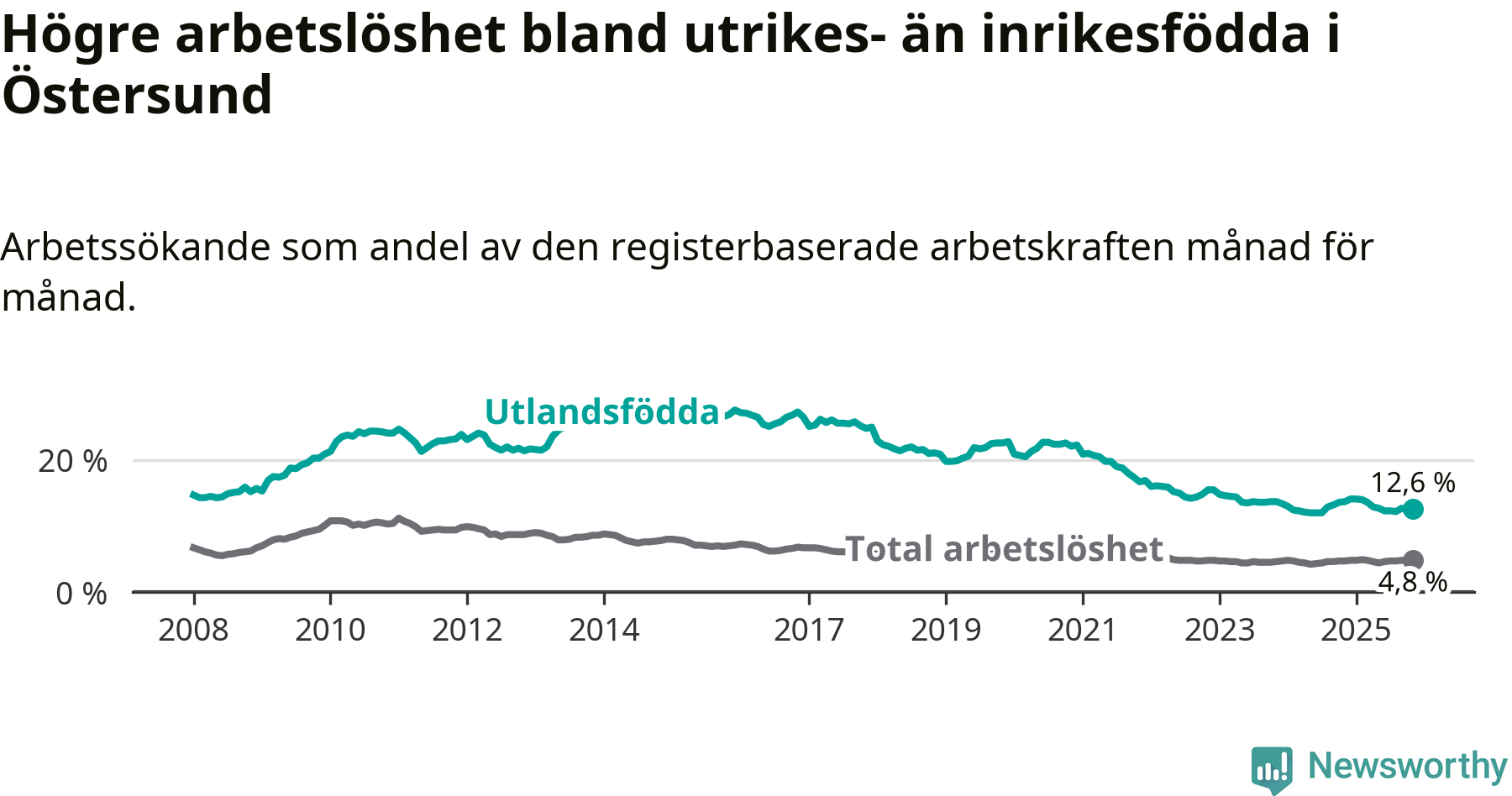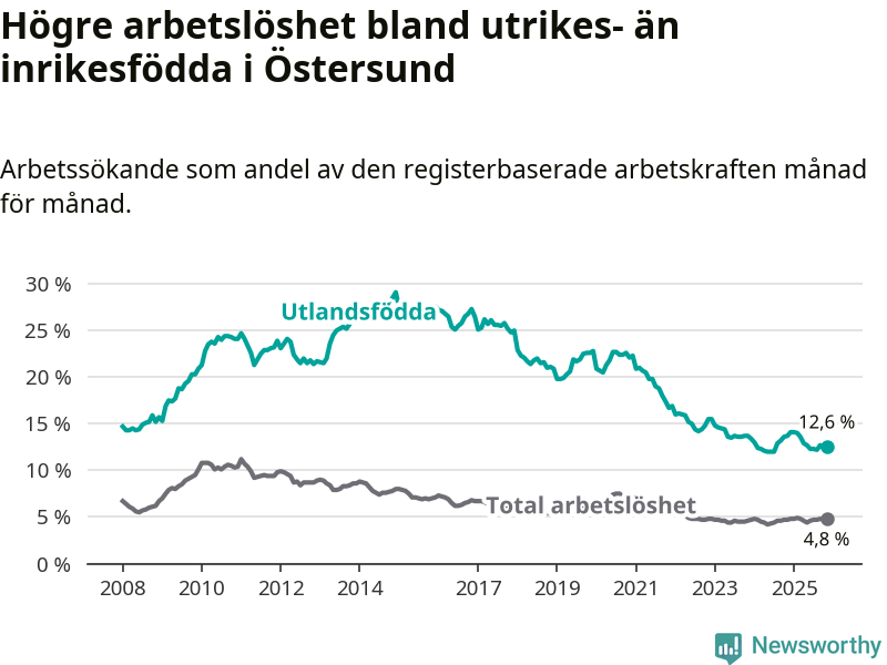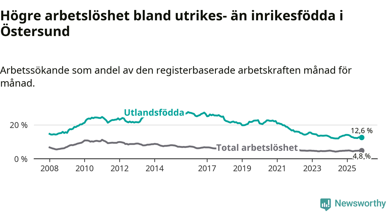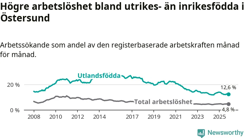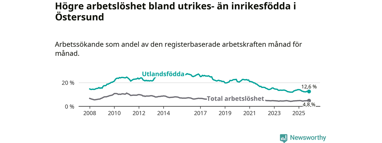 Arbetslösheten bland utlandsfödda var 12,6 procent i Östersund under november månad, motsvarande 570 av 4 524 personer. Det är 1,1 procentenheter färre än vid samma tidpunkt i fjol (−28 om man räknar personer).