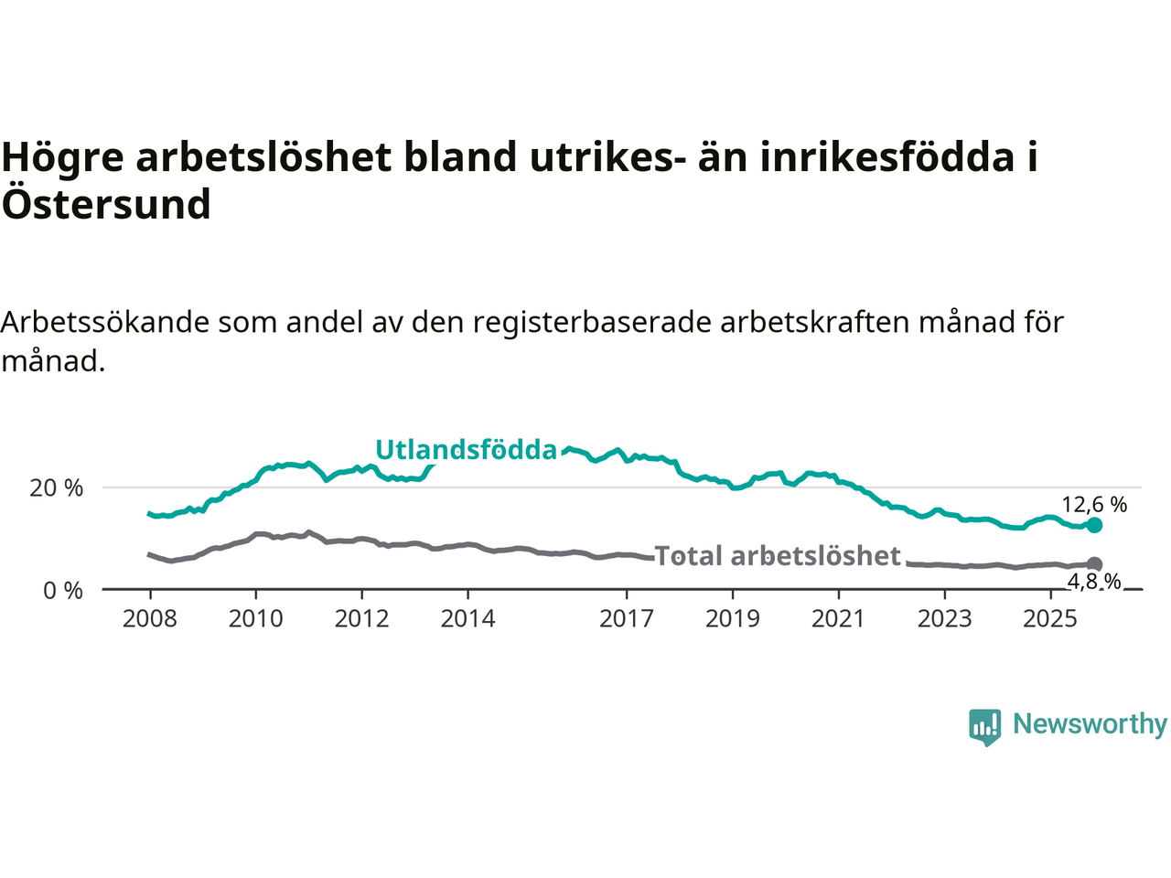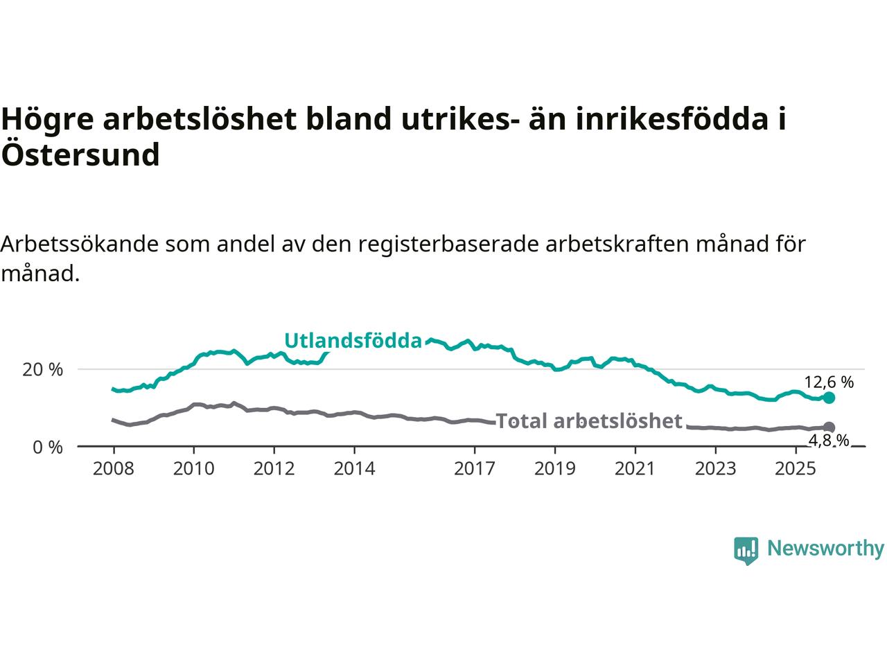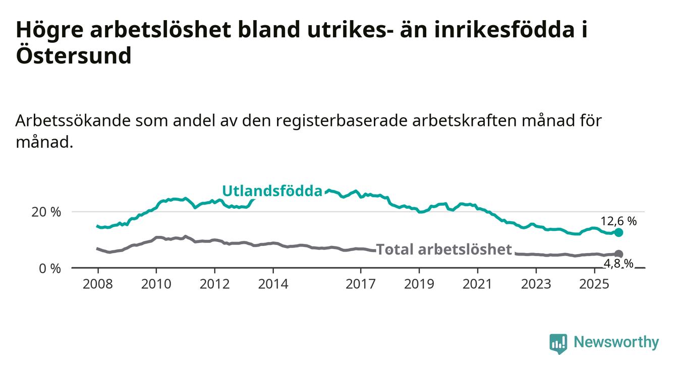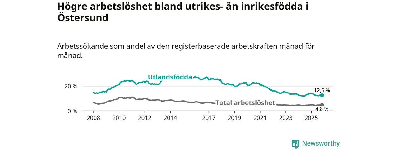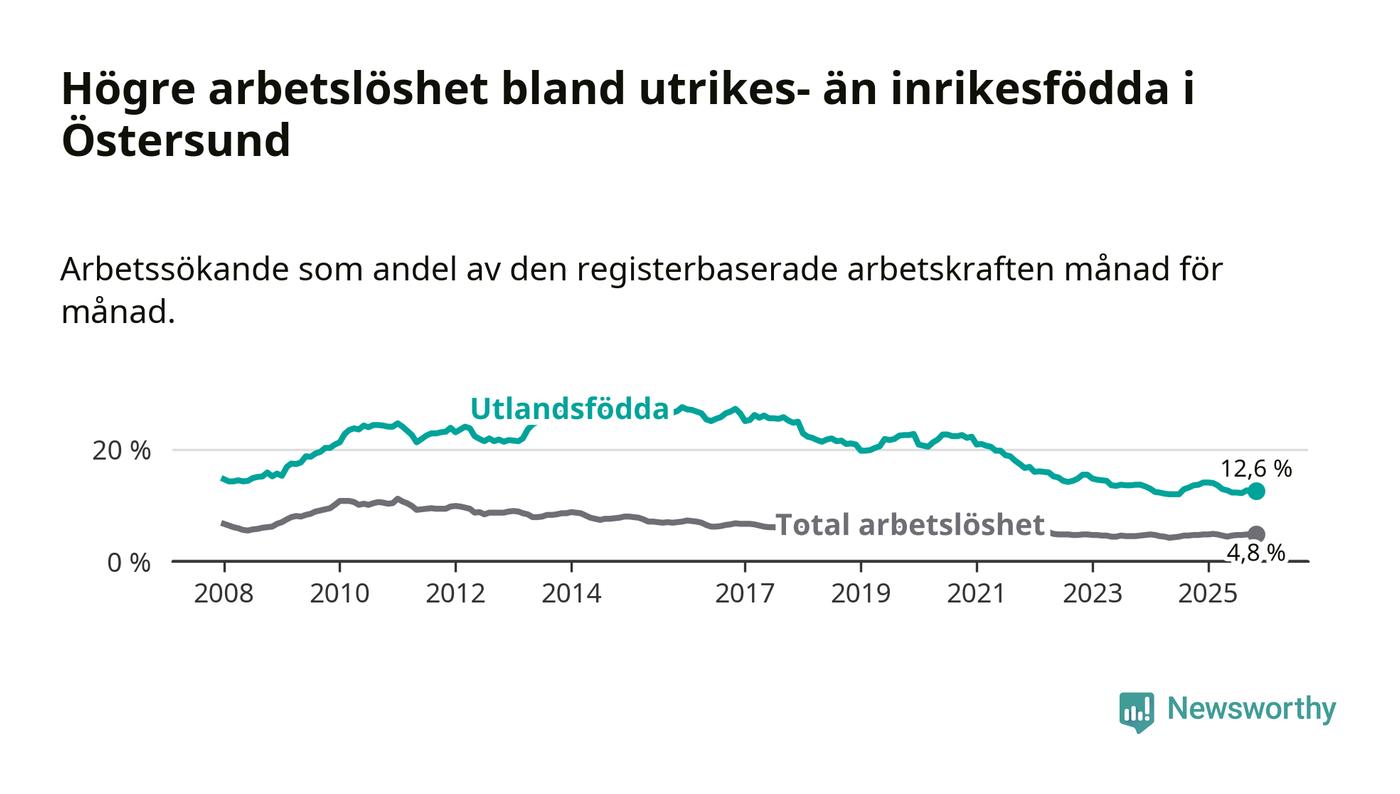 Skillnaden i arbetslöshet mellan utrikesfödda och hela befolkningen är 7,8 procentenheter i Östersund. Det är en mindre skillnad än för ett år sedan (−1,2 procentenheter).