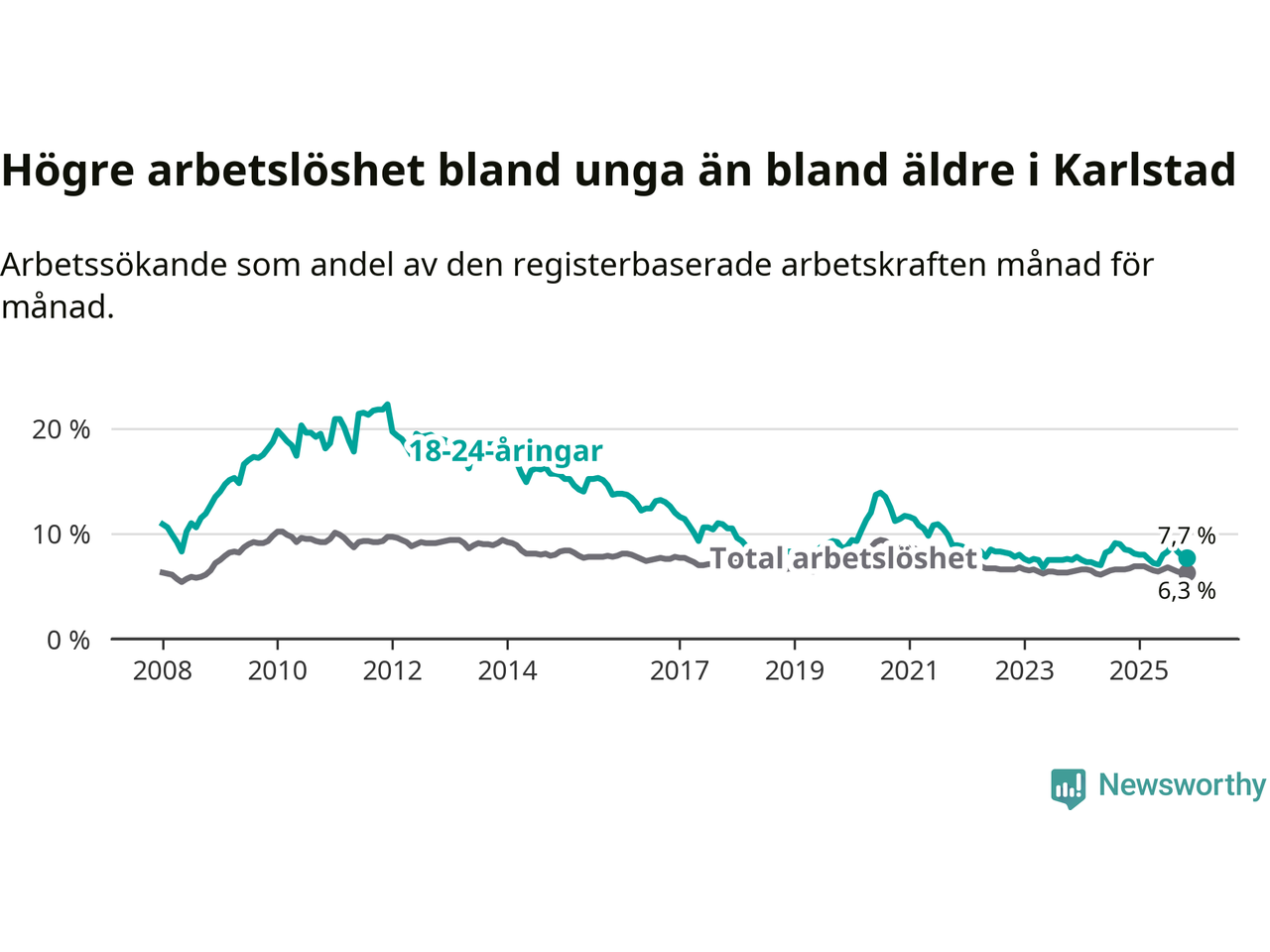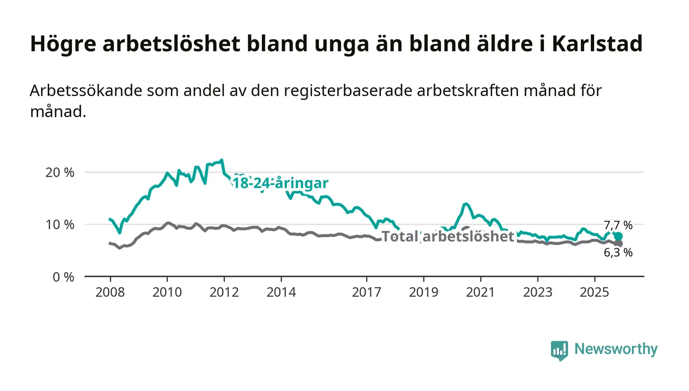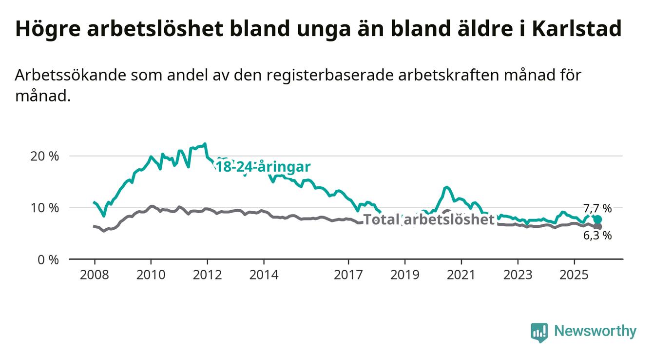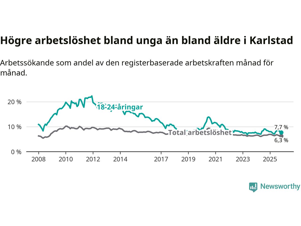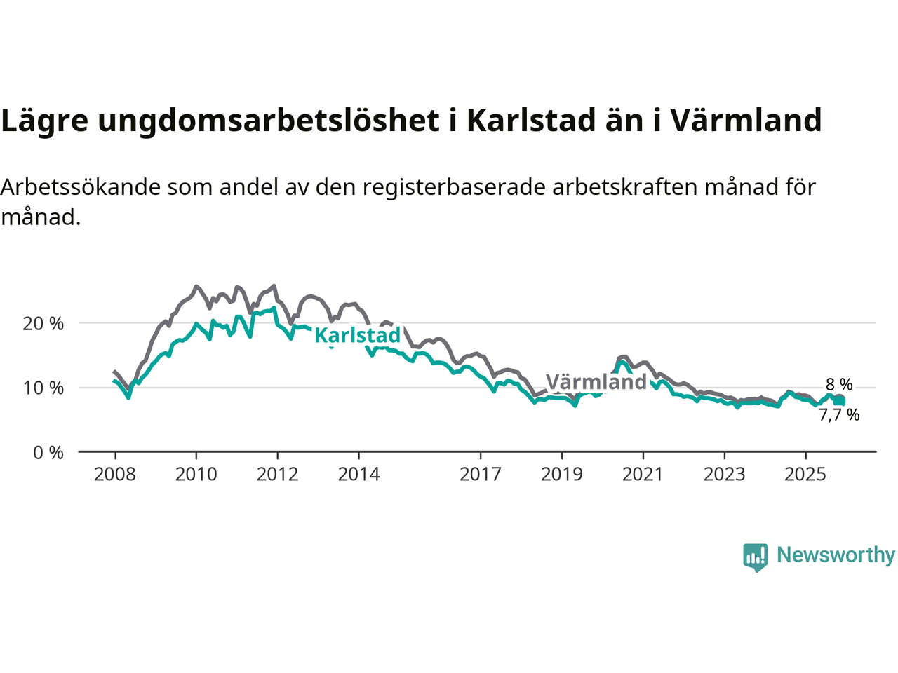 Medan Karlstad har högre total arbetslöshet än Värmland, ligger ungdomsarbetslösheten 0,3 procentenheter lägre i Karlstad.