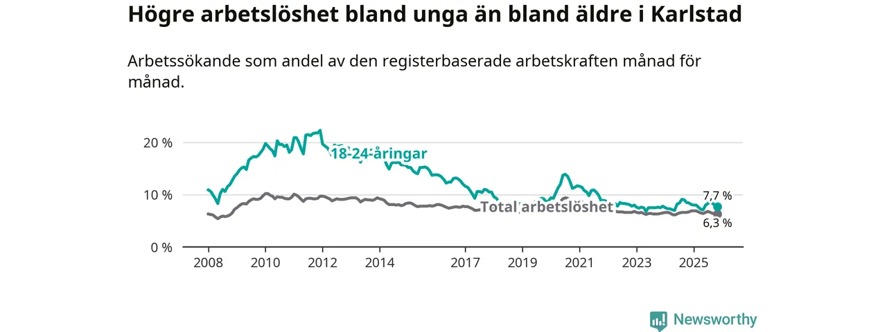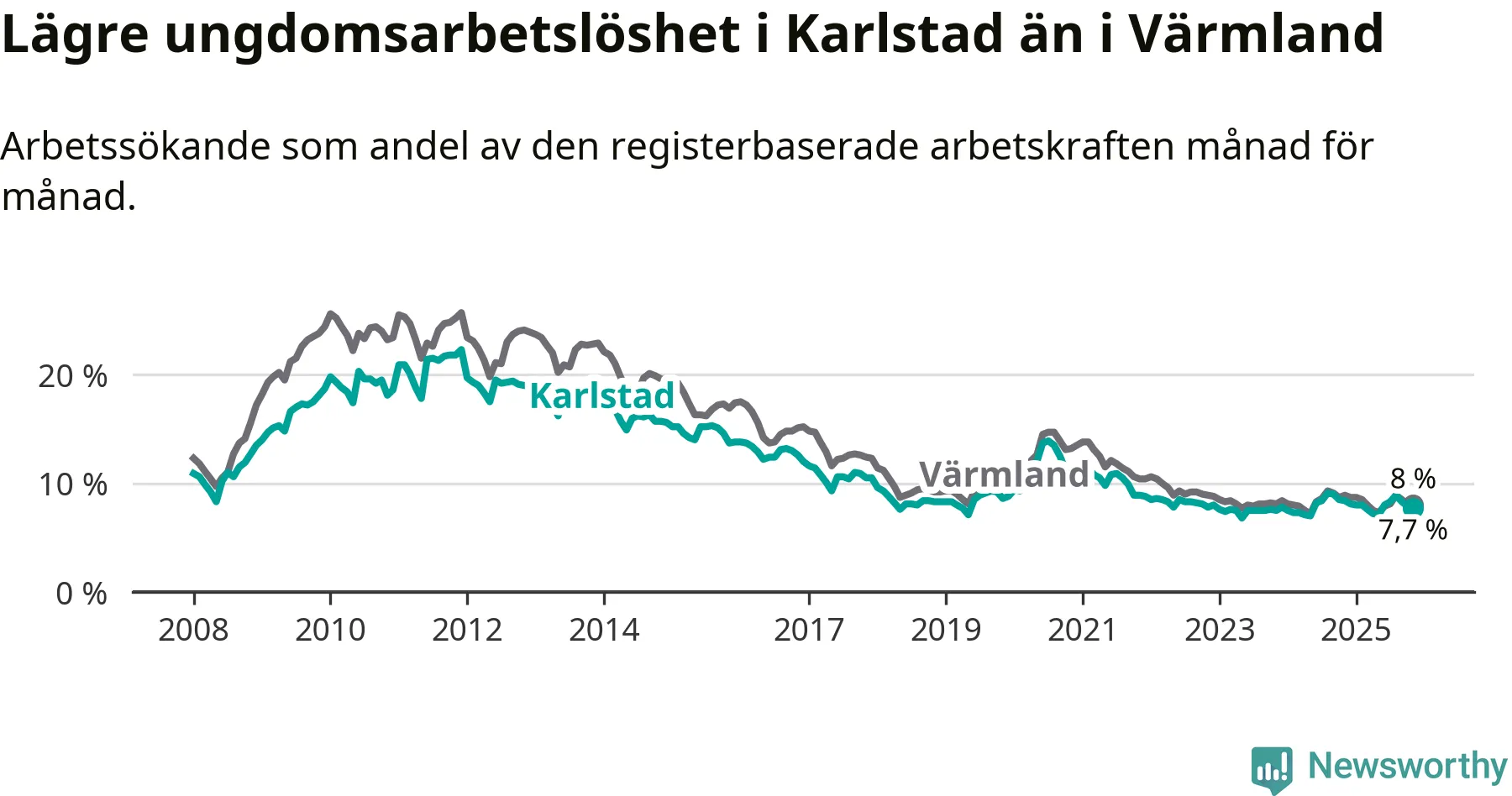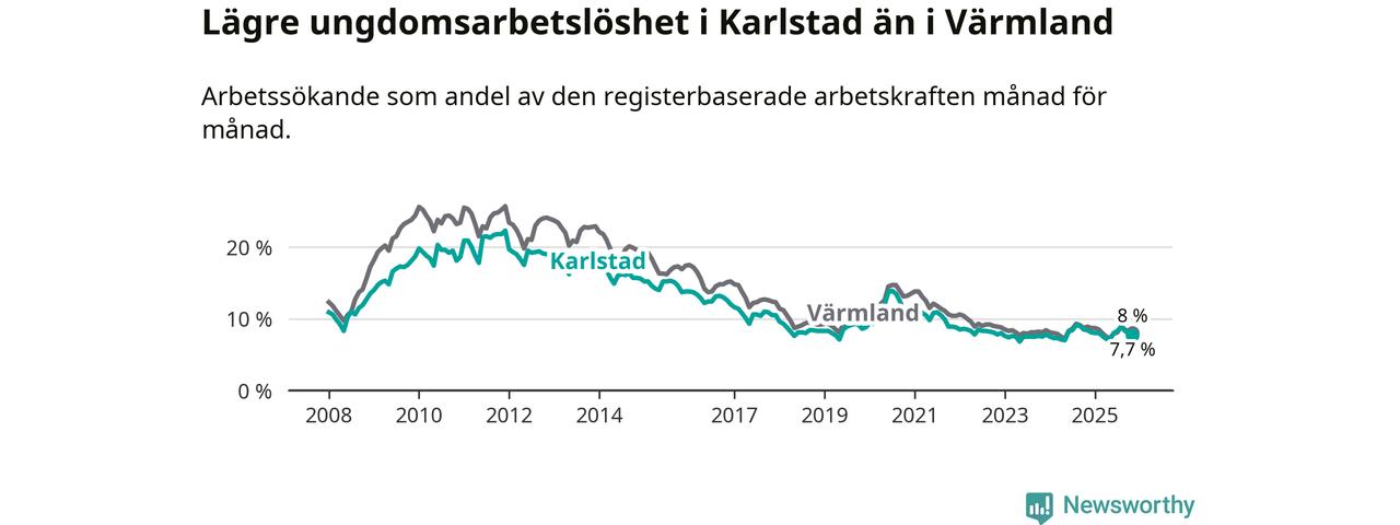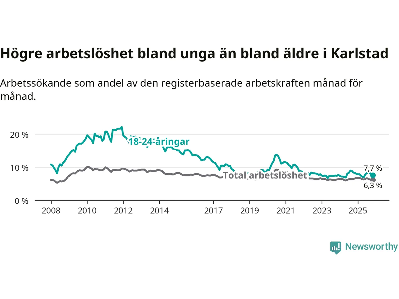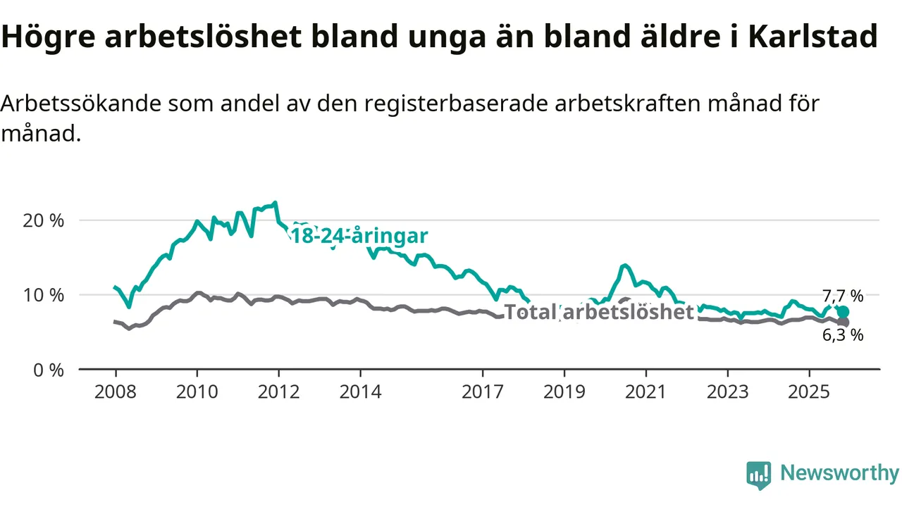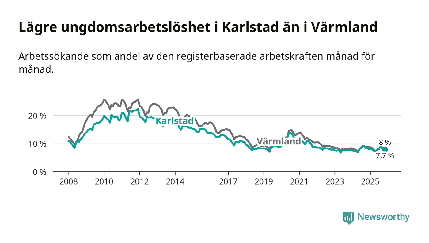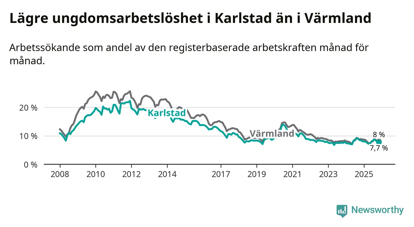 Medan Karlstad har högre total arbetslöshet än Värmland, ligger ungdomsarbetslösheten 0,3 procentenheter lägre i Karlstad.