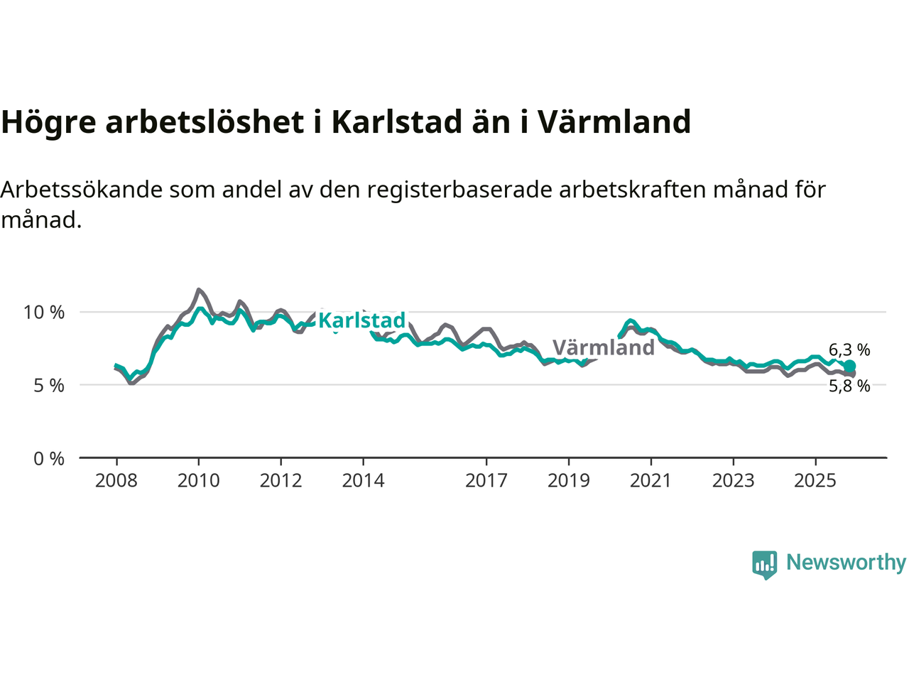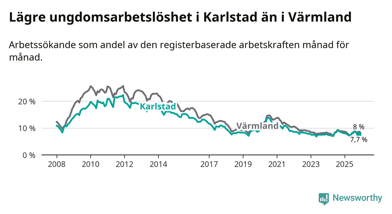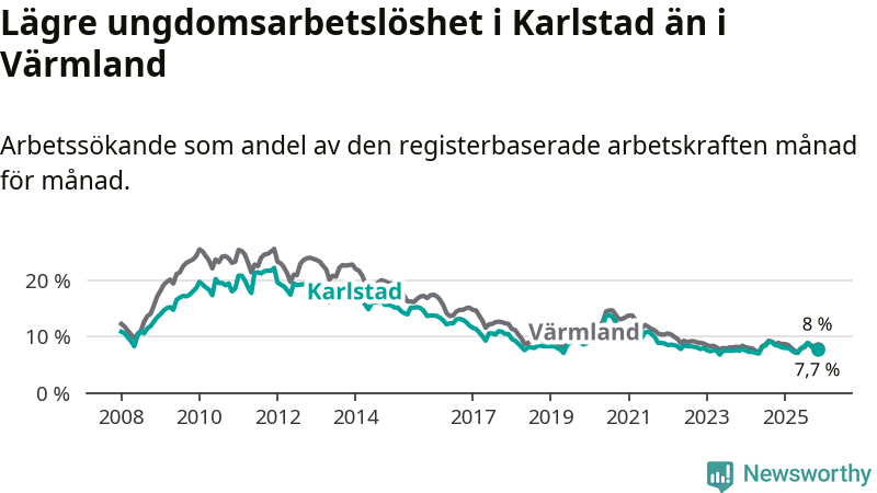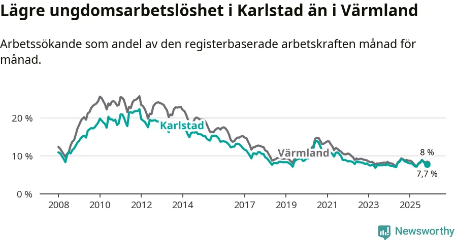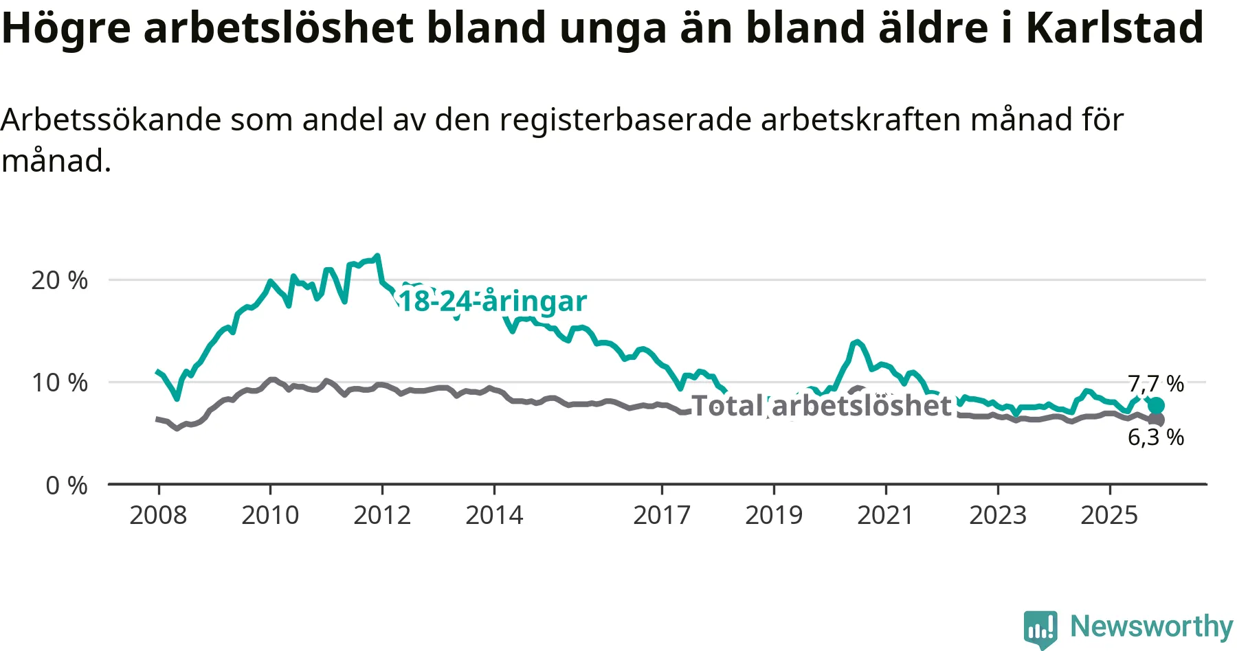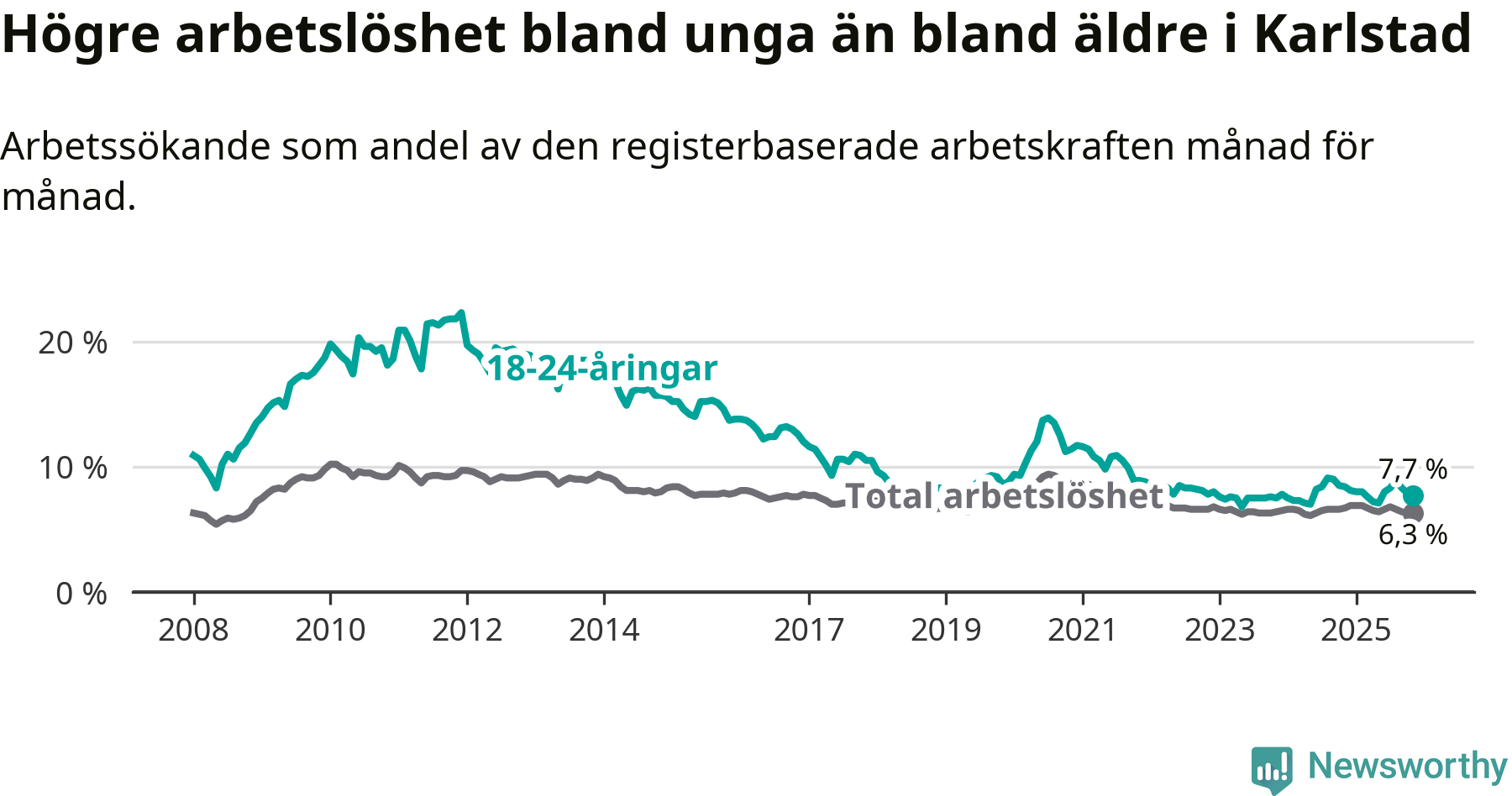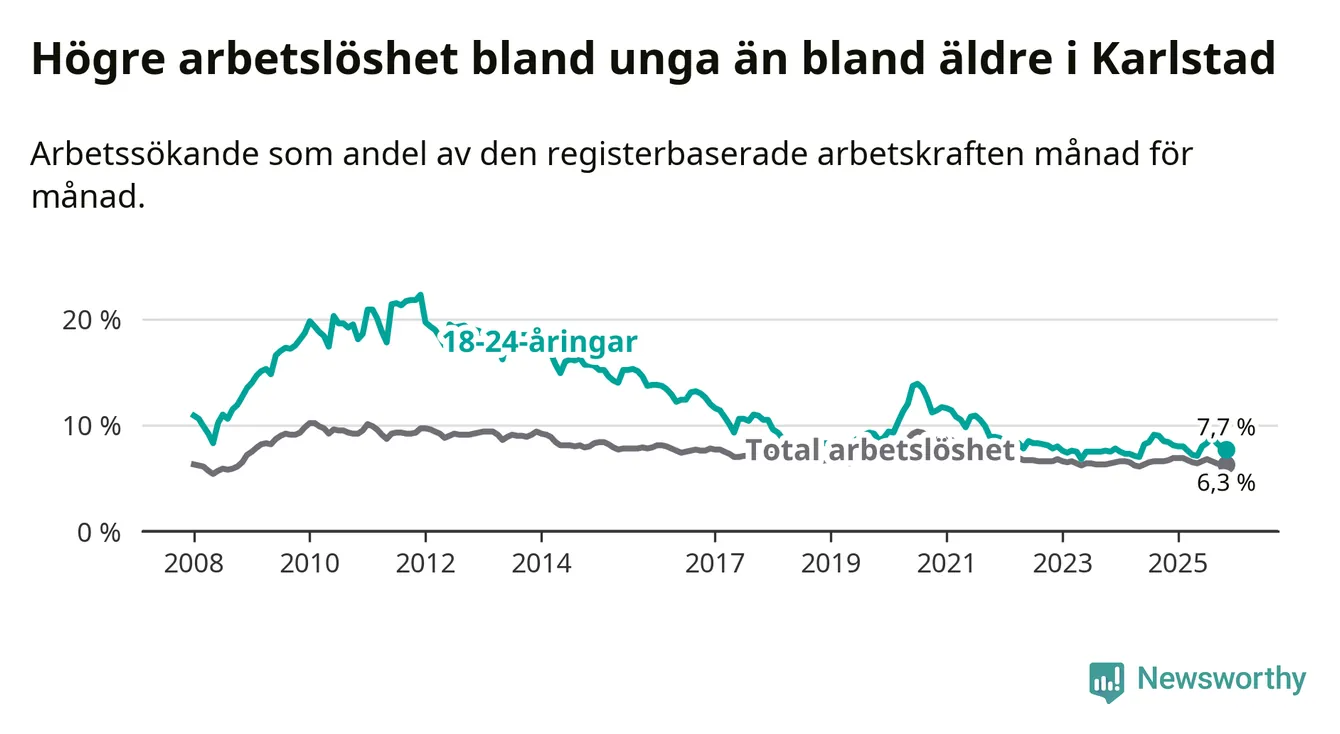 Medan Karlstad har högre total arbetslöshet än Värmland, ligger ungdomsarbetslösheten 0,3 procentenheter lägre i Karlstad.