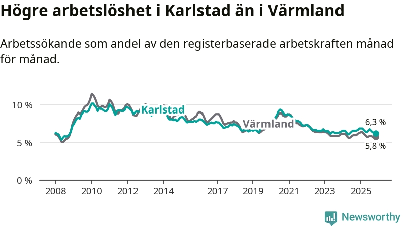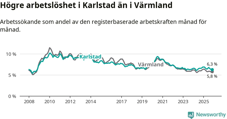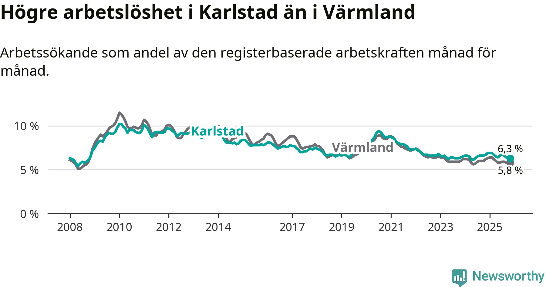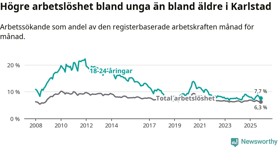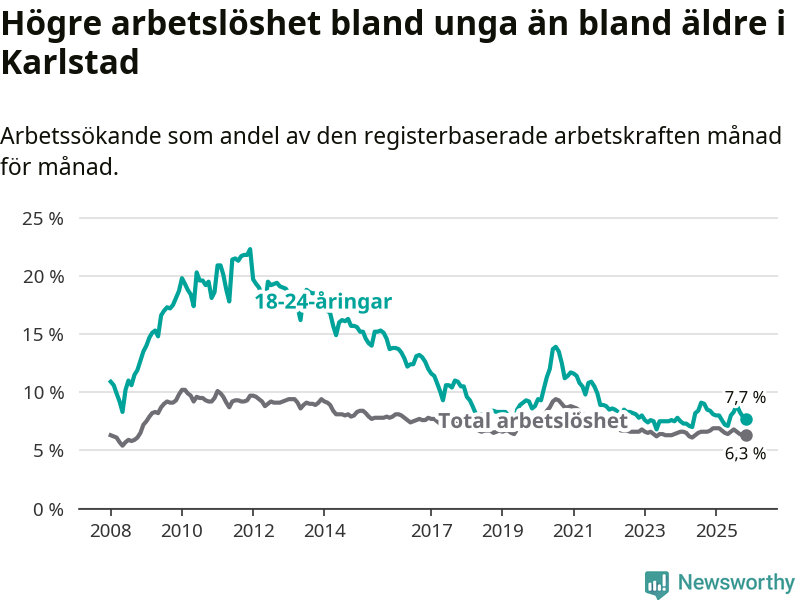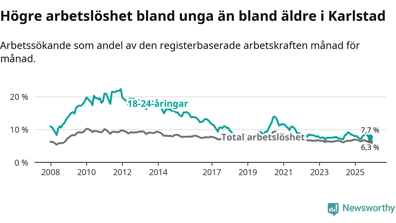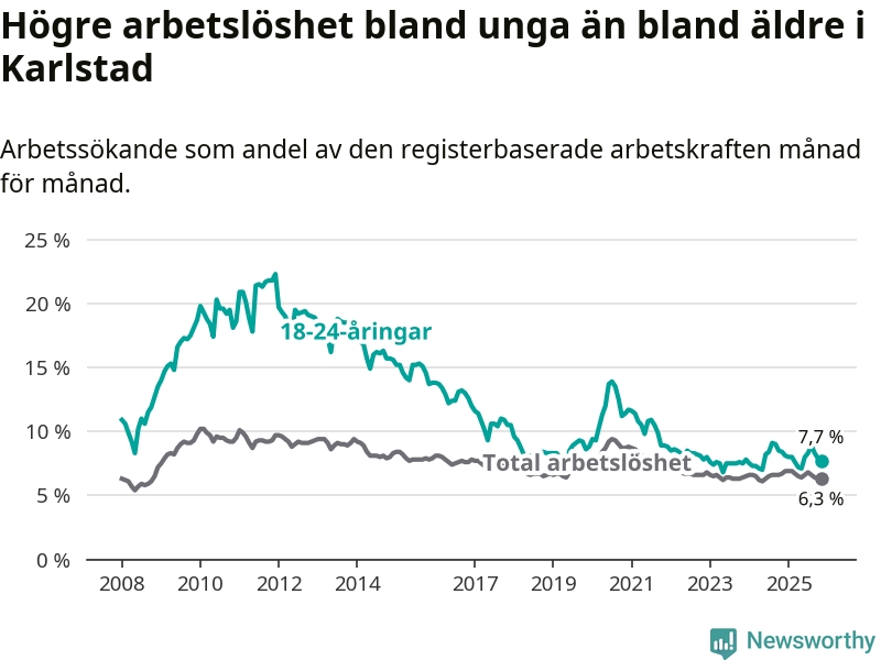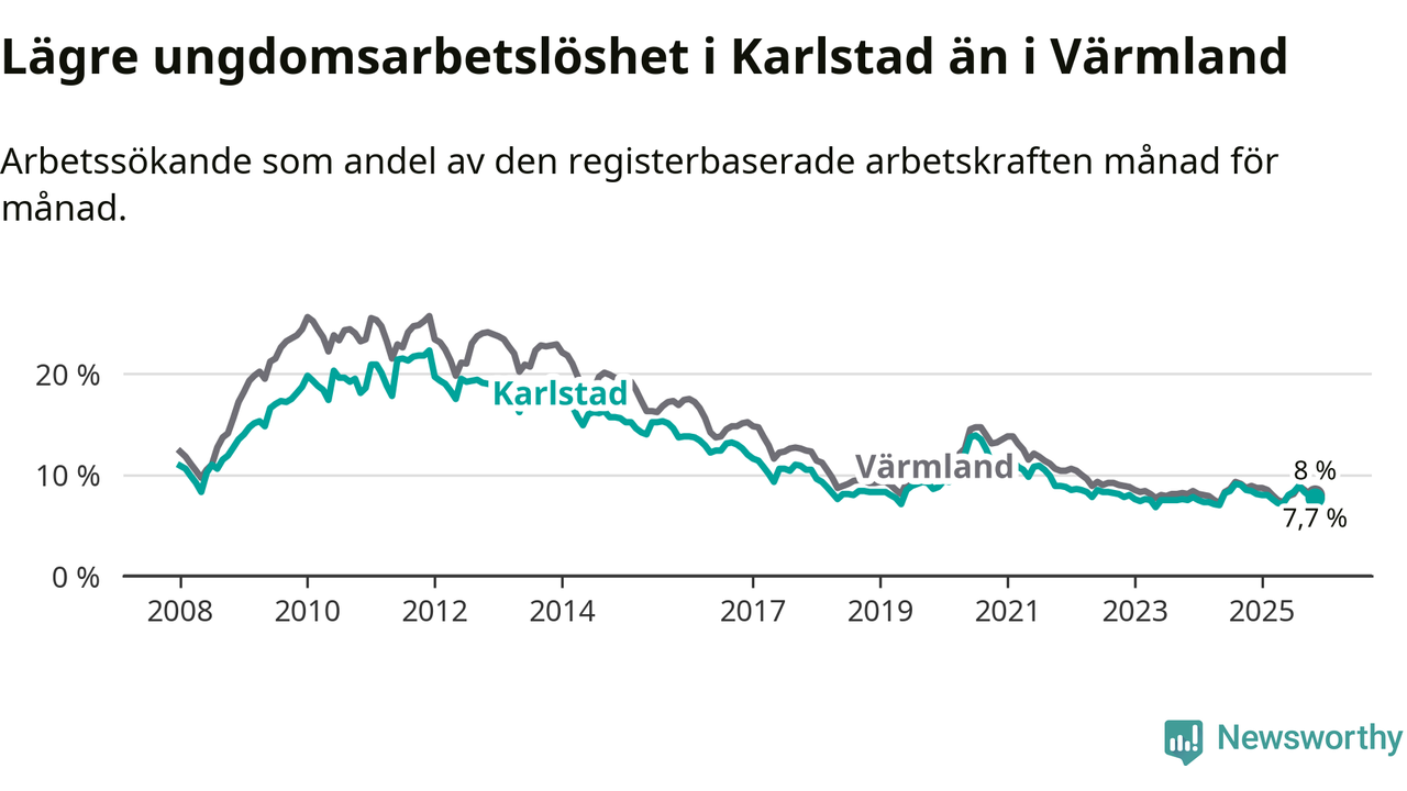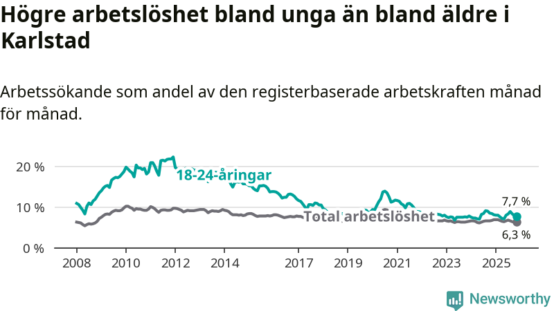Medan Karlstad har högre total arbetslöshet än Värmland, ligger ungdomsarbetslösheten 0,3 procentenheter lägre i Karlstad.