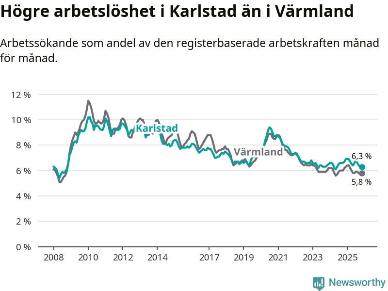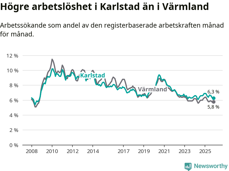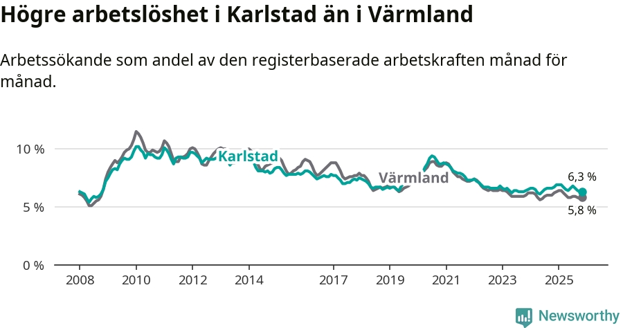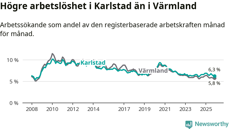 Även om arbetslösheten i Karlstad alltså minskar, så ligger den fortfarande över snittet i hela Värmlands län (6,3 procent i kommunen, jämfört med 5,8 procent i hela länet). Torsby har den lägsta arbetslösheten i länet (3,5 procent), medan Filipstad har den högsta (8,5 procent). För att Karlstad skulle komma ner i samma arbetslöshetsnivå som Torsby skulle 1 406 personer behöva sysselsättas.