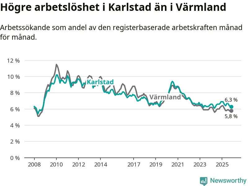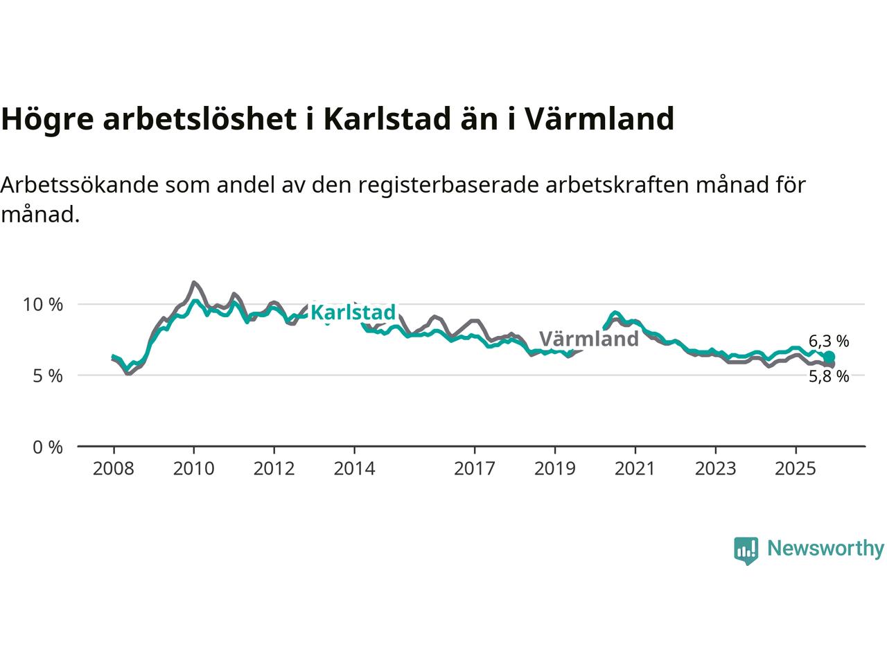 Under november månad rapporterade Karlstads kommun en total arbetslöshet på 6,3 procent. Det är en minskning jämfört med samma tidpunkt i fjol (−0,4 procentenheter). Även i Värmlands län sjunker arbetslösheten .