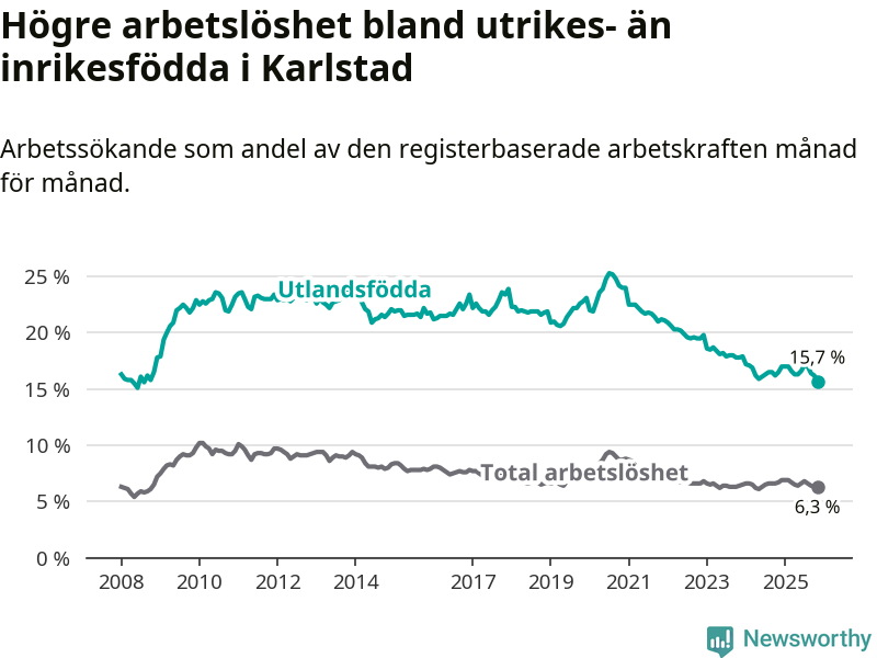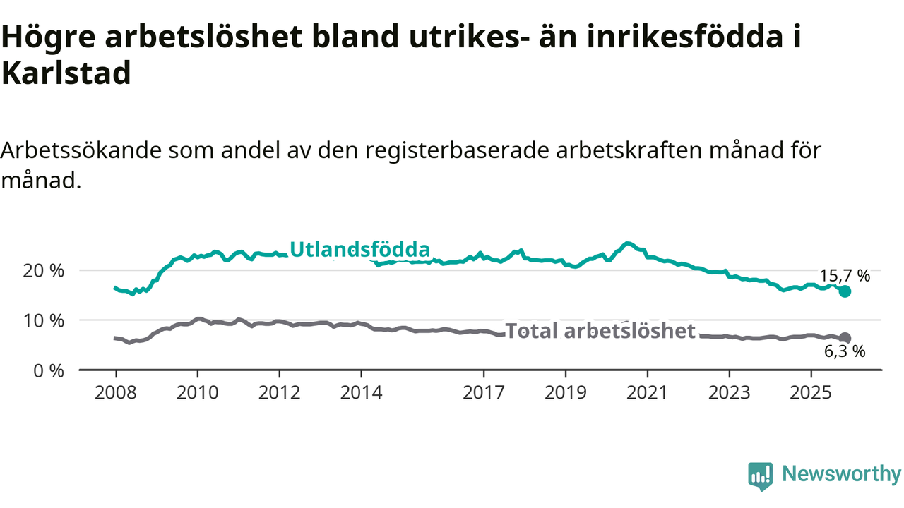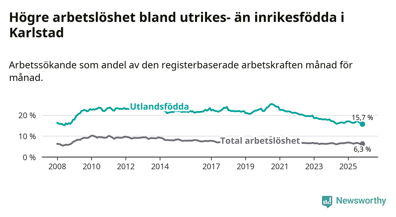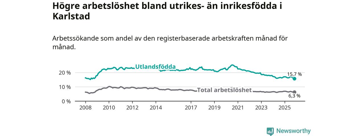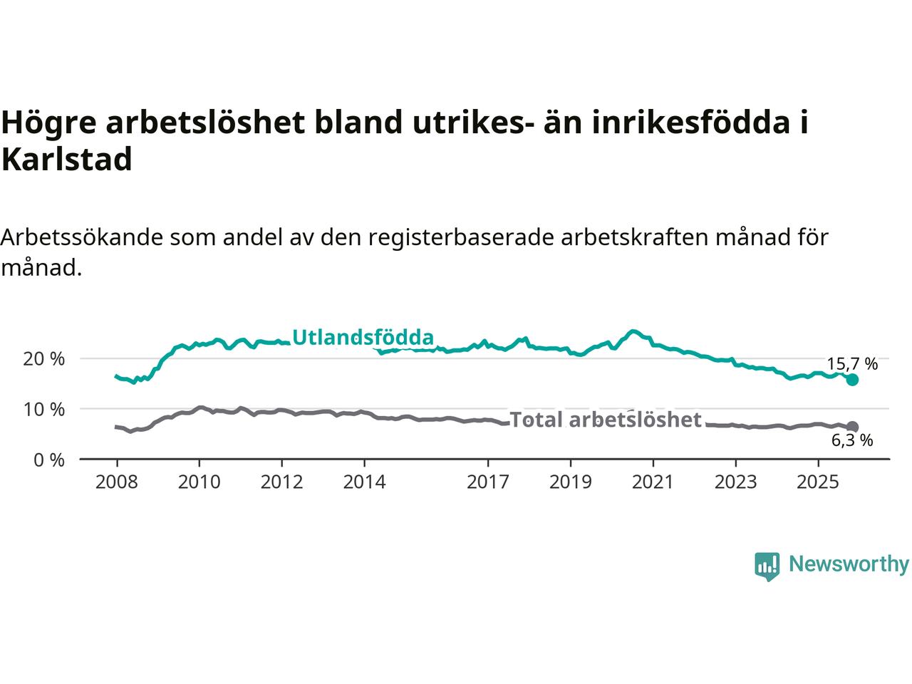 Arbetslösheten bland utlandsfödda var 15,7 procent i Karlstad under november månad, motsvarande 1 418 av 9 032 personer. Det är 0,8 procentenheter färre än vid samma tidpunkt i fjol (−45 om man räknar personer). Den nuvarande arbetslöshetsnivån är den lägsta sedan augusti 2008. Den senaste månadens nedgång innebär ett trendbrott. Under de ett föregående månaderna hade arbetslösheten bland utlandsfödda varit högre än motsvarande tidpunkt året innan.