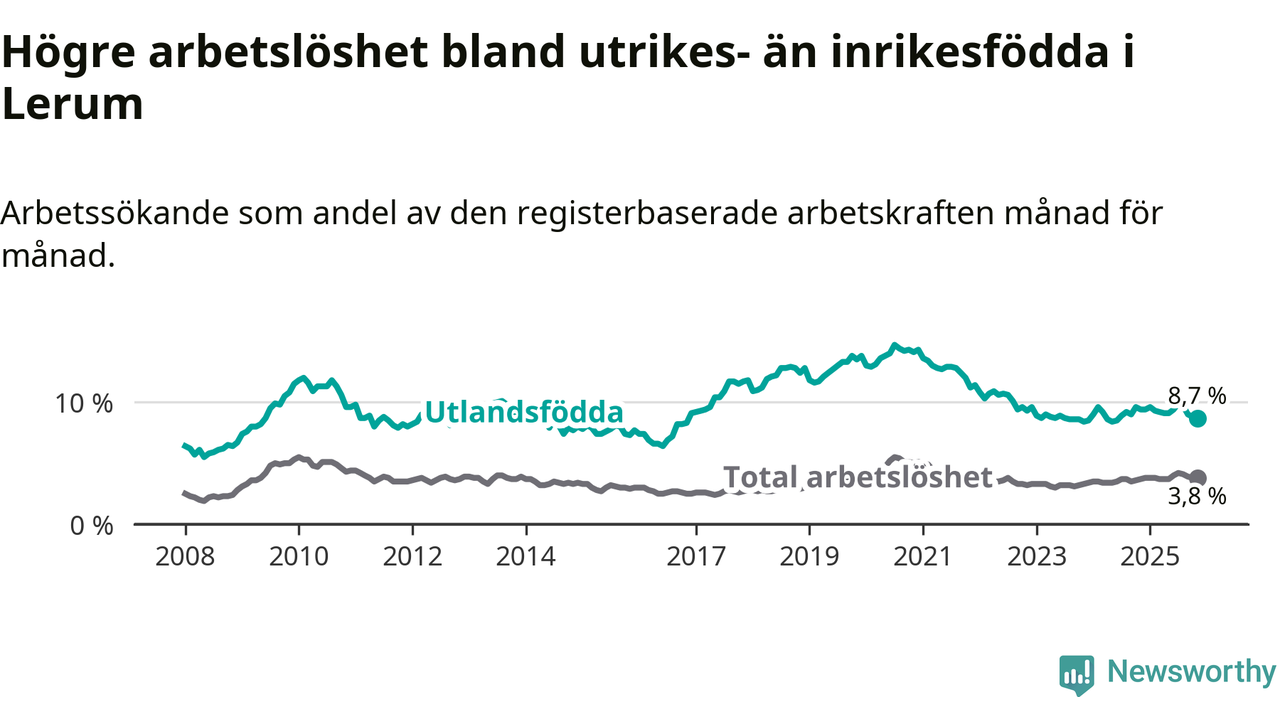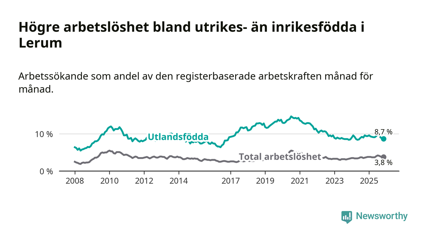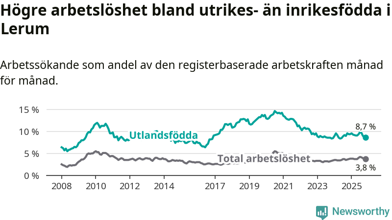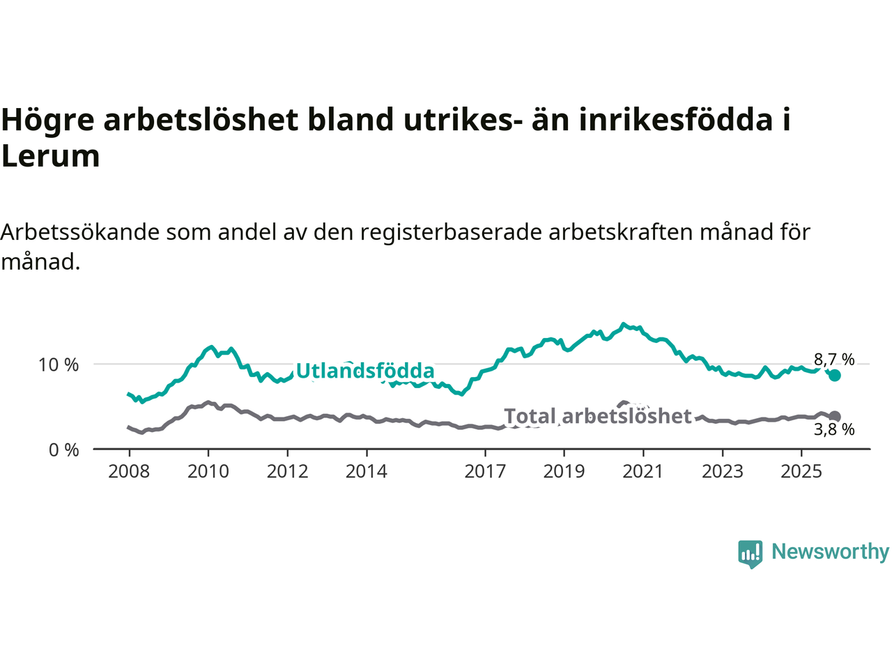 Arbetslösheten bland utlandsfödda var 8,7 procent i Lerum under november månad, motsvarande 266 av 3 057 personer. Det är 0,7 procentenheter färre än vid samma tidpunkt i fjol (−19 om man räknar personer).