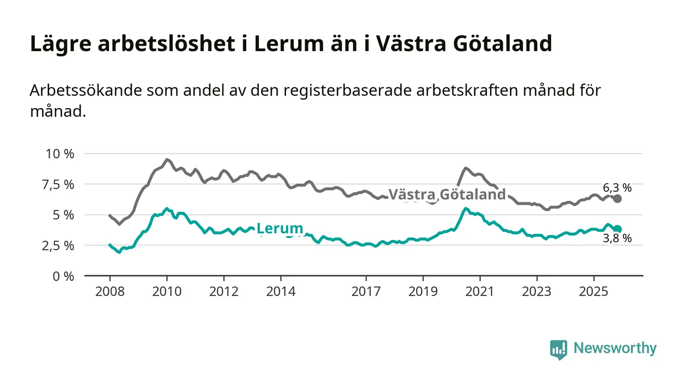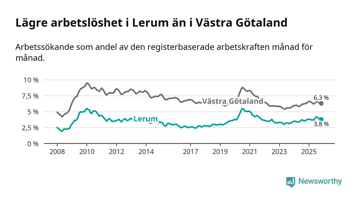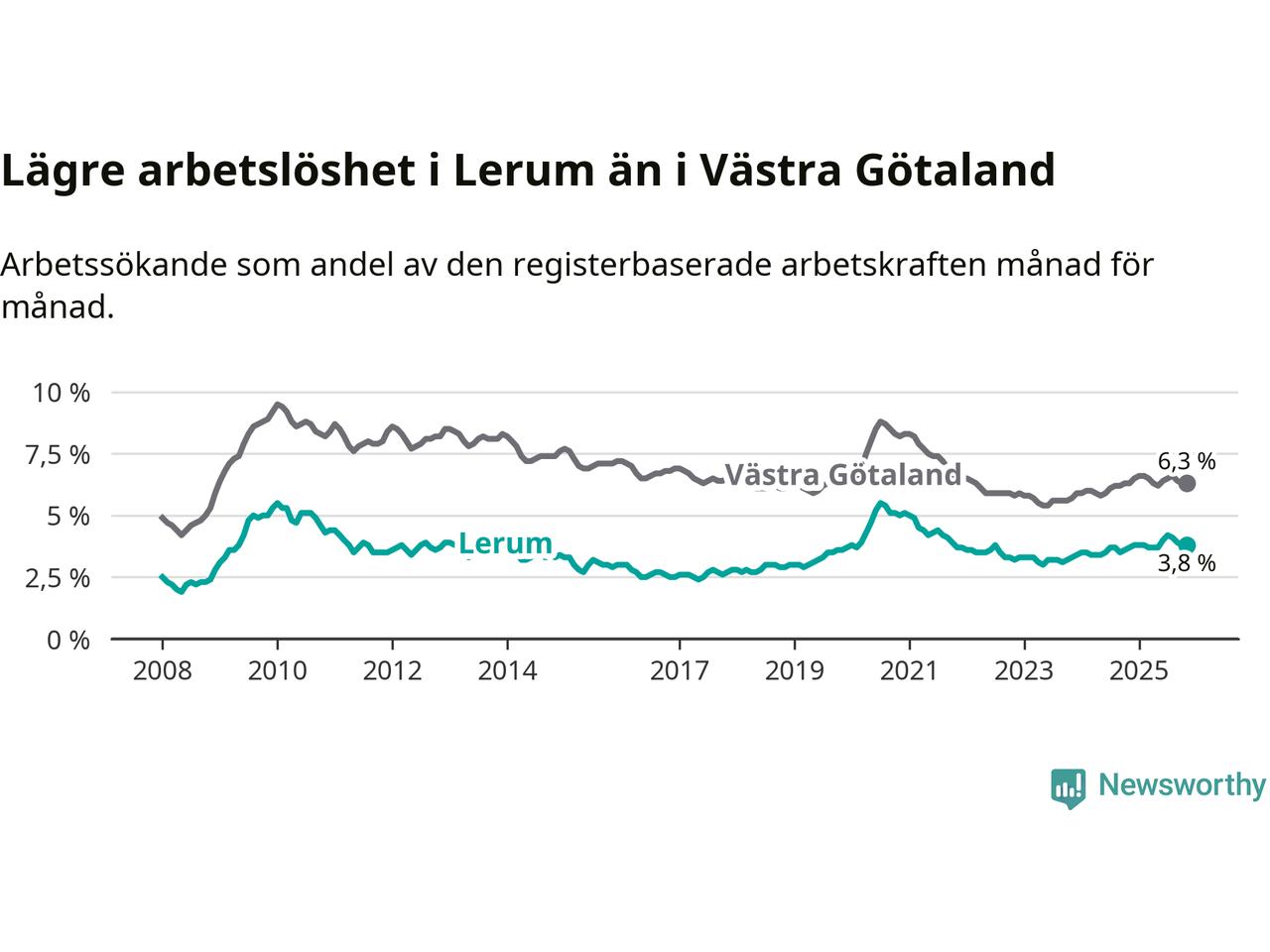 Även om arbetslösheten i Lerum alltså ökar, så ligger den fortfarande under snittet i hela Västra Götalands län (3,8 procent i kommunen, jämfört med 6,3 procent i hela länet). Öckerö har den lägsta arbetslösheten i länet (2,9 procent), medan Gullspång har den högsta (8,6 procent). För att Lerum skulle komma ner i samma arbetslöshetsnivå som Öckerö skulle 196 personer behöva sysselsättas.