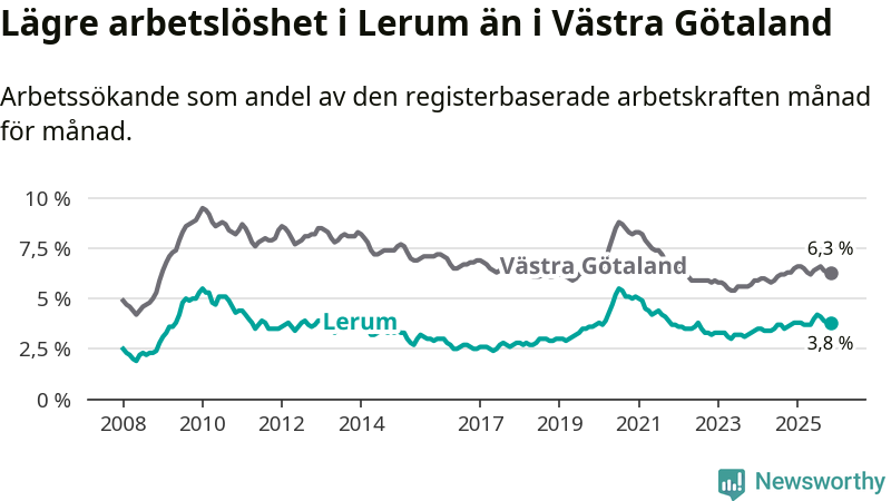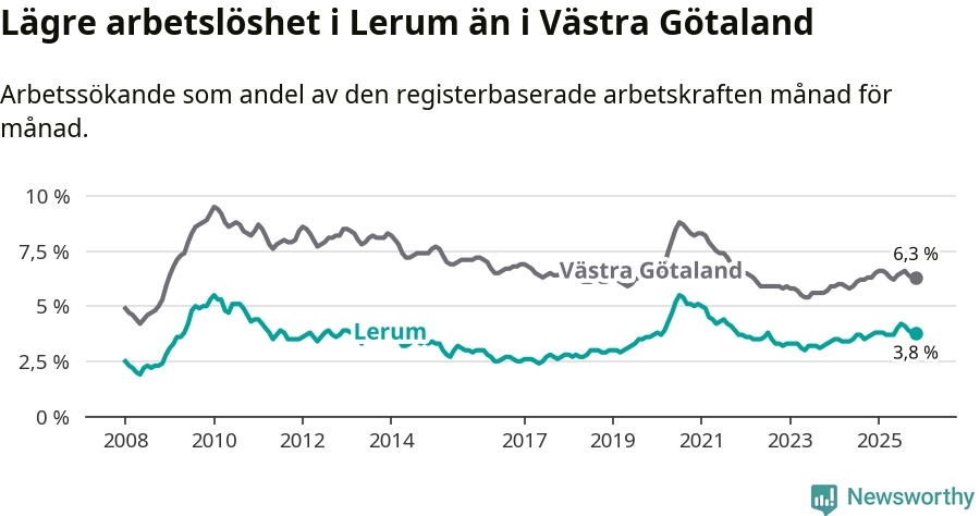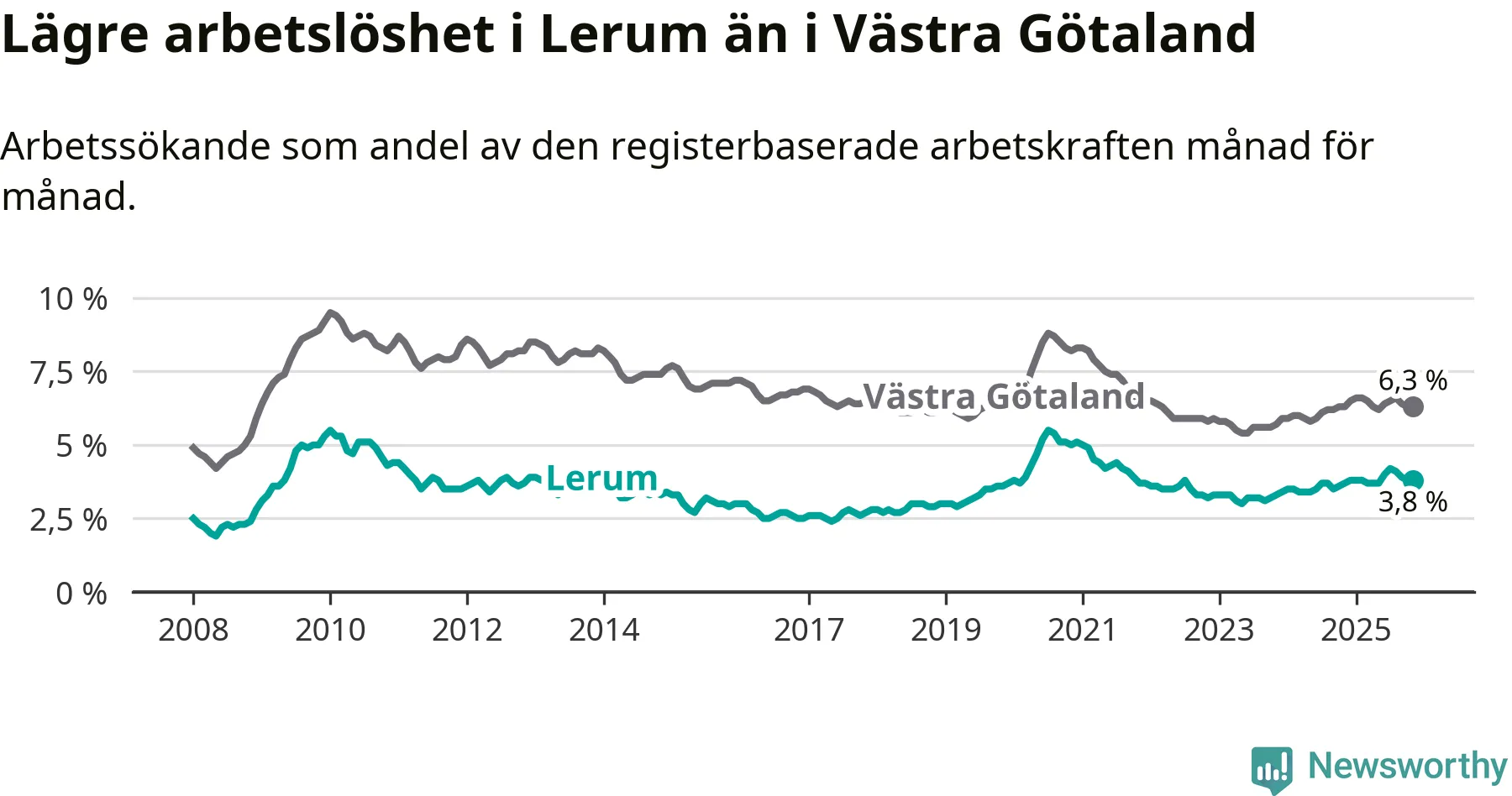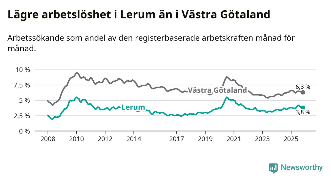 Även om arbetslösheten i Lerum alltså ökar, så ligger den fortfarande under snittet i hela Västra Götalands län (3,8 procent i kommunen, jämfört med 6,3 procent i hela länet). Öckerö har den lägsta arbetslösheten i länet (2,9 procent), medan Gullspång har den högsta (8,6 procent). För att Lerum skulle komma ner i samma arbetslöshetsnivå som Öckerö skulle 196 personer behöva sysselsättas.