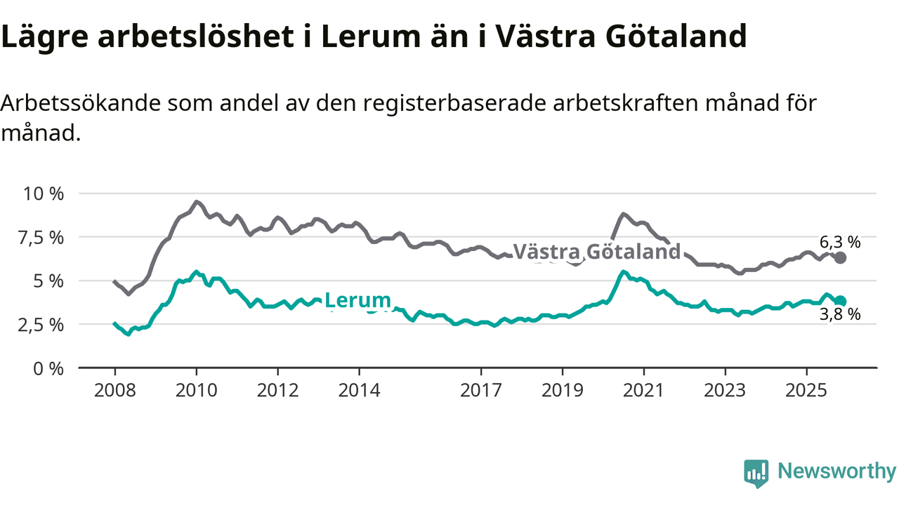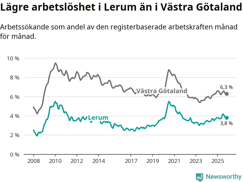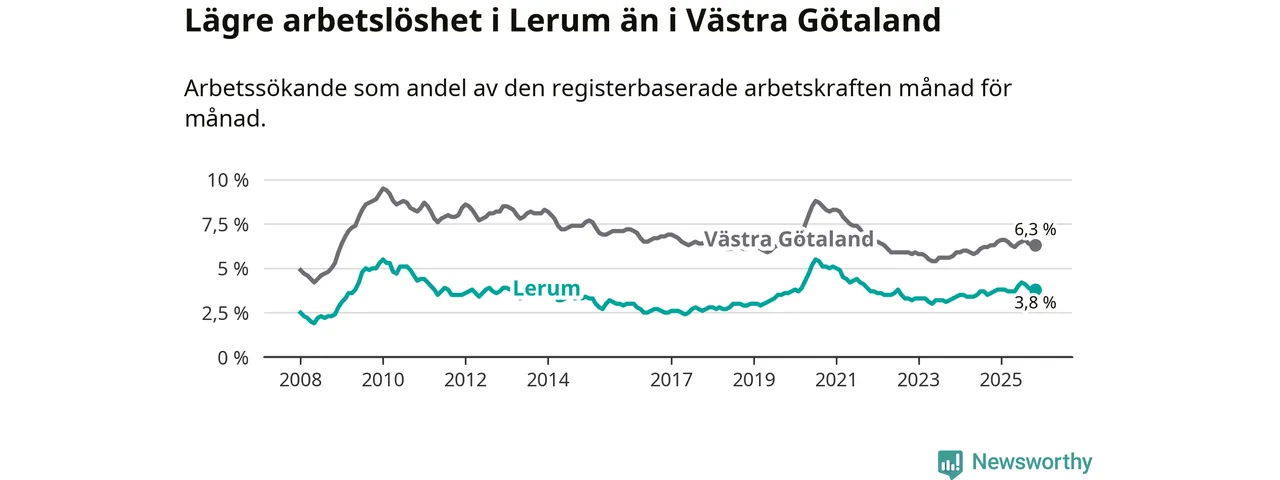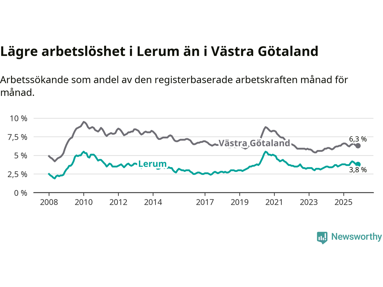 Under november månad rapporterade Lerums kommun en total arbetslöshet på 3,8 procent. Det är en ökning jämfört med samma tidpunkt i fjol (+0,1 procentenheter). I Västra Götalands län däremot står arbetslösheten stilla.