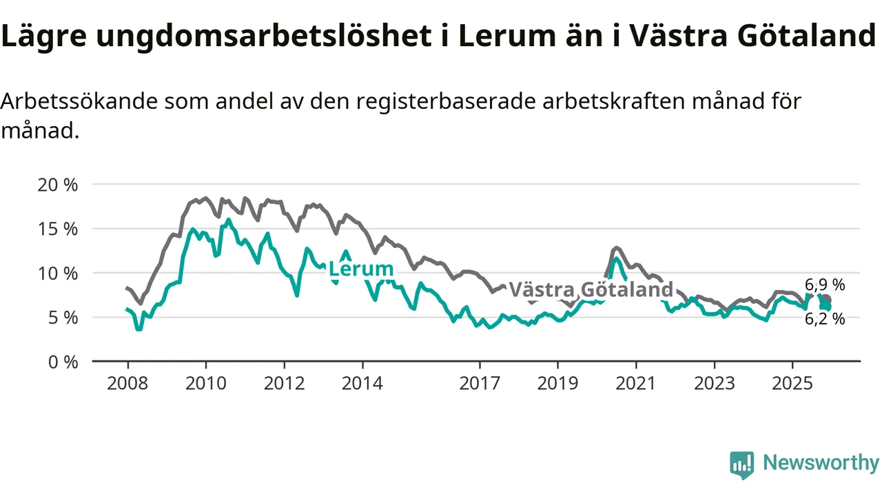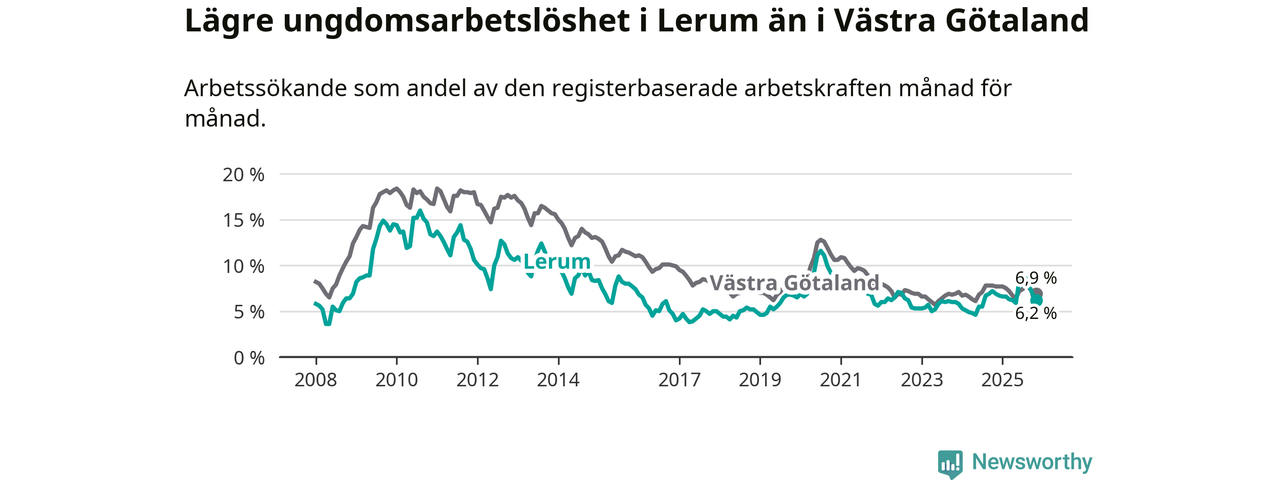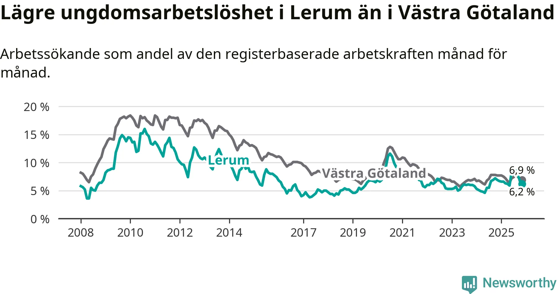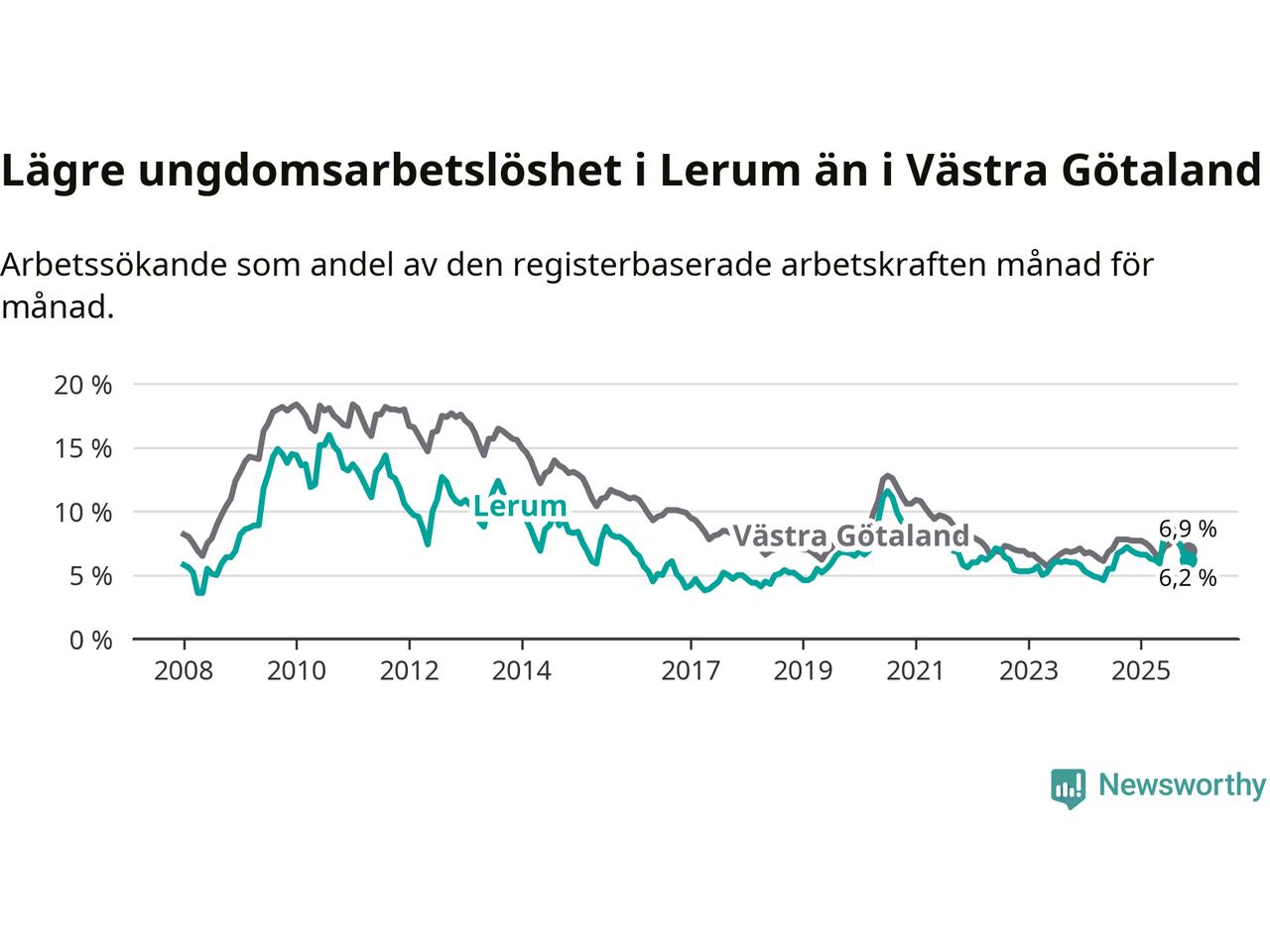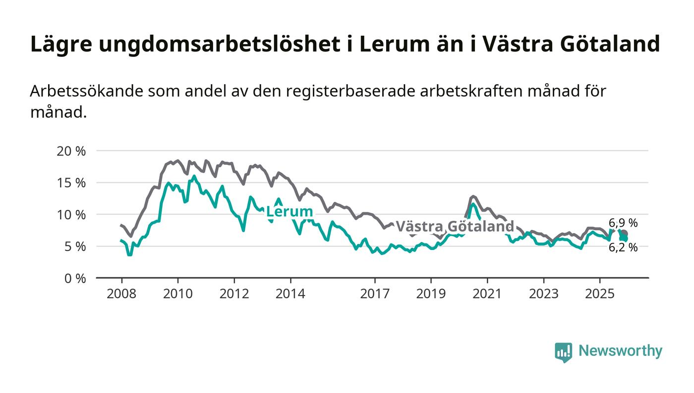 Precis som den totala arbetslösheten ligger ungdomsarbetslösheten i Lerum lägre än i Västra Götaland som helhet. Skillnaden mellan kommunen och länet är 0,7 procentenheter.