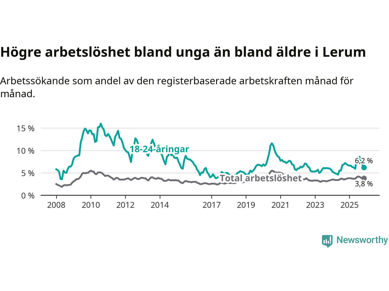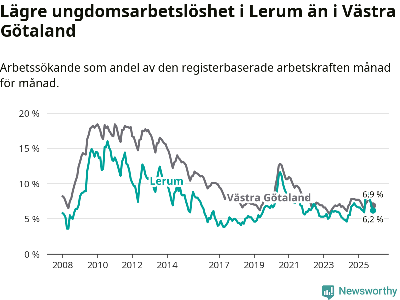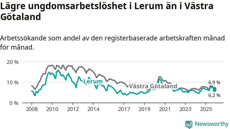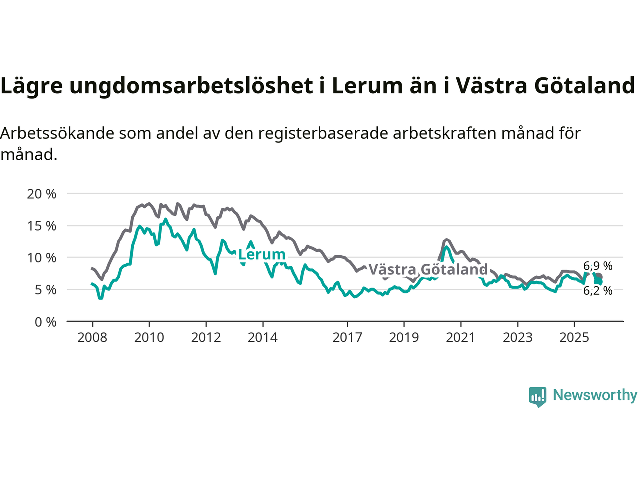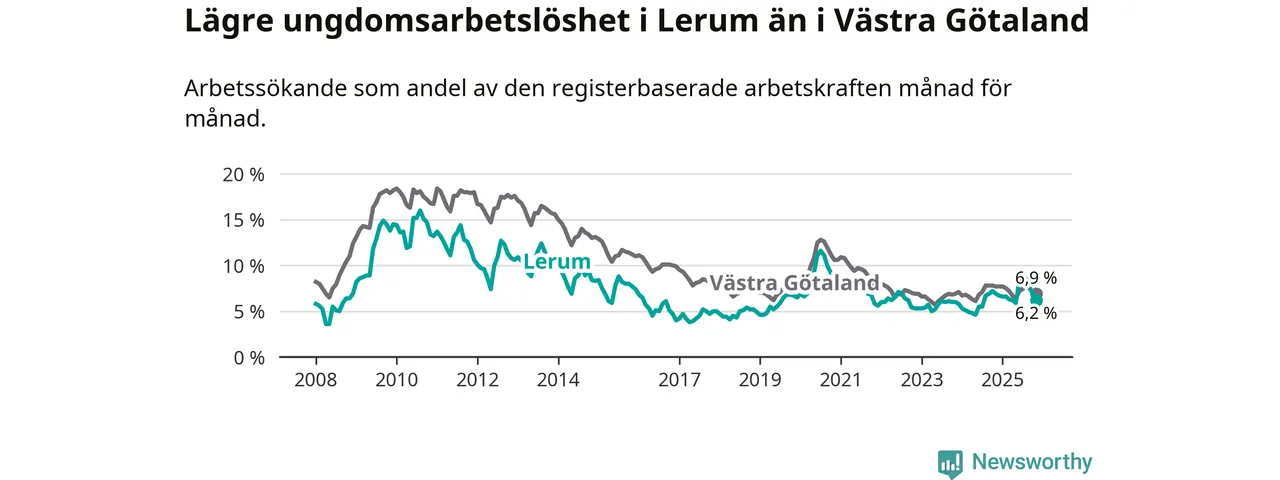 Precis som den totala arbetslösheten ligger ungdomsarbetslösheten i Lerum lägre än i Västra Götaland som helhet. Skillnaden mellan kommunen och länet är 0,7 procentenheter.