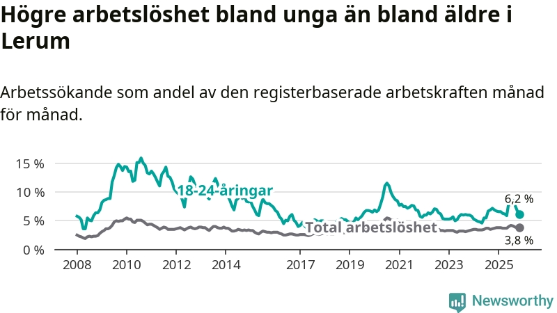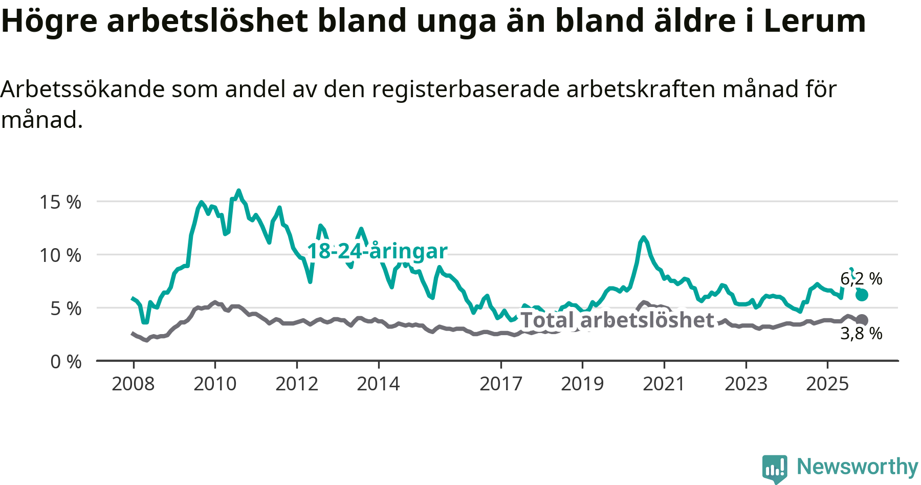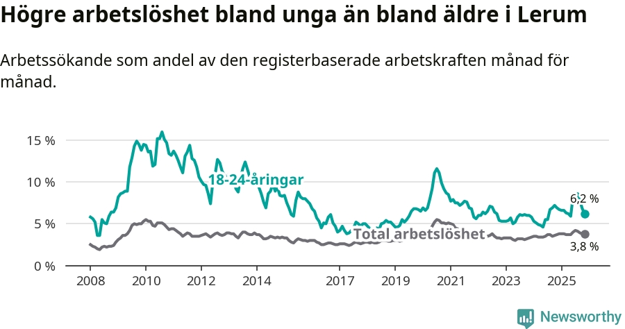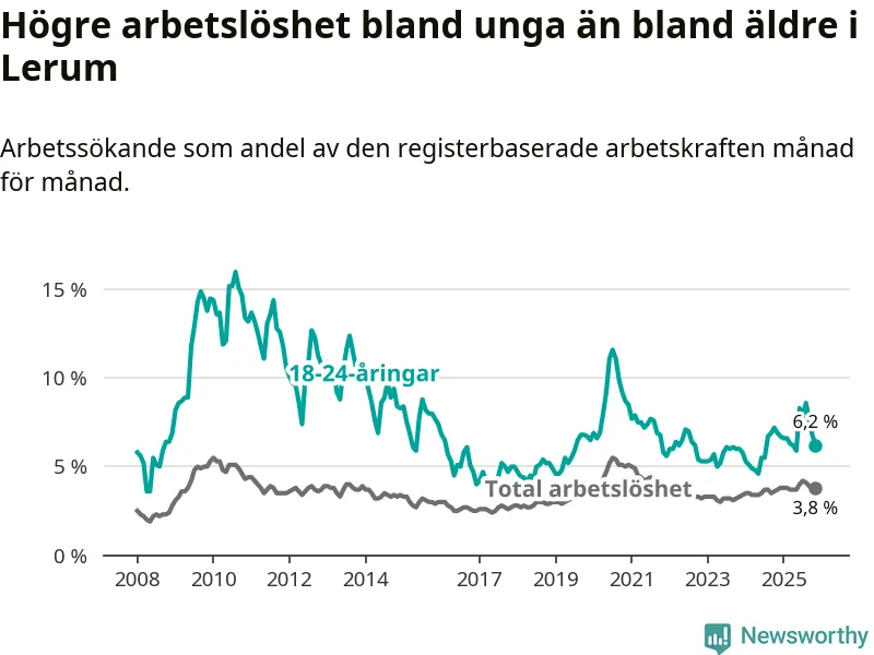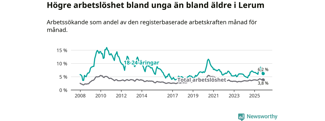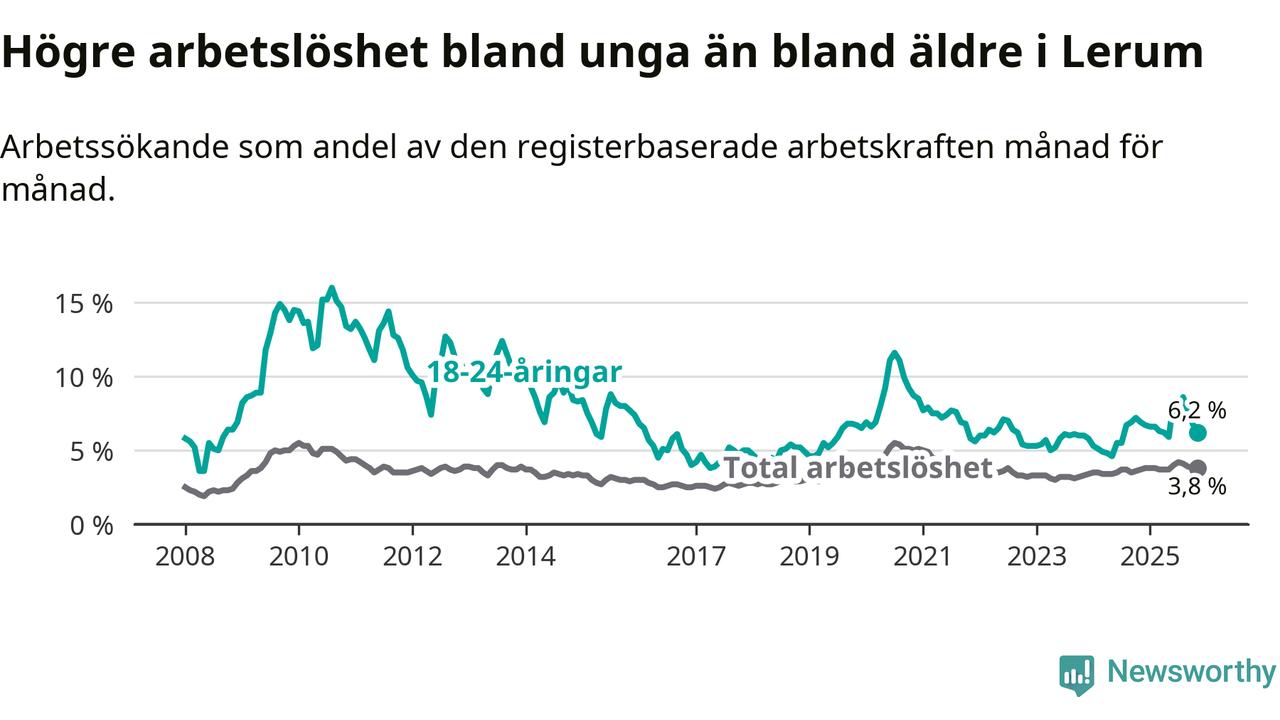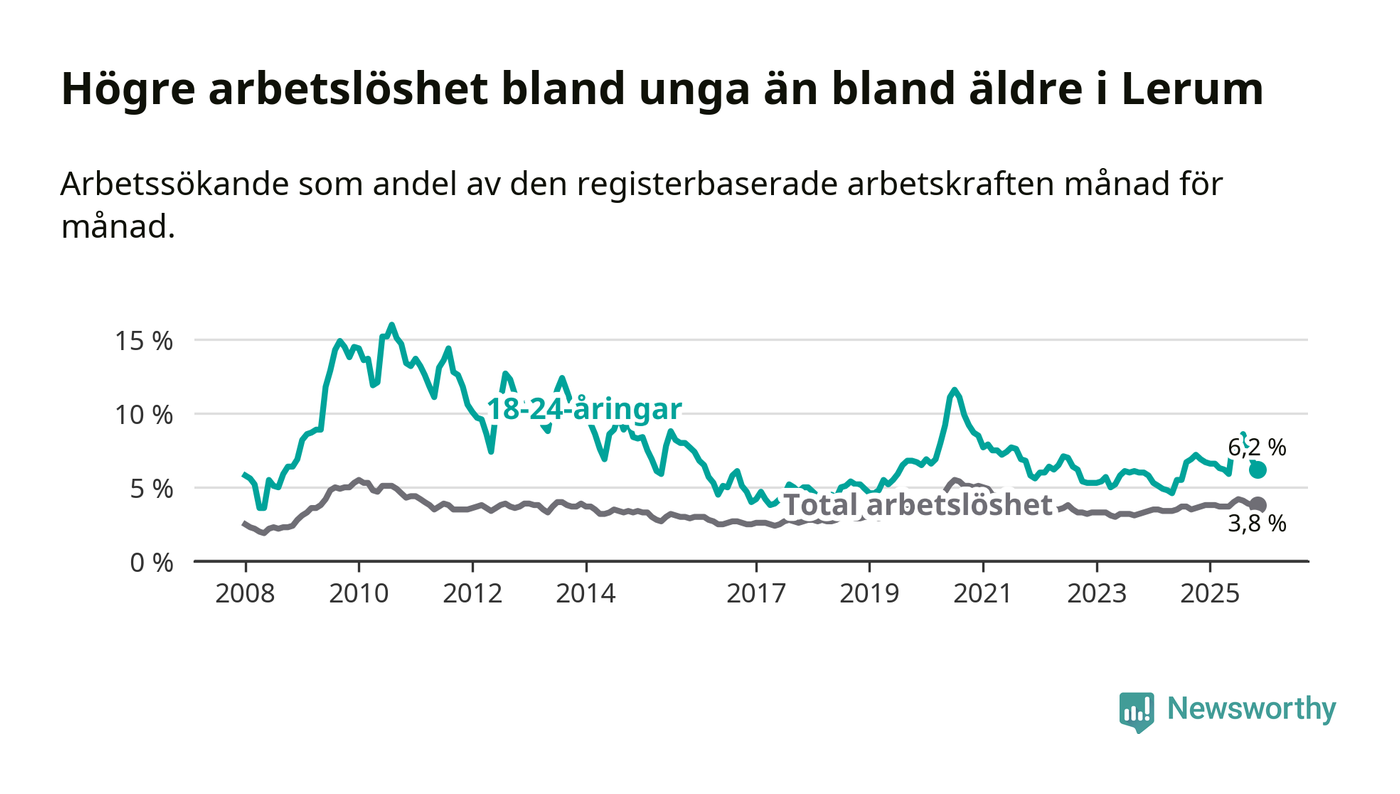 Precis som den totala arbetslösheten ligger ungdomsarbetslösheten i Lerum lägre än i Västra Götaland som helhet. Skillnaden mellan kommunen och länet är 0,7 procentenheter.